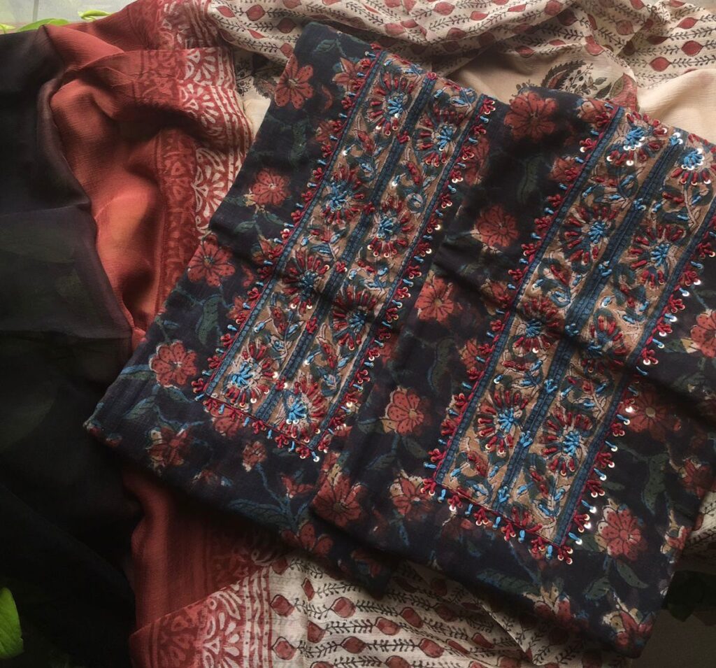Are you looking out for Beautiful & Unique Designer Cottons to add to your wardrobe ? These Hand block printed Kutch worked cottons are the perfect choice! Pure cotton top with authentic Kutch work (does not need lining ) cotton printed bottom & hand block printed chiffon duppattas