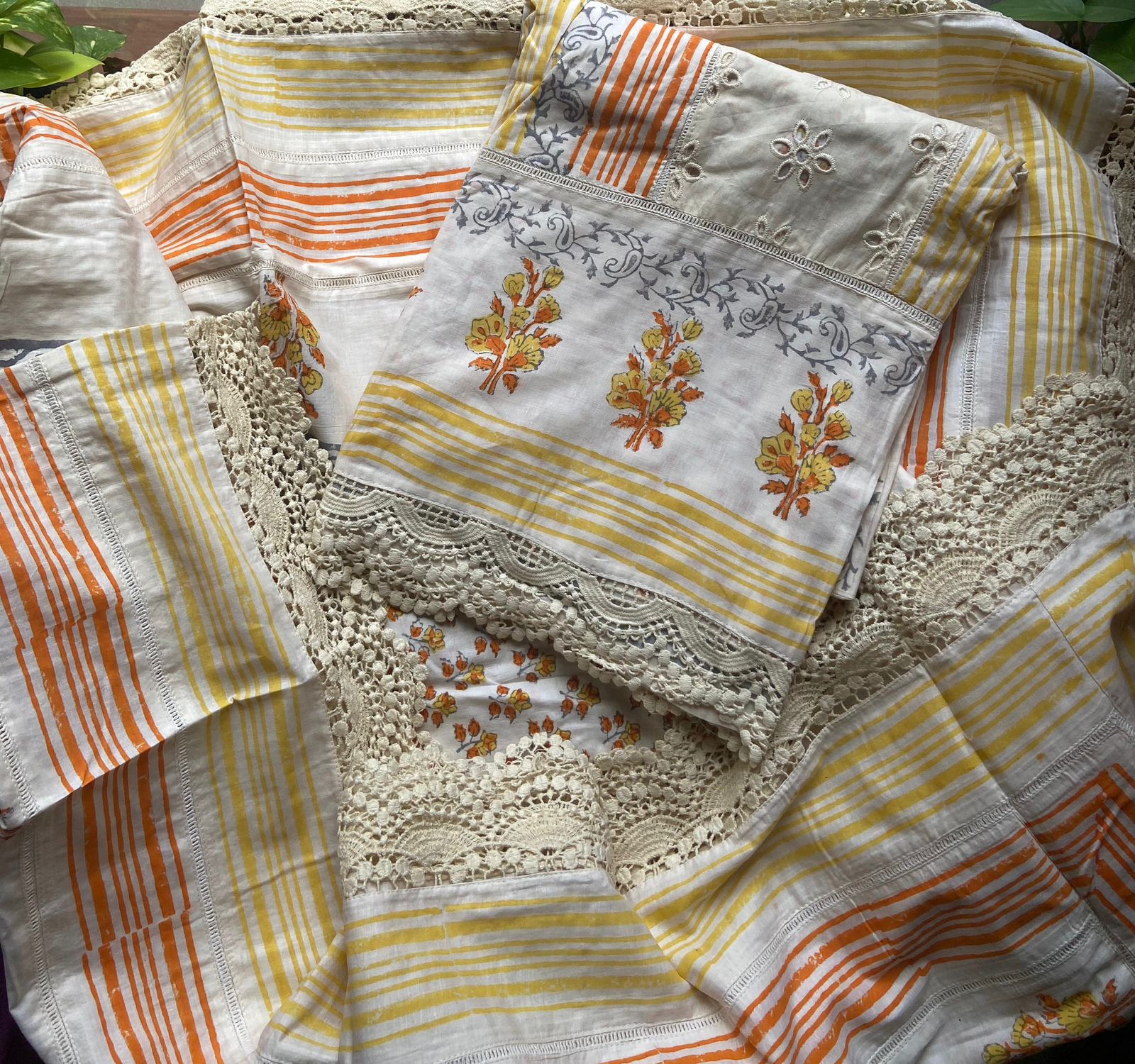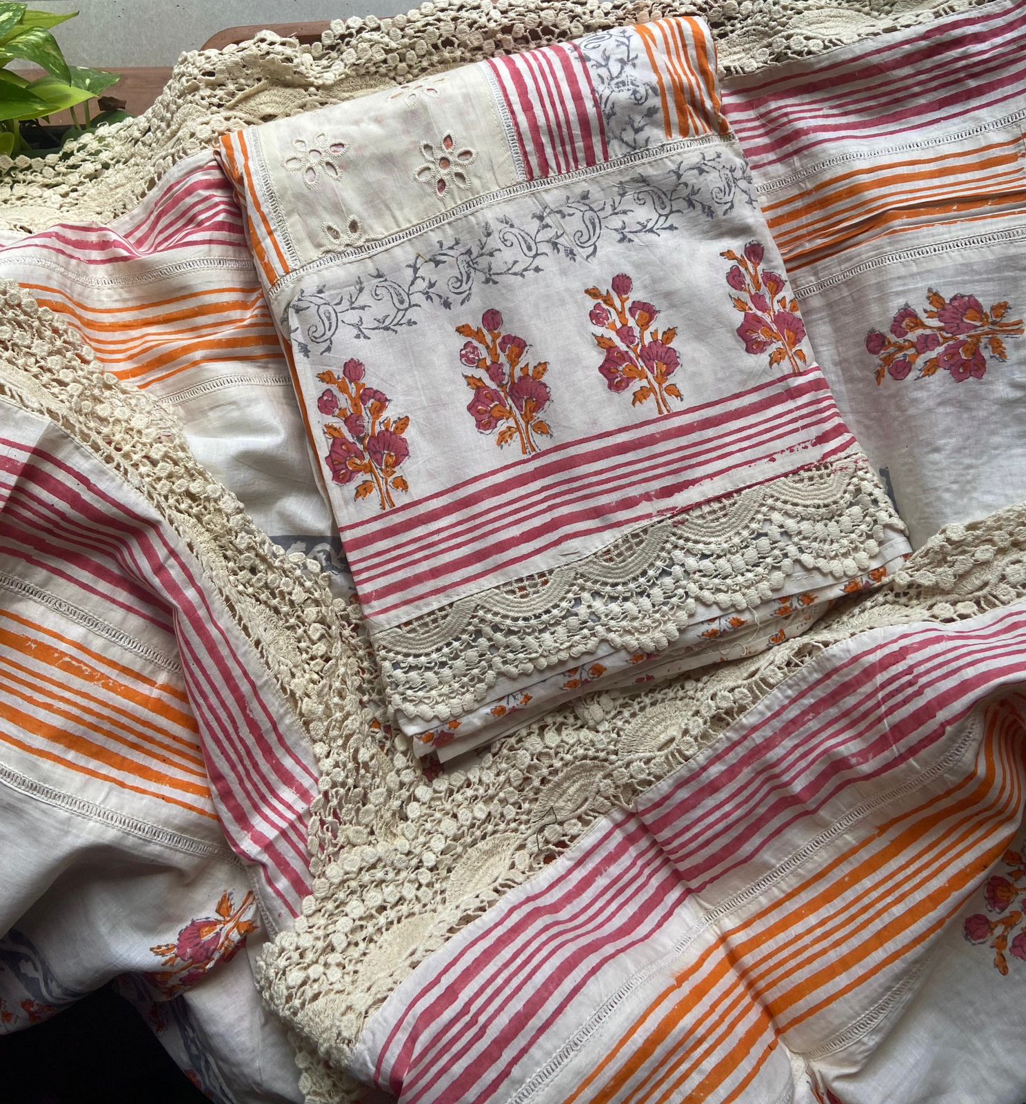 A beautiful collection of Pure cotton top with block prints, Cutwork and French lace detailing , cotton printed bottom and mal Duppatta with French lace borders