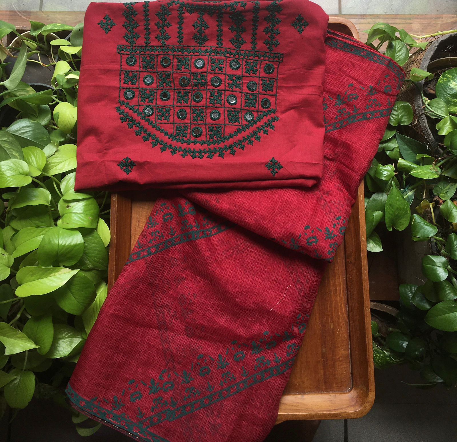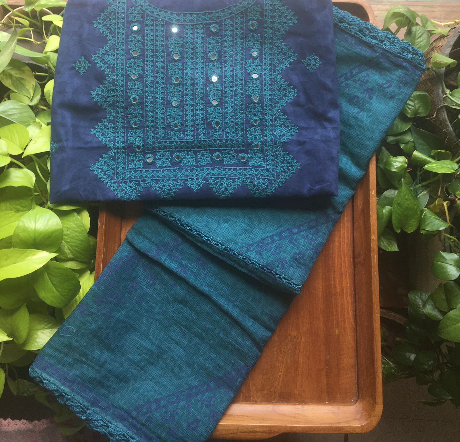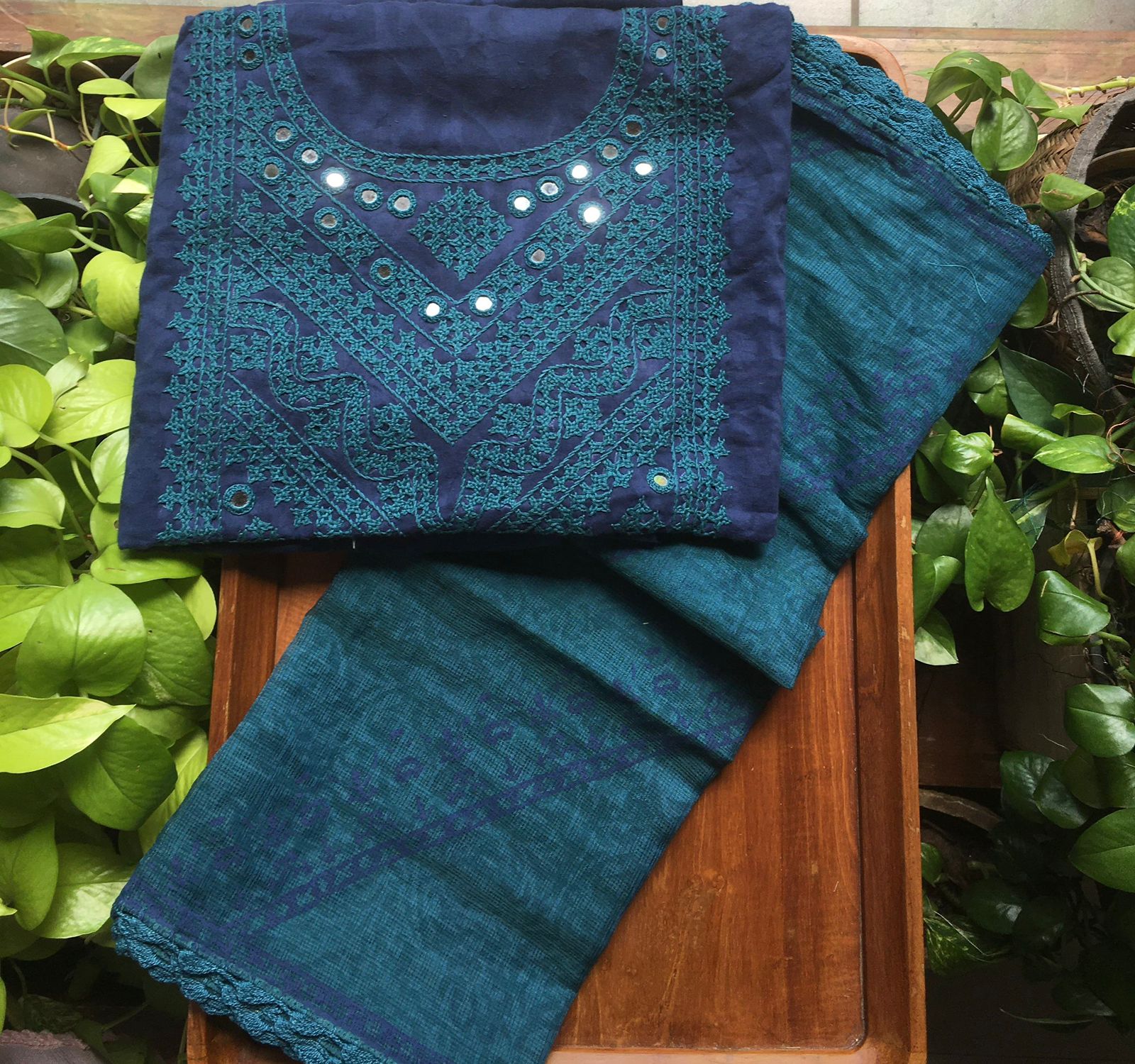 HomeSalwar Set A beautiful collection of pure cotton top with exquisite authentic Kutch hand embroidery , cotton bottom & Kota silk Duppatta with block prints !!! Limited pieces available!!!Hurry & order these before we run out of them! Perfect choice for gifting your dear ones this festive season