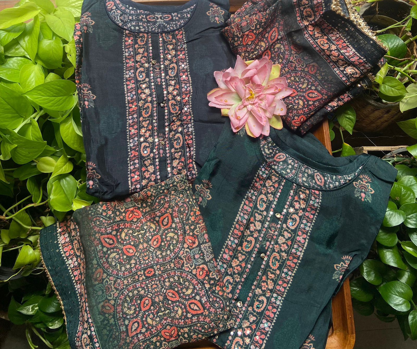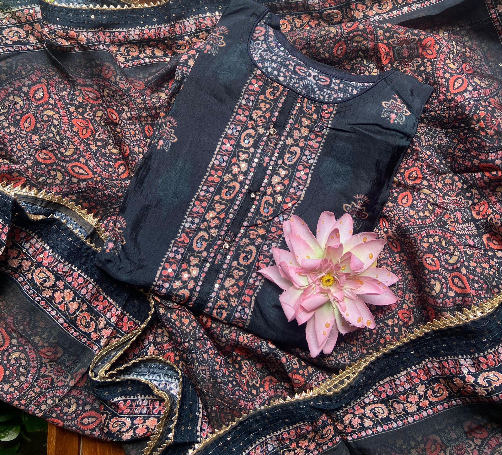 A beautiful collection of Pure crepe silk top with floral block prints , santoon bottom and beautiful designer Duppatta
