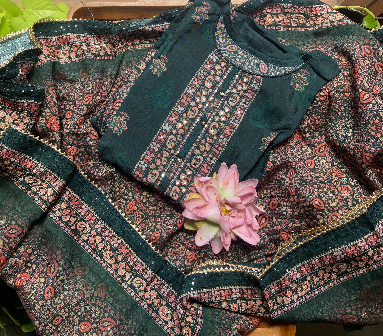 A beautiful collection of Pure cotton top with block prints , cotton printed bottom & chiffon Duppatta