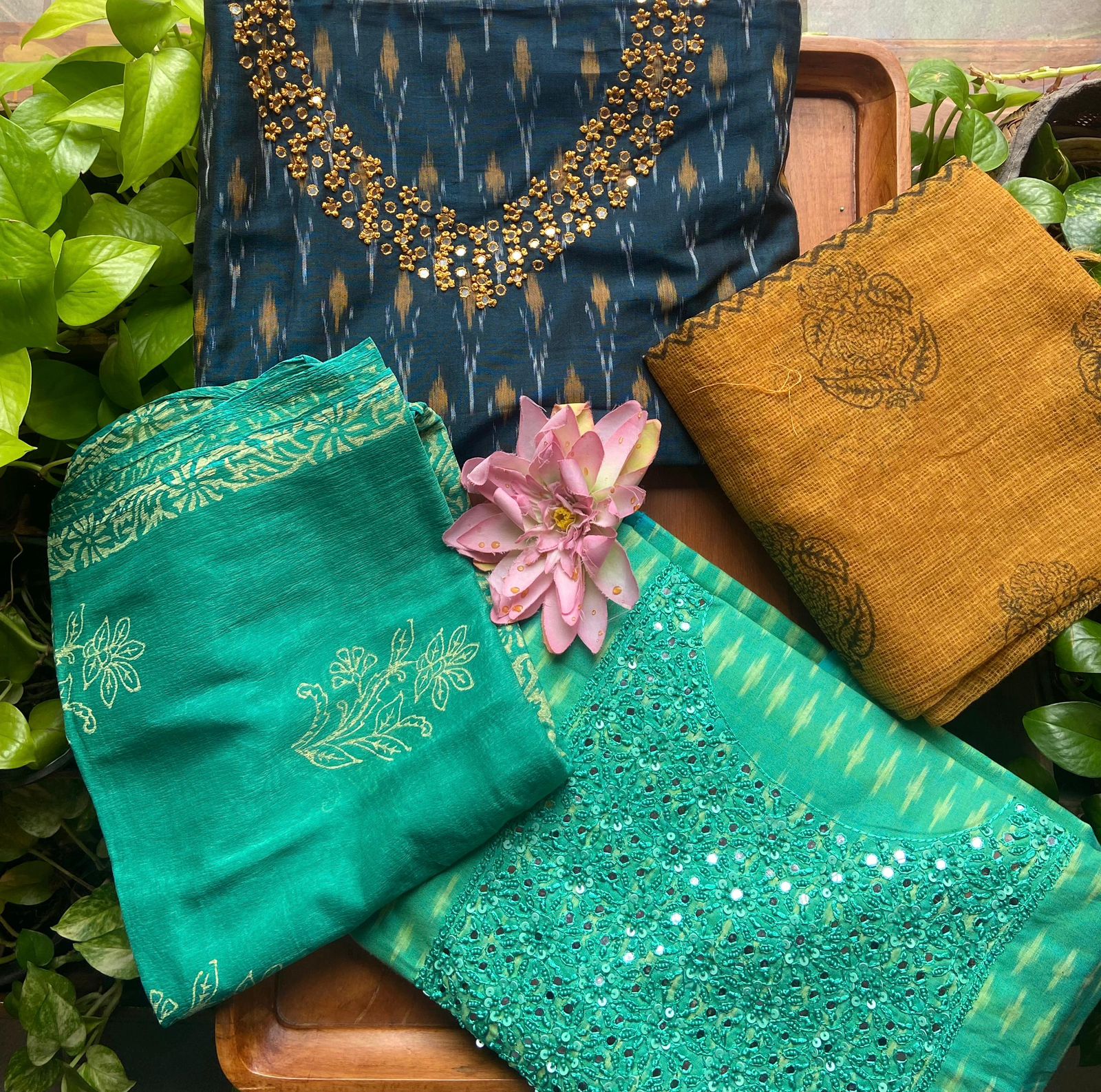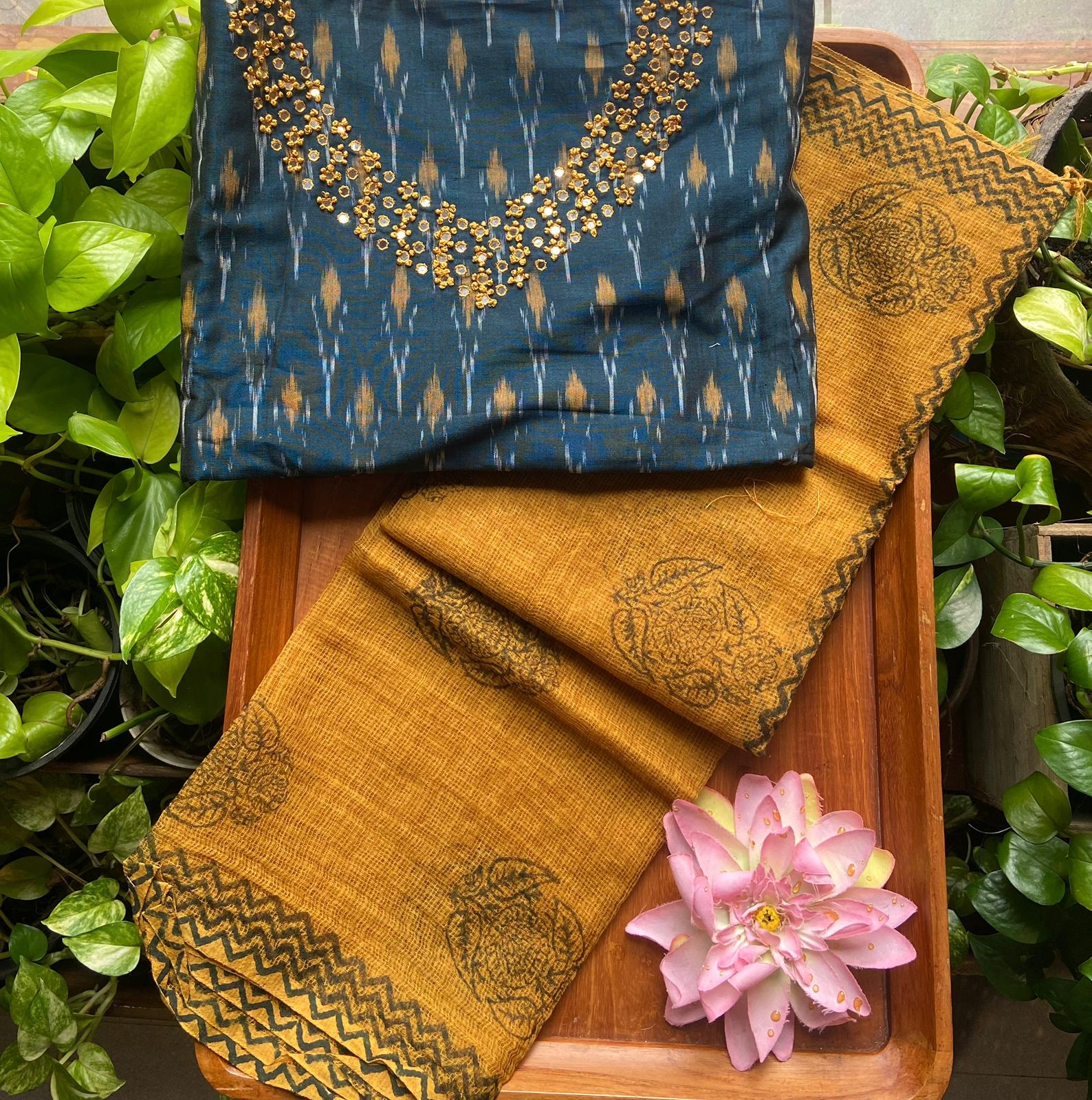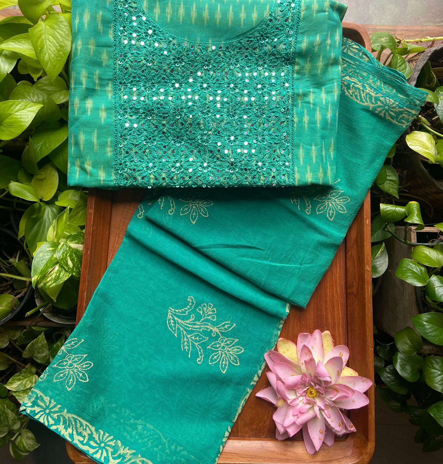 A beautiful collection of Pure Double Ikkat Silk top with intricate hand embroidery & mirror work on yoke, cotton silk botton & chiffon /kota silk Duppatta