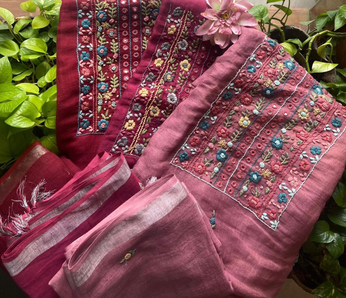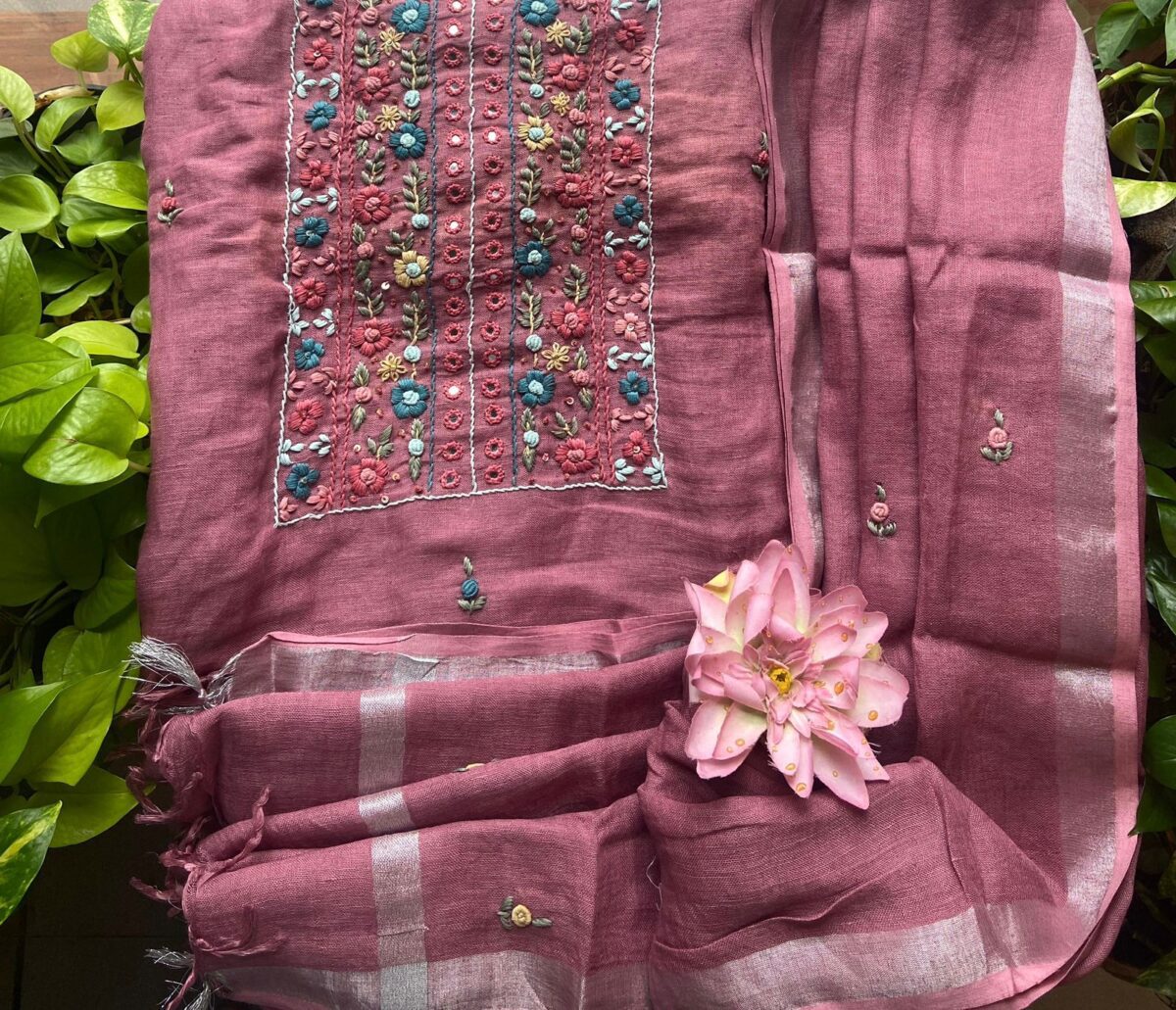A stunning collection in pure Linen top and duppatta with exquisite hand embroidery featuring French knots ,Pearls ,beads n more & Santoon bottom