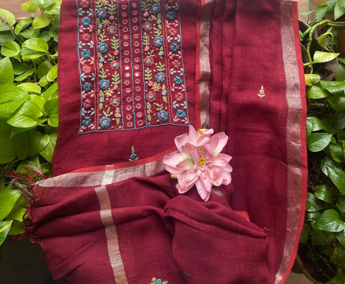 Beautiful Pure Linen cotton top with pretty tiny floral embroidery scattered throughout length of top , French lace detailing at neck and sleeve ends , cotton bottom and Mal Chandheri Duppatta with French lace borders ₹1,199.00