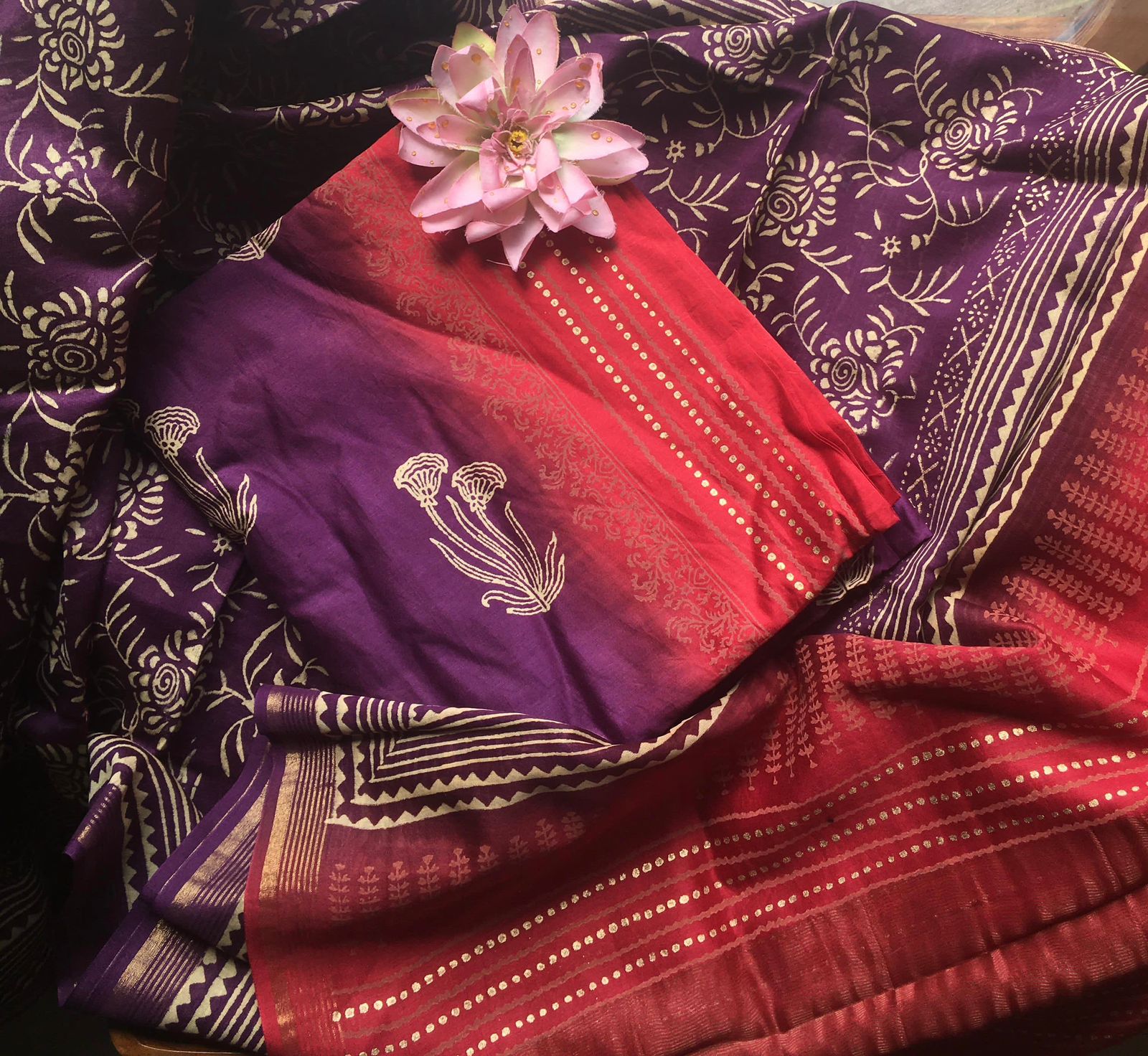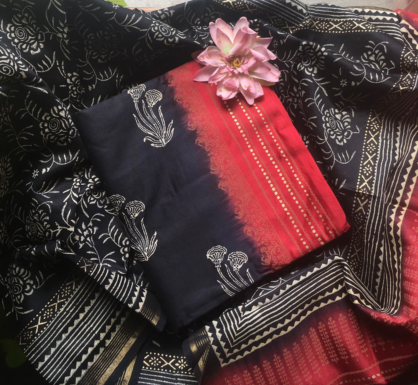 Presenting a stunning collection of Chandheri silk top & Duppatta with block prints & Kanta work detailing and santoon bottom