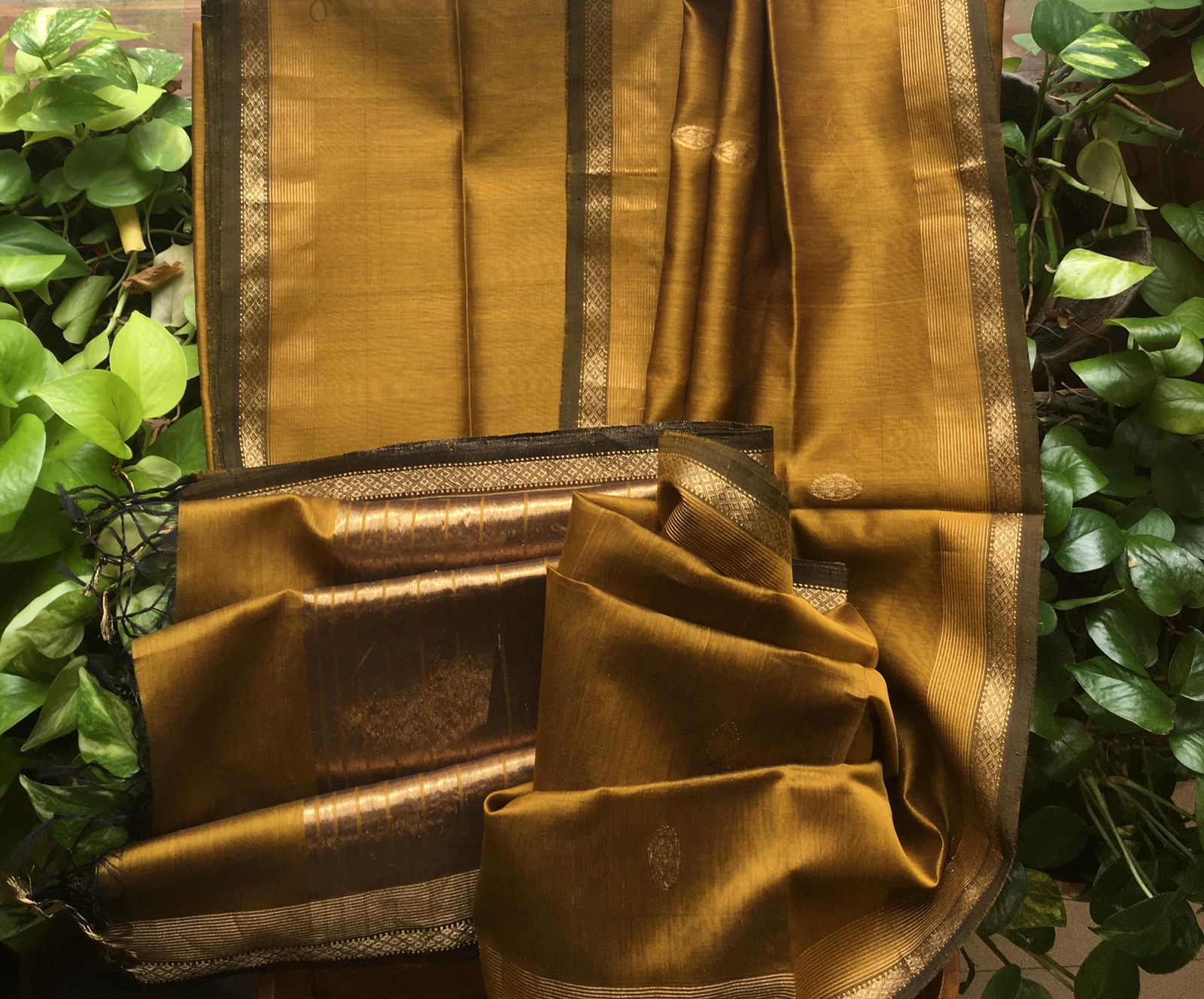 A beautiful collection of Tussar silk sarees with very elegant check weaving on entire saree & borders finished with beautiful cross stitch reminiscent floral embroidery. With blouse pure Benarasi silk