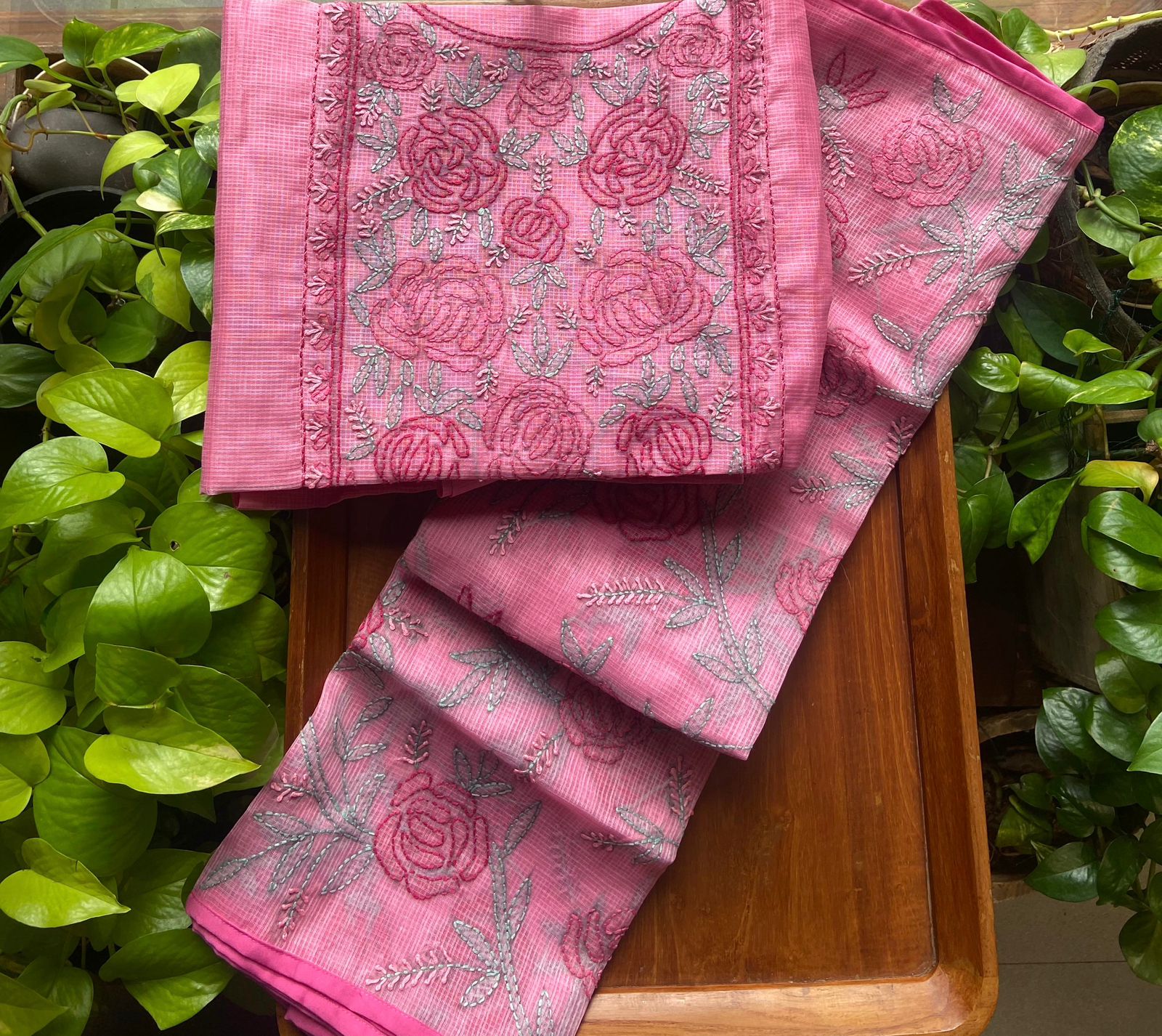 Presenting out Brand New Collection for Onam at a Special Price of ₹1499/- curated on Chiffon woth Cutwork and beautiful floral embroidery! Ethereal hues of Pink, Pearl Green, Ivory gold, Dusty pink & Jet black on Chiffon top and Duppatta with floral embroidery & Cutwork. The floral embroidery design is created to resemble pearl embroidery. Bottom is cotton silk