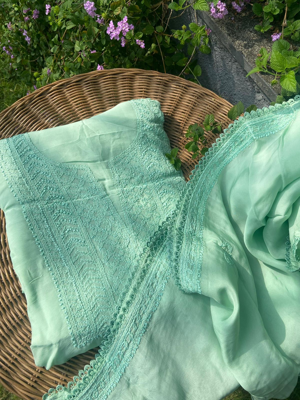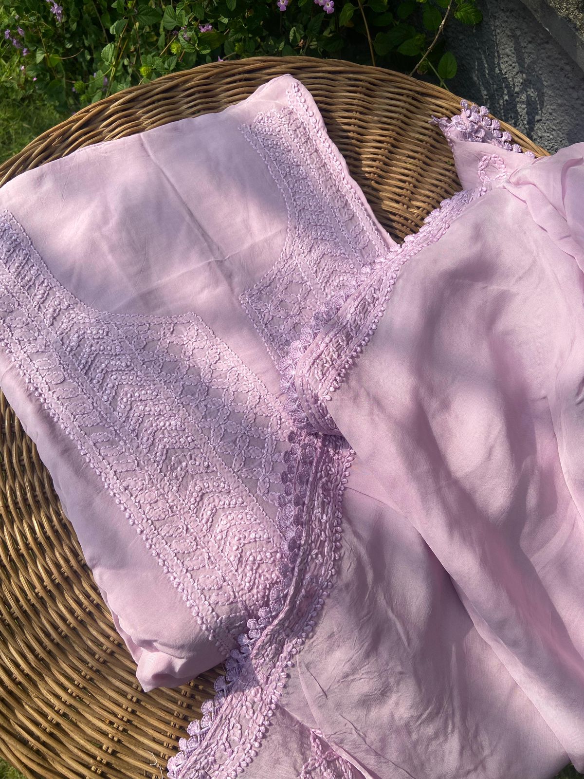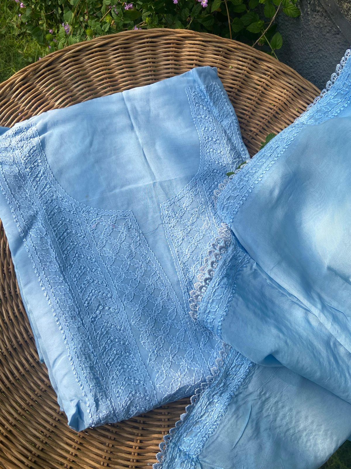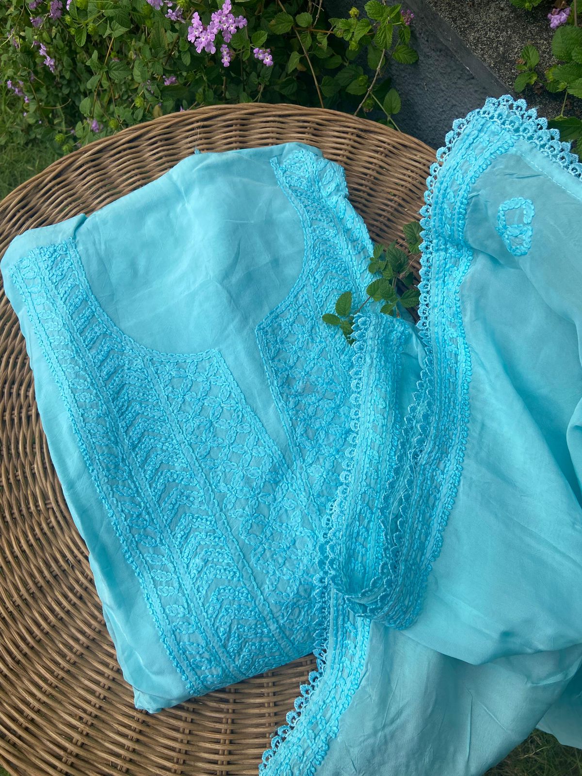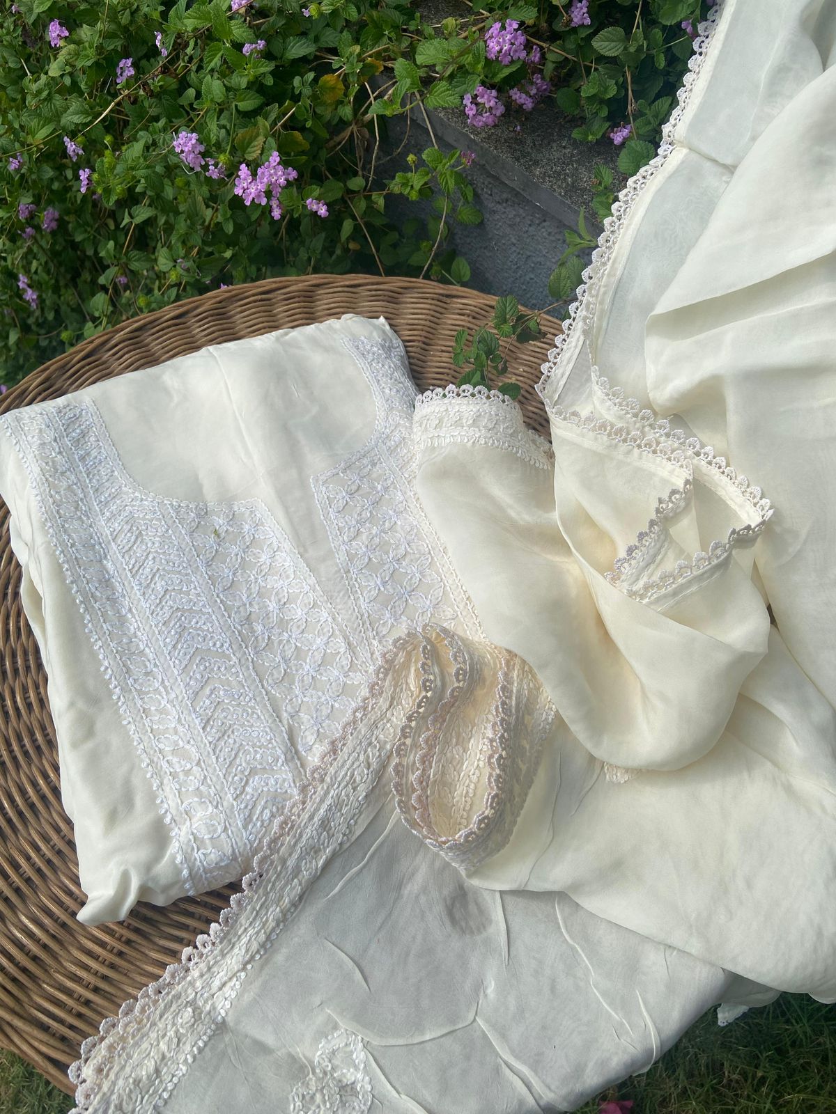 A beautiful collection of pure Silk Organza top & Duppatta with exquisite Chikankari hand embroidery throughout & pretty French lace detailing to add to the style quotient. Santoon bottom. Chikankari suits are a must have in ones wardrobe & is one style that never goes out of trend