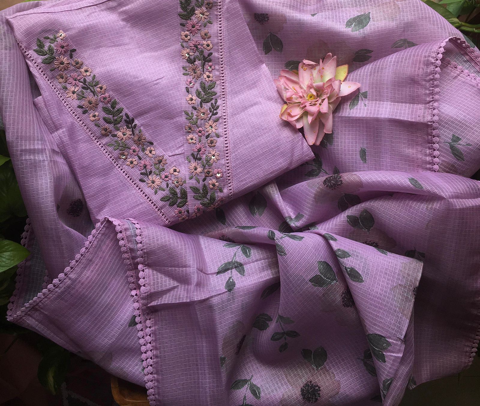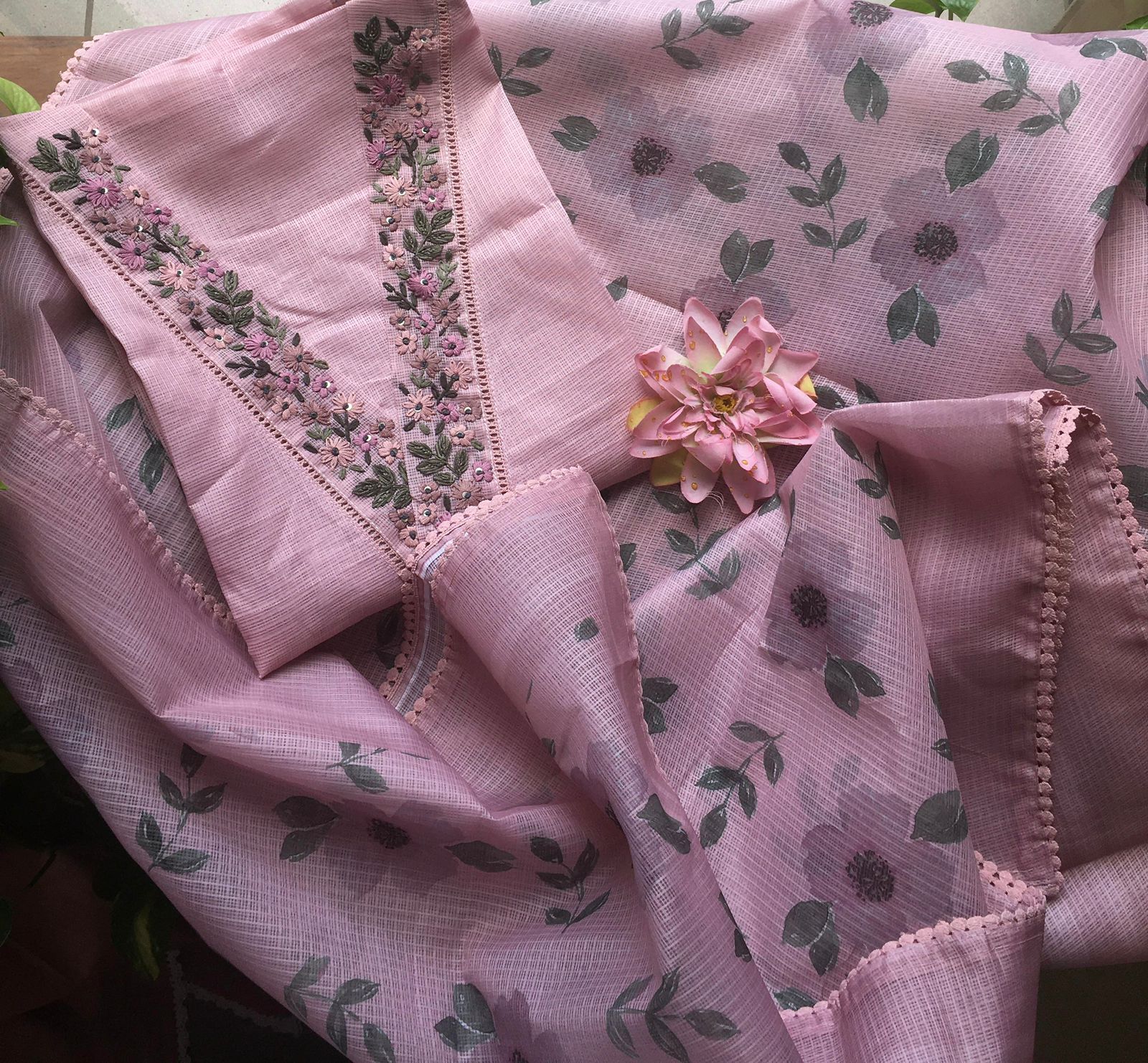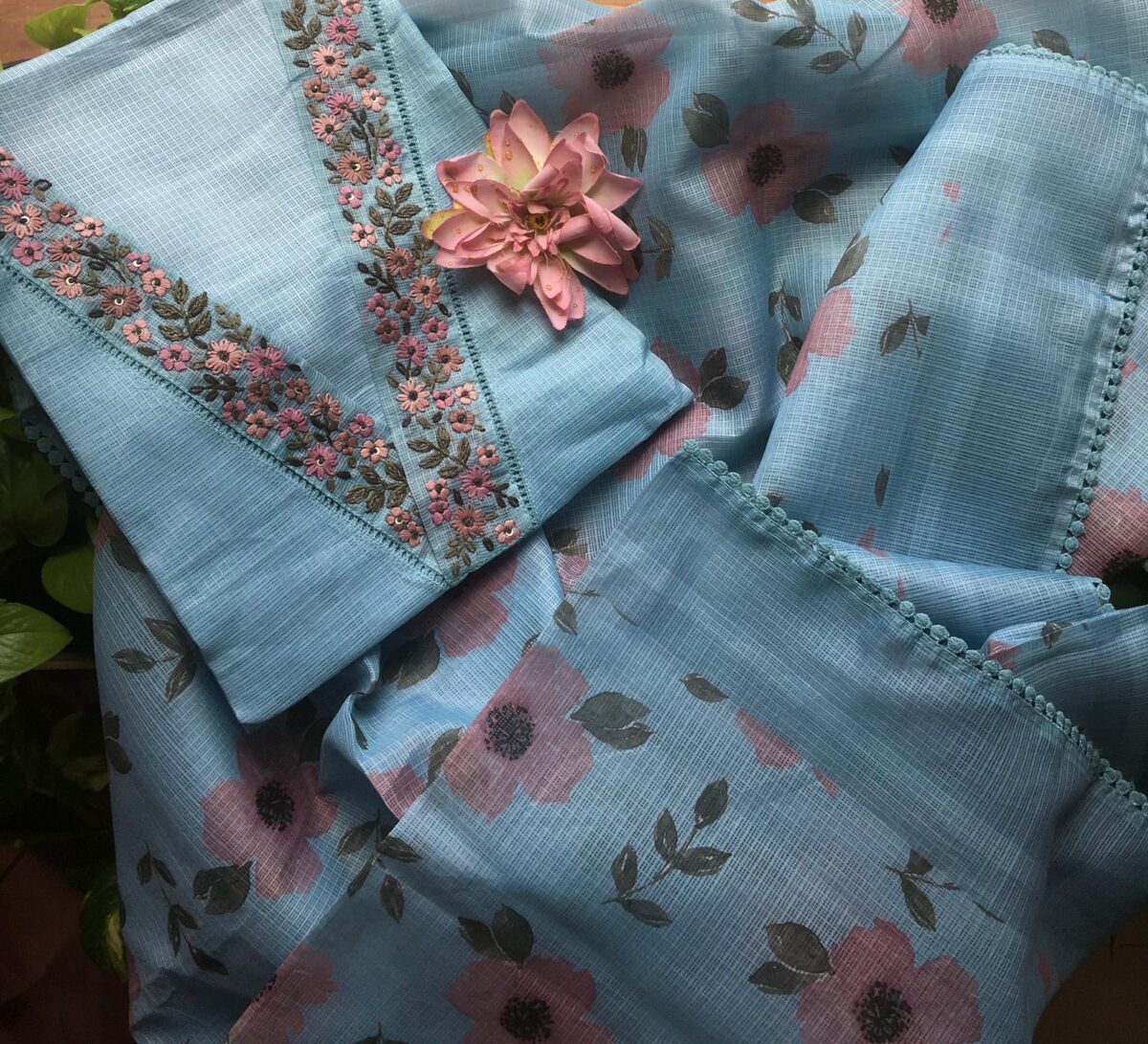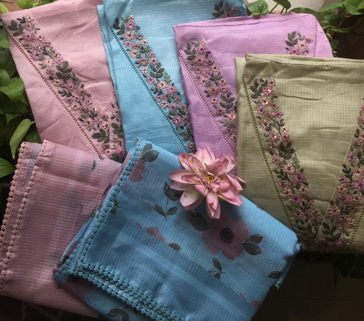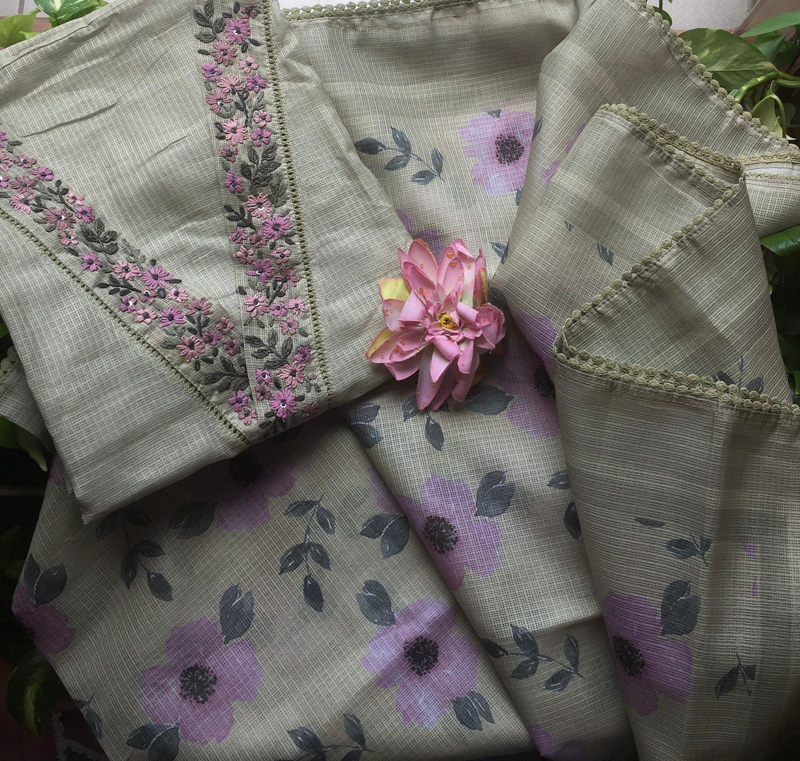 A beautiful collection of pure soft Kota silk top with pretty hand embroidery, cotton bottom & kota silk floral digital printed Duppatta