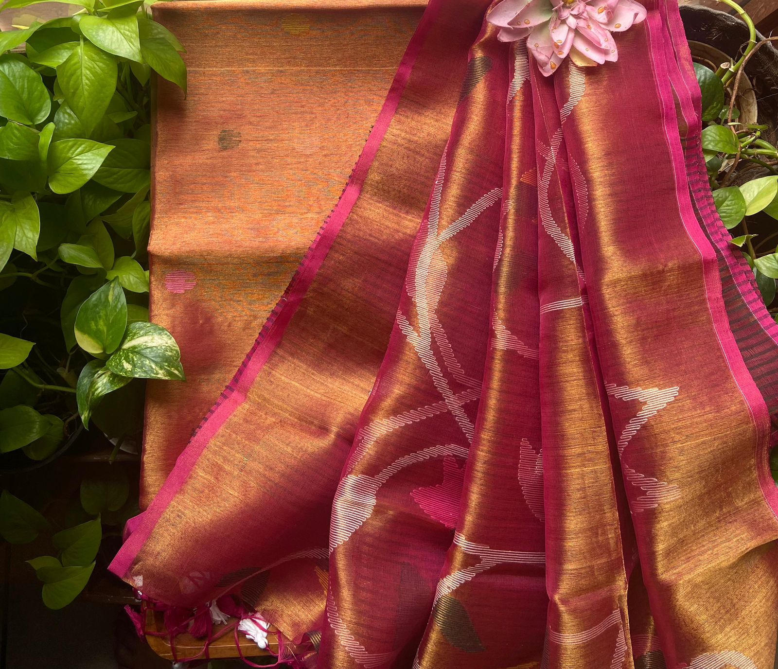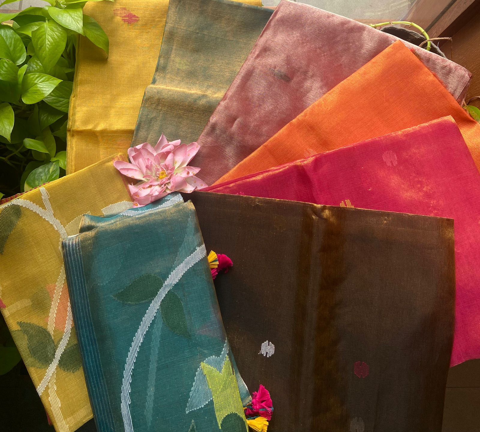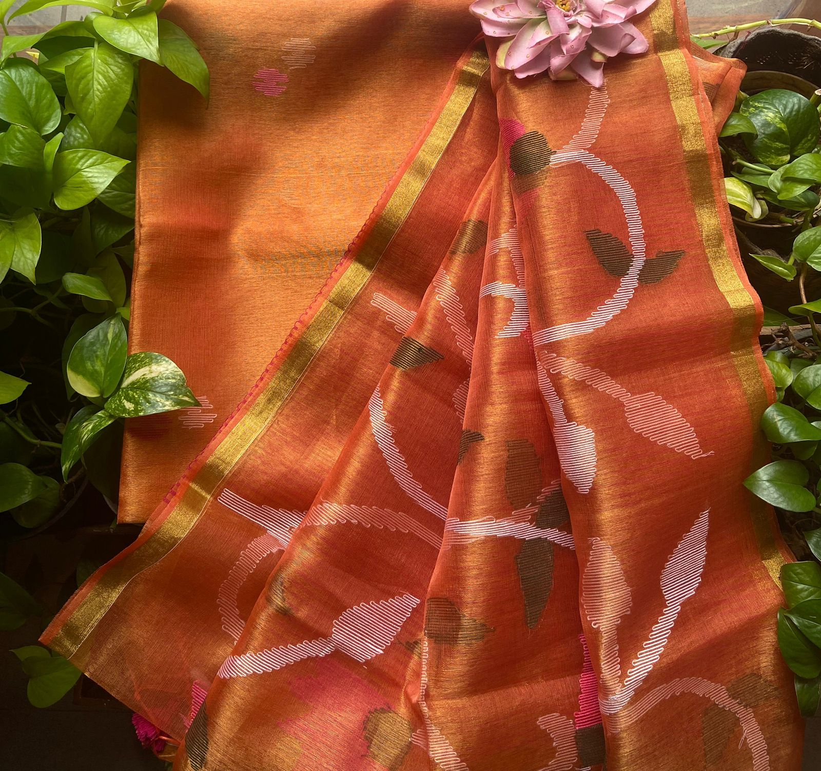 A beautiful collection of Tussar silk sarees with very elegant check weaving on entire saree & borders finished with beautiful cross stitch reminiscent floral embroidery. With blouse pure Benarasi silk