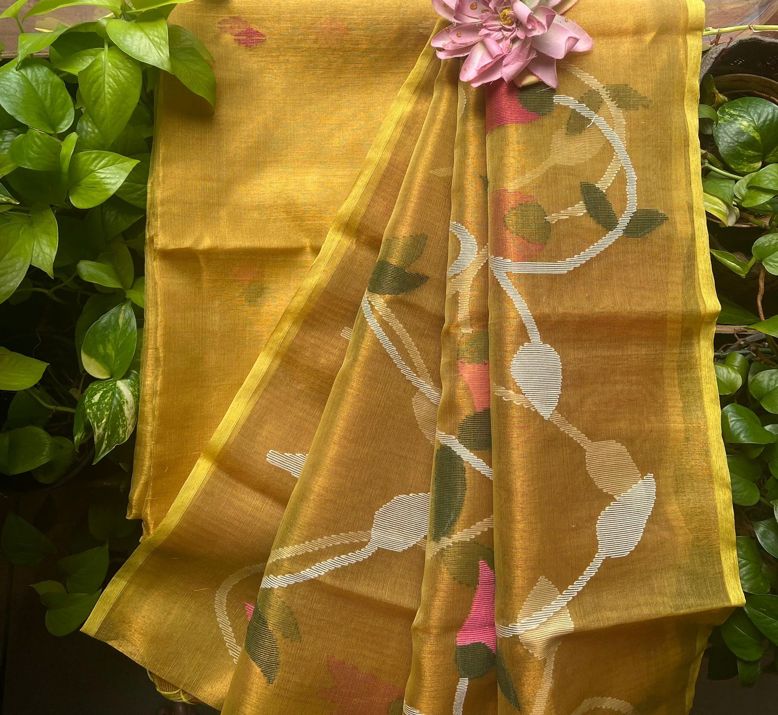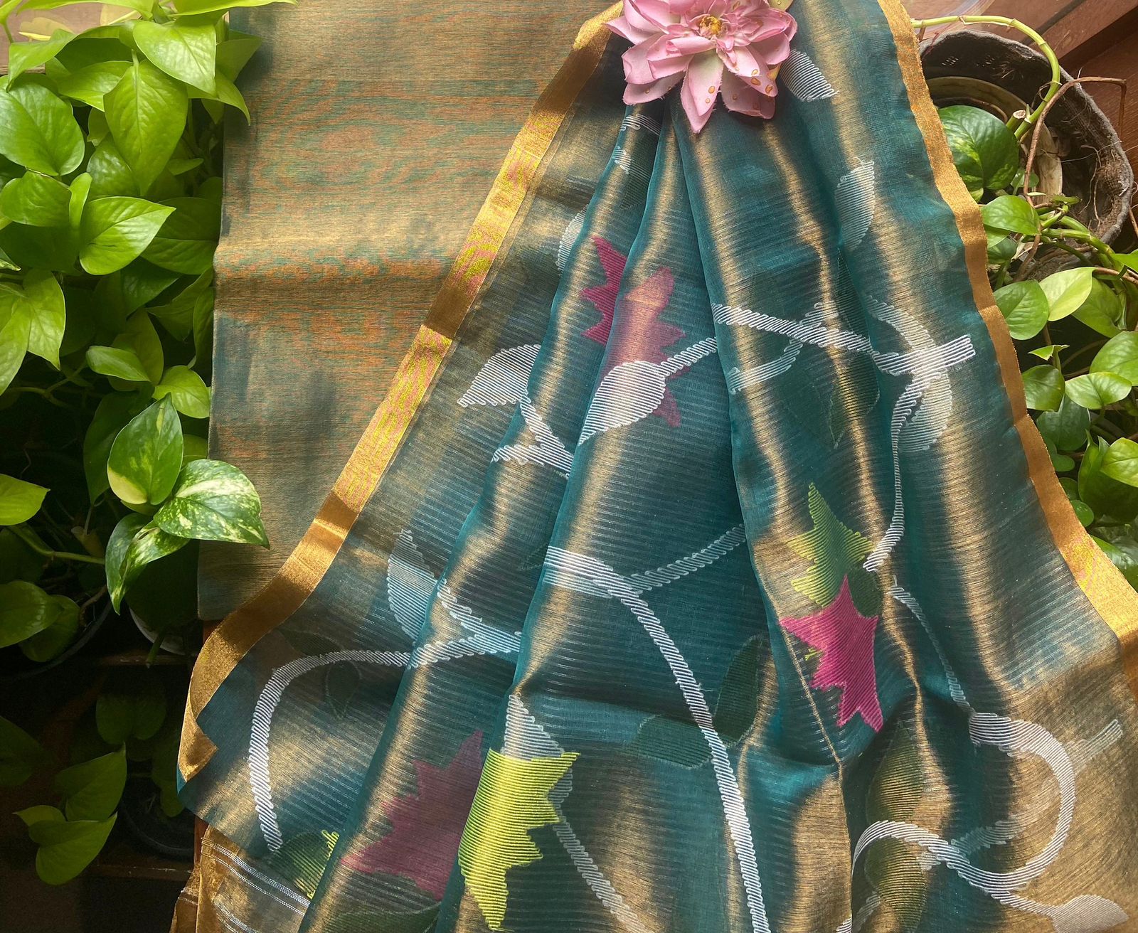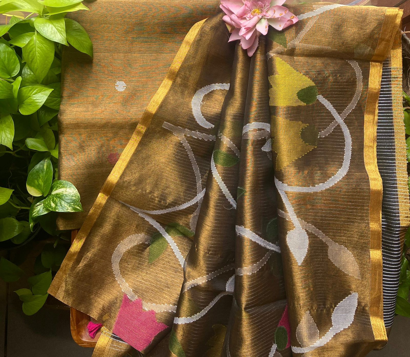 A beautiful collection of Tussar silk sarees with very elegant check weaving on entire saree & borders finished with beautiful cross stitch reminiscent floral embroidery. With blouse pure Benarasi silk