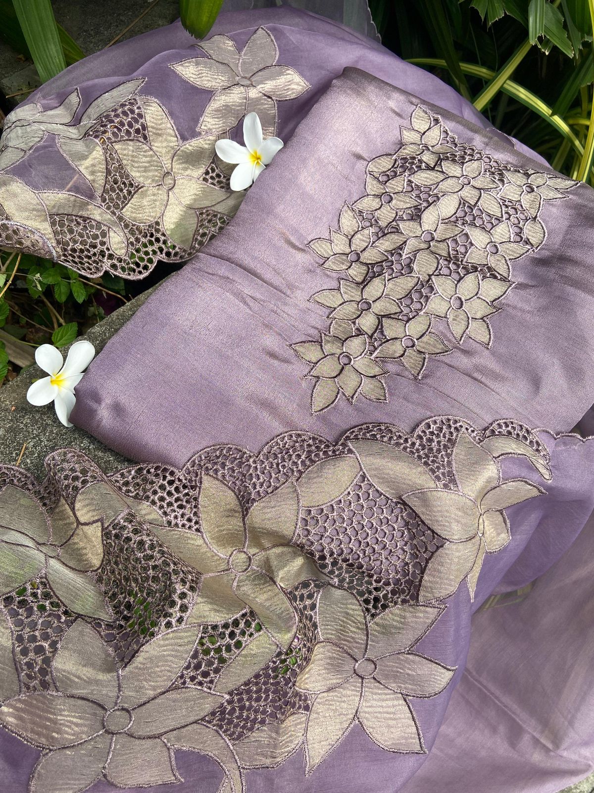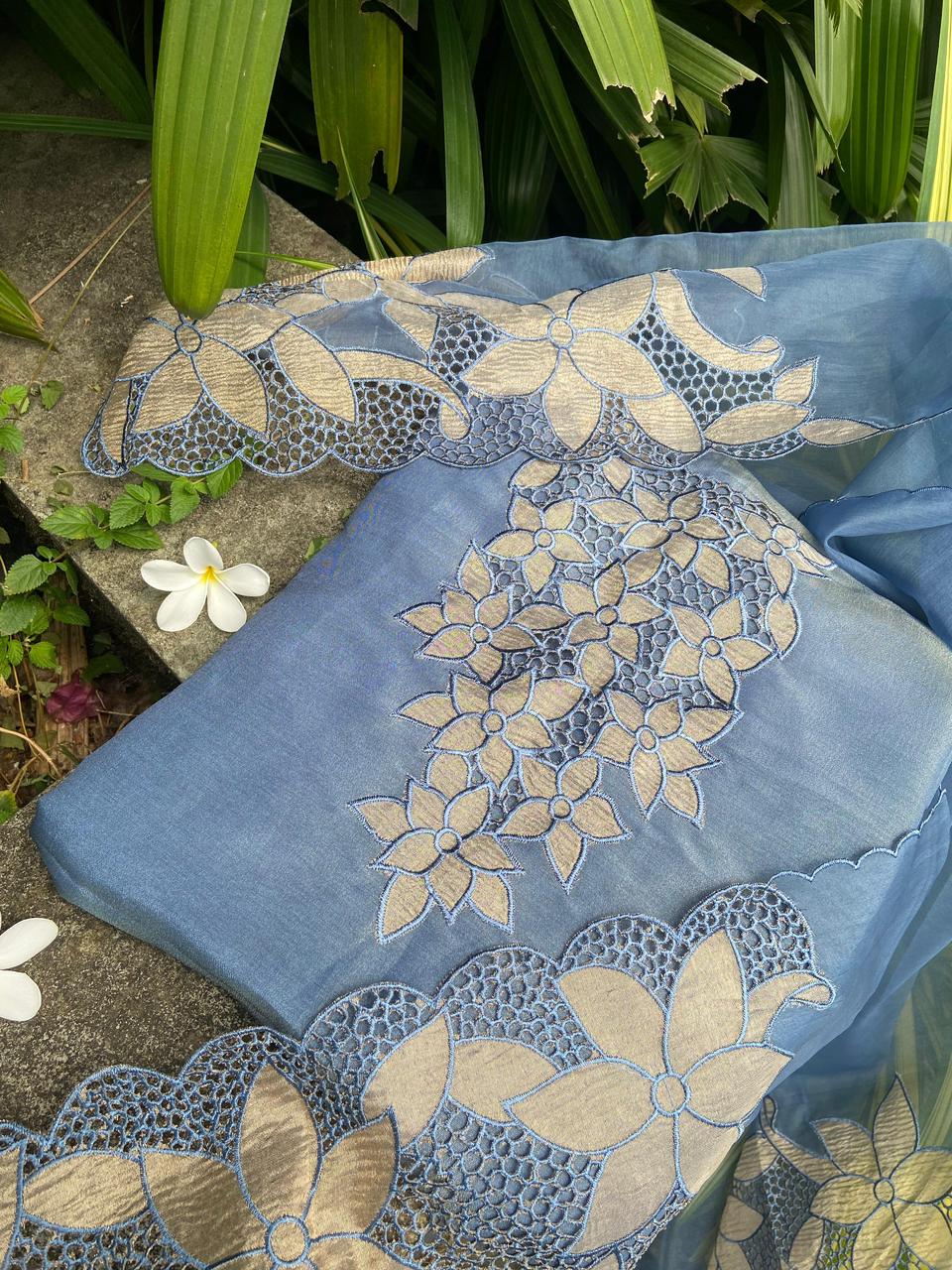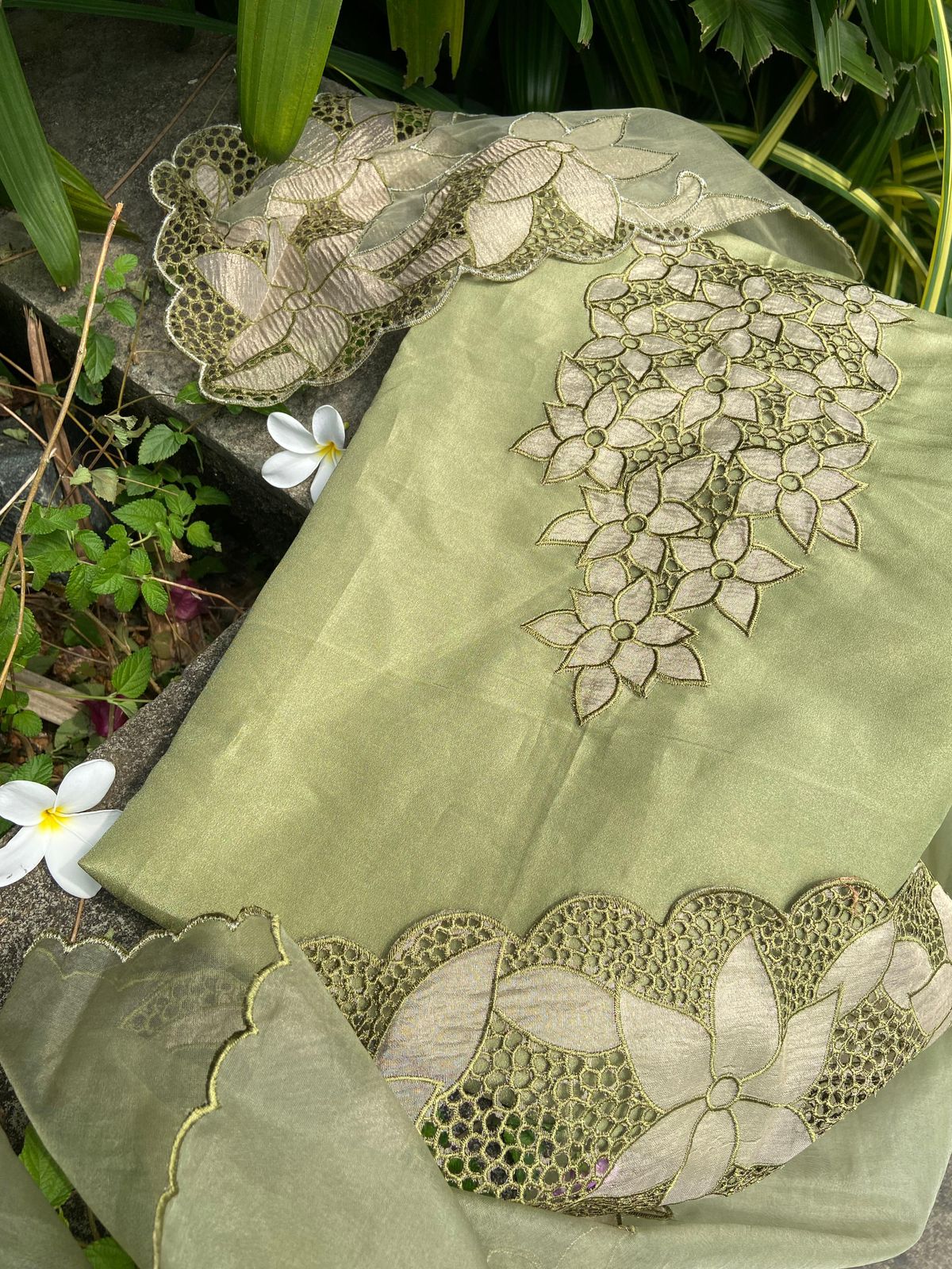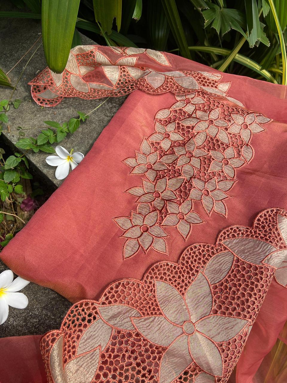 A beautiful collection of pure Uppada silk top with intricate Cutwork embroidery , santoon bottom & organza Cutworked Duppatta