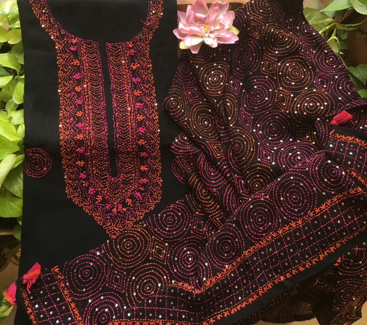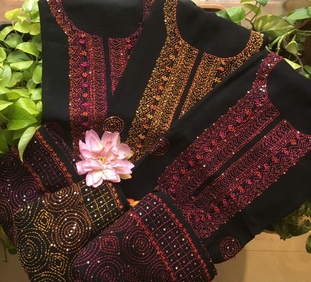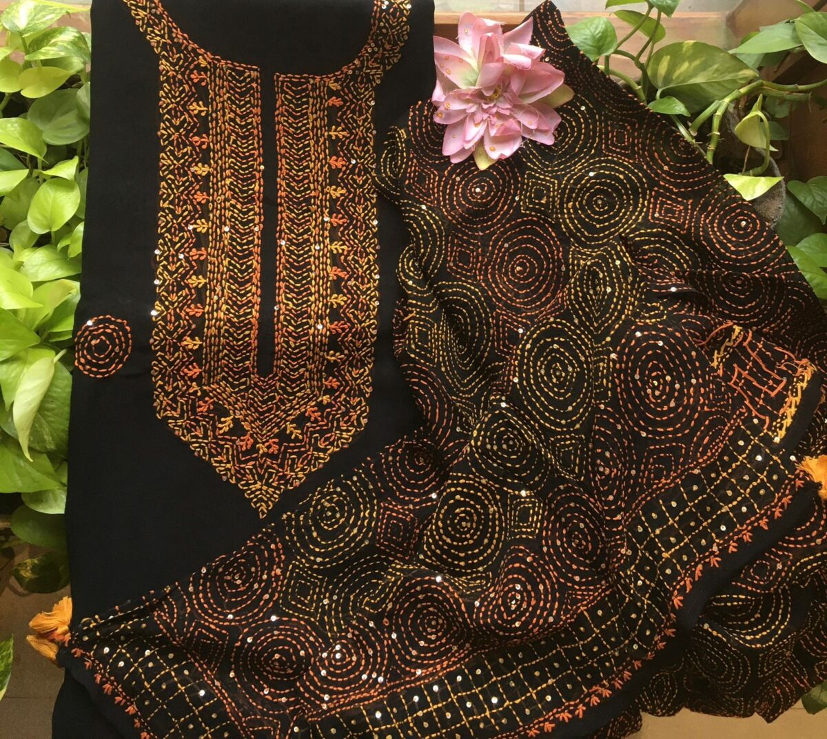 Be the first to review “A beautiful collection of Pure Viscose georgette top and Duppatta with beautiful and intricate Nakshi Kanta Hand embroidery all along yoke and length of top and sleeves and Duppatta with complete Nakshi Kanta work and santoon bottom” Cancel reply