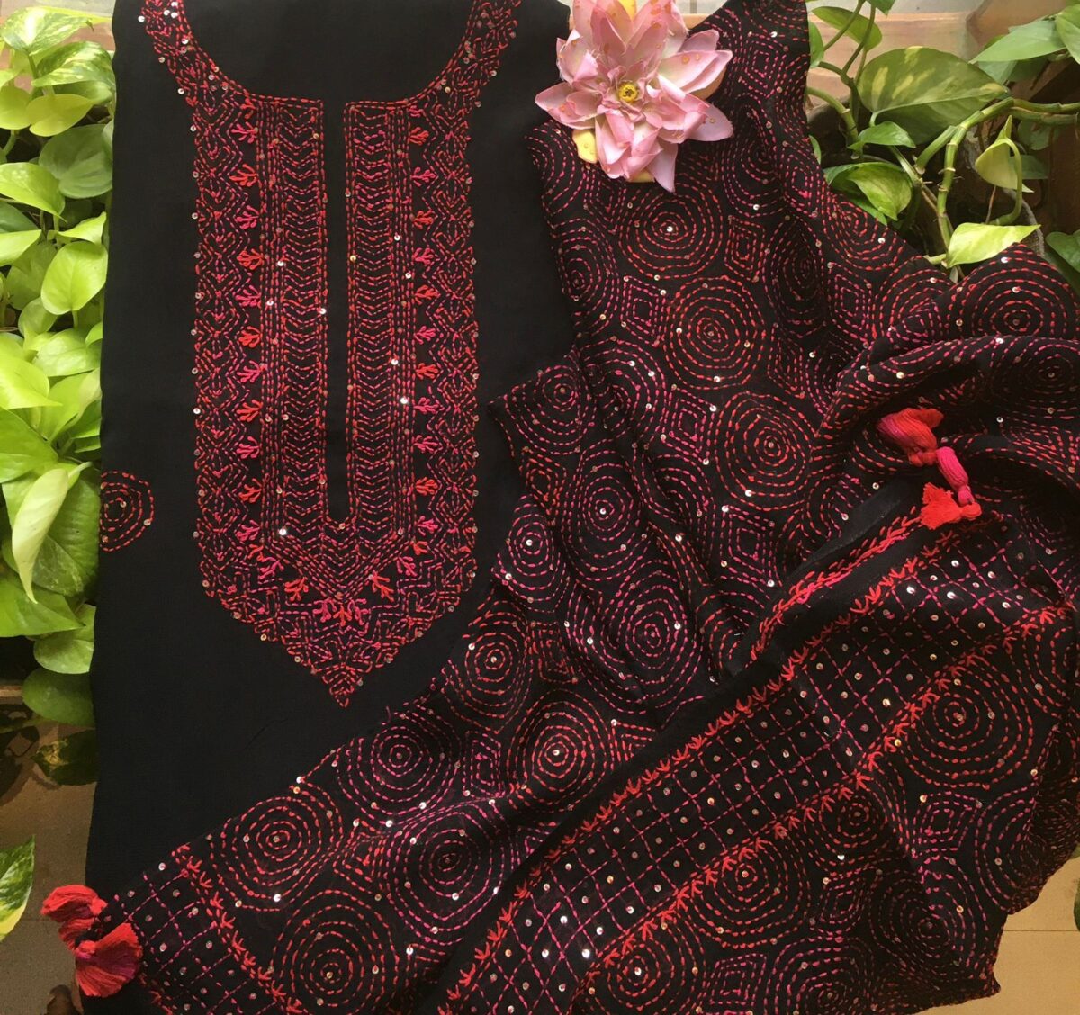 HomeSalwar Set A beautiful collection of Pure Viscose georgette top and Duppatta with beautiful and intricate Nakshi Kanta Hand embroidery all along yoke and length of top and sleeves and Duppatta with complete Nakshi Kanta work and santoon bottom