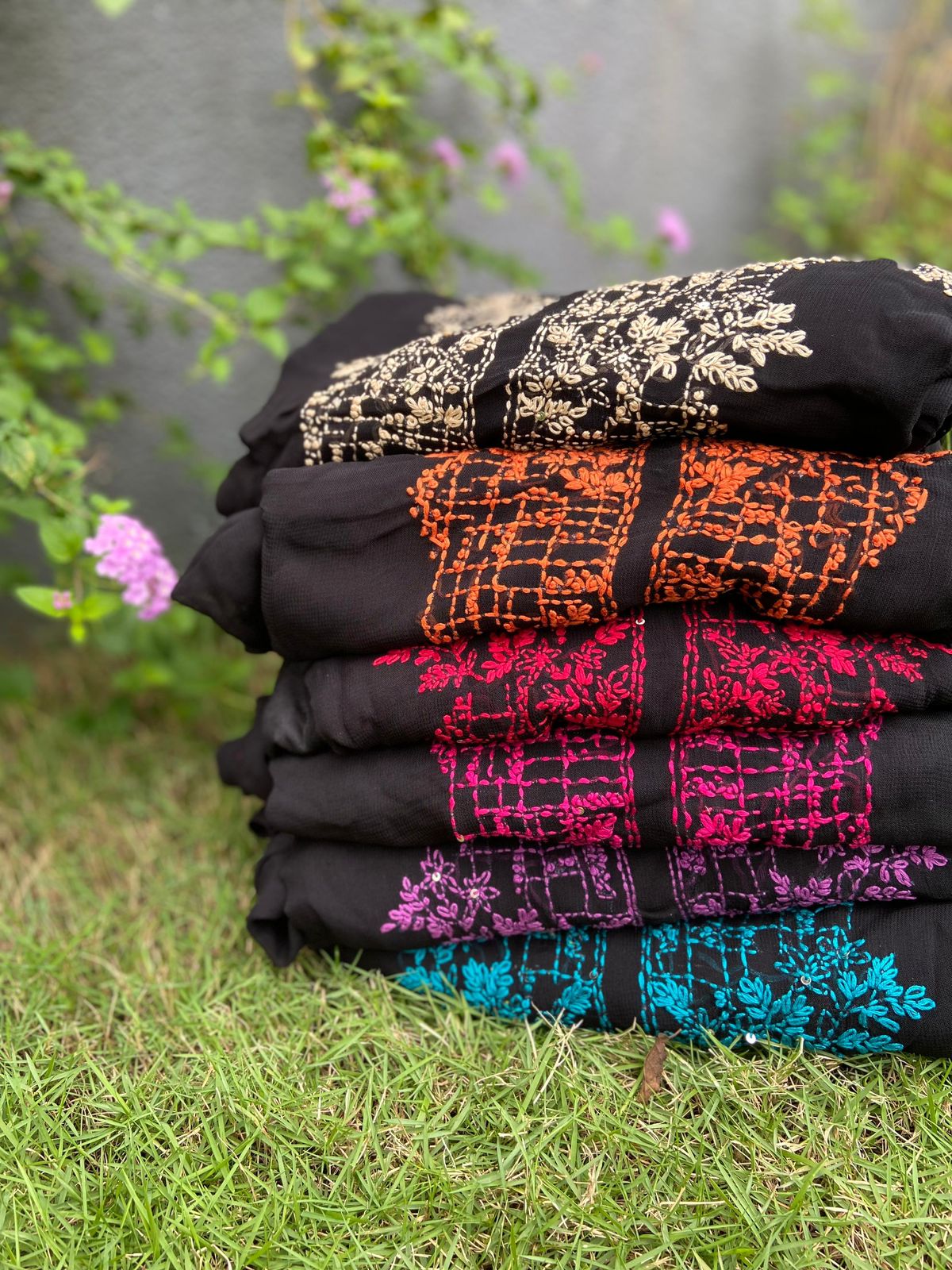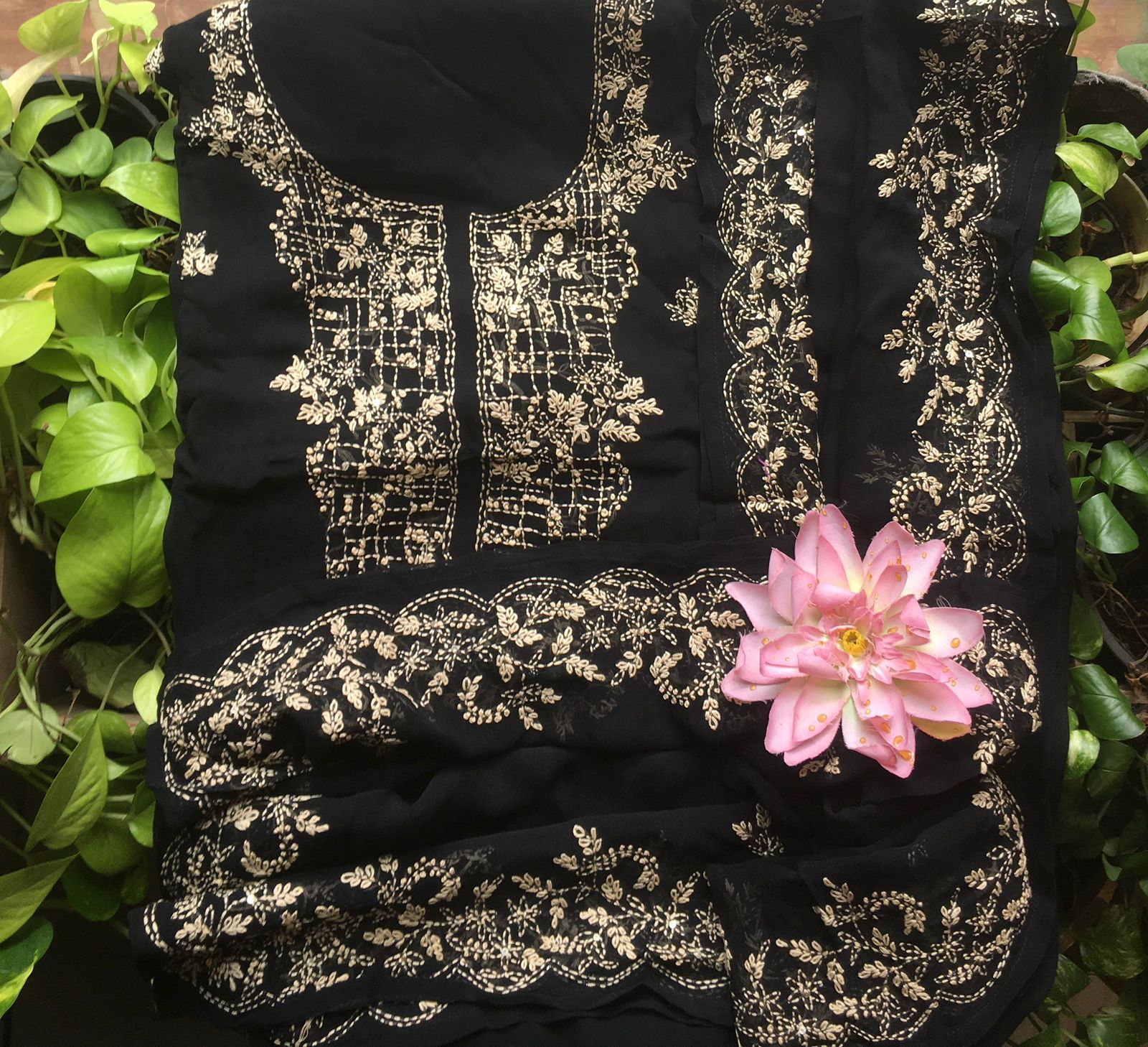Presenting out Brand New Collection for Onam at a Special Price of ₹1499/- curated on Chiffon woth Cutwork and beautiful floral embroidery! Ethereal hues of Pink, Pearl Green, Ivory gold, Dusty pink & Jet black on Chiffon top and Duppatta with floral embroidery & Cutwork. The floral embroidery design is created to resemble pearl embroidery. Bottom is cotton silk