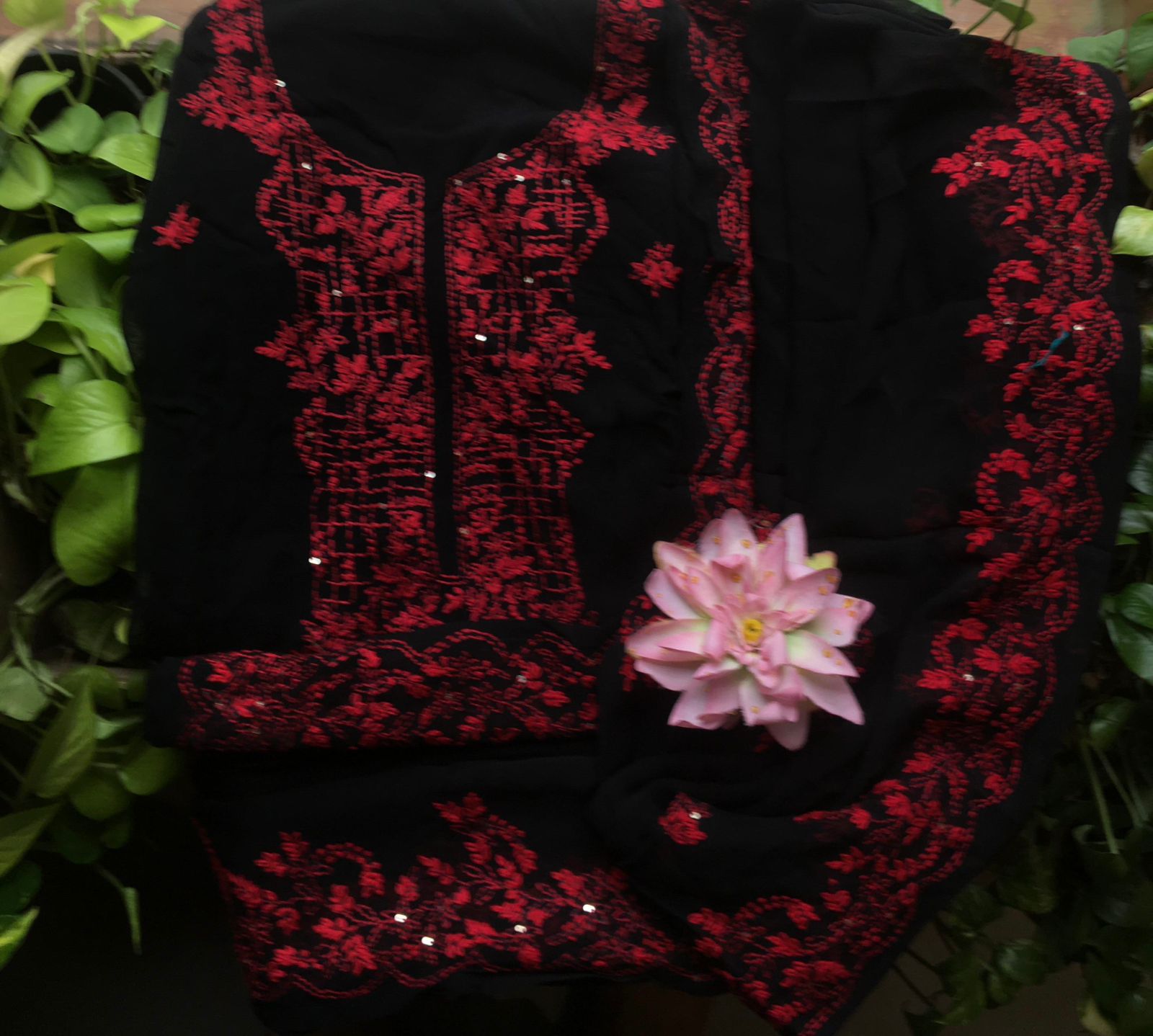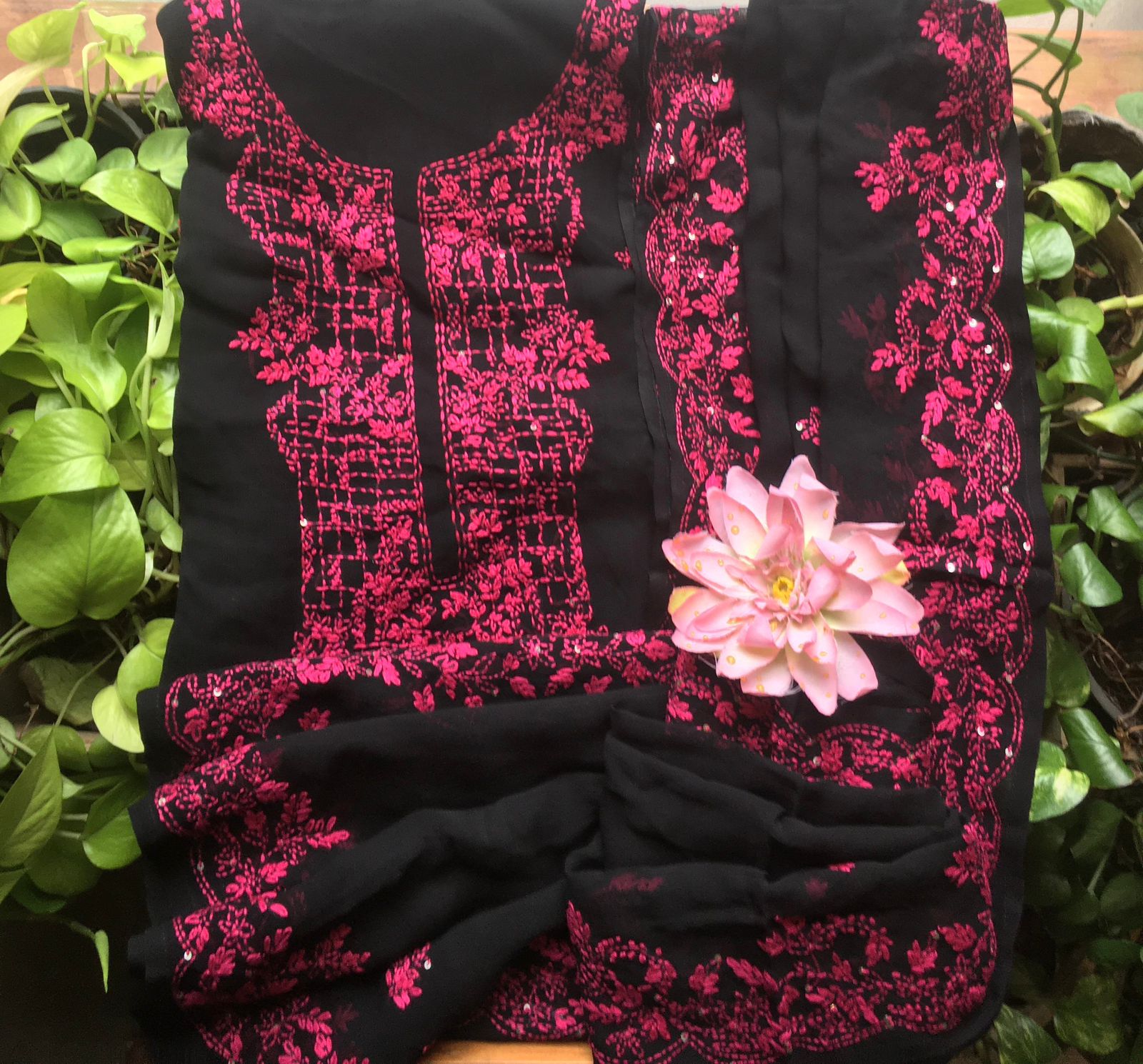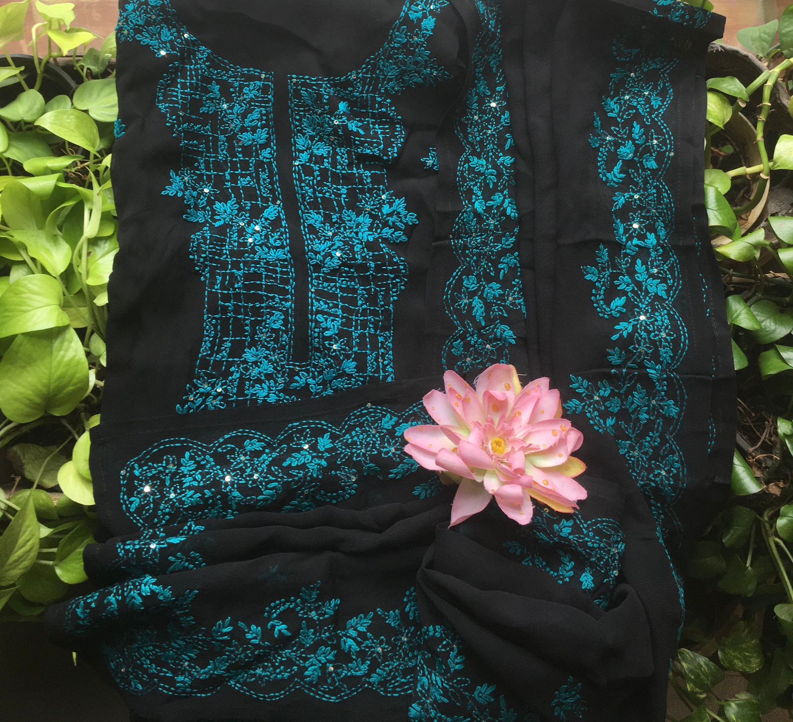 A beautiful collection of Pure Viscose georgette top & Duppatta with beautiful & intricate Nakshi Kanta Hand embroidery all along yoke & length of top & sleeves & Duppatta with complete Nakshi Kanta work & santoon bottom