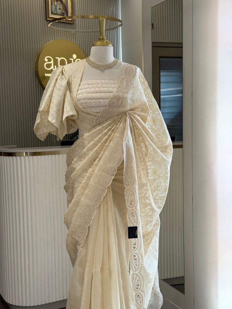 āļø Presenting a Beautiful Pure Silk Organza Saree with intricate Chikankari embroidery and Zari embroidery borders throughout The pallav is completely covered with embroidery and paired with a beautiful Benarasi blouse piece . Exclusive piece available!!!