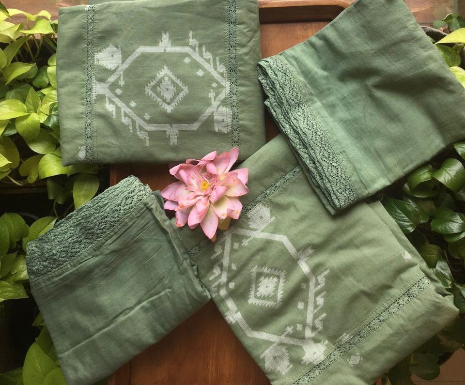 A beautiful collection of Pure Muslin cotton top with intricate Jamdhani weaving and crochet detailing and soft Mal Duppatta with crochet detailing and cotton bottom