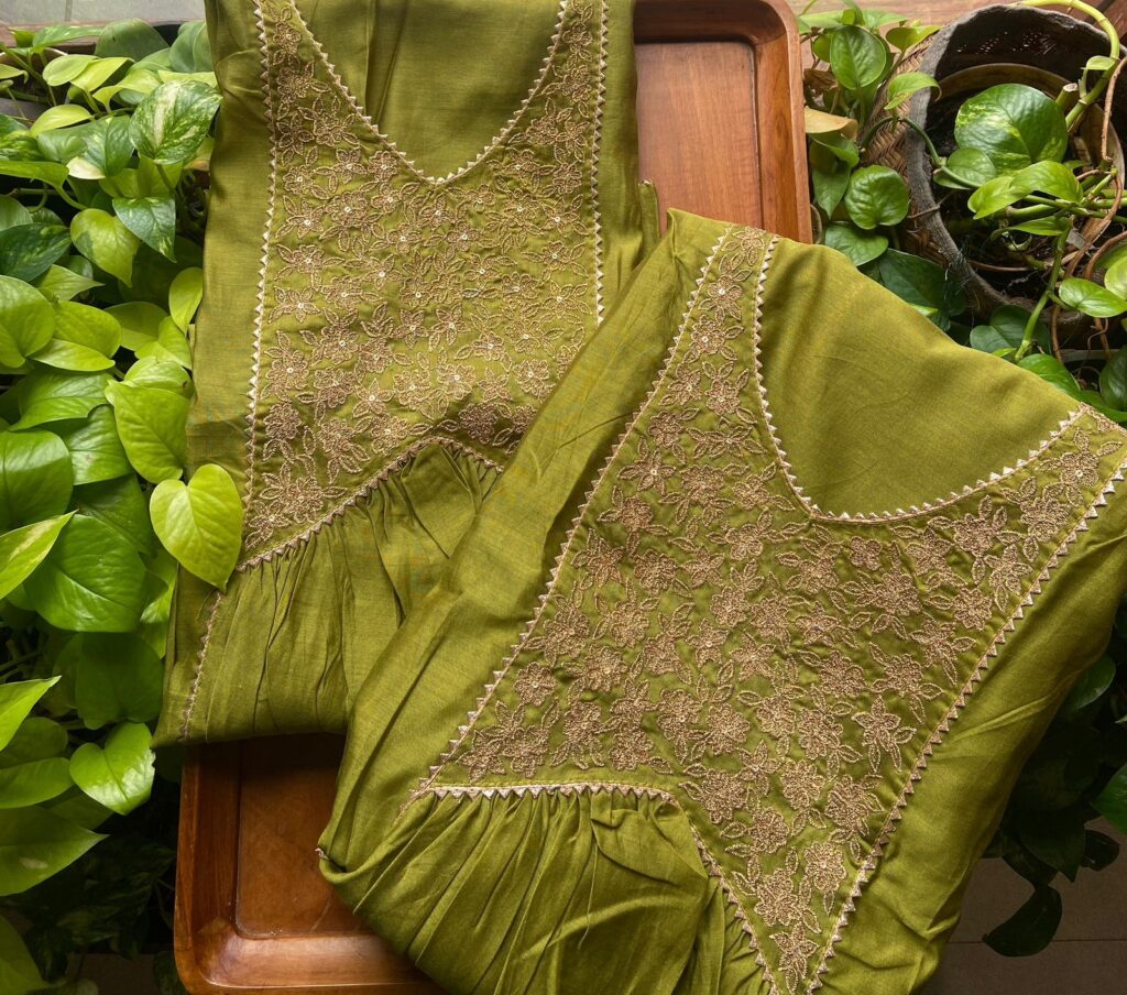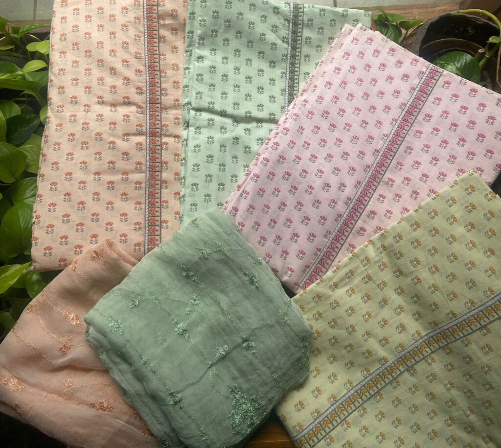 Gorgeous Kurta Materials on Chandheri silk with intricate embroidery detailing.