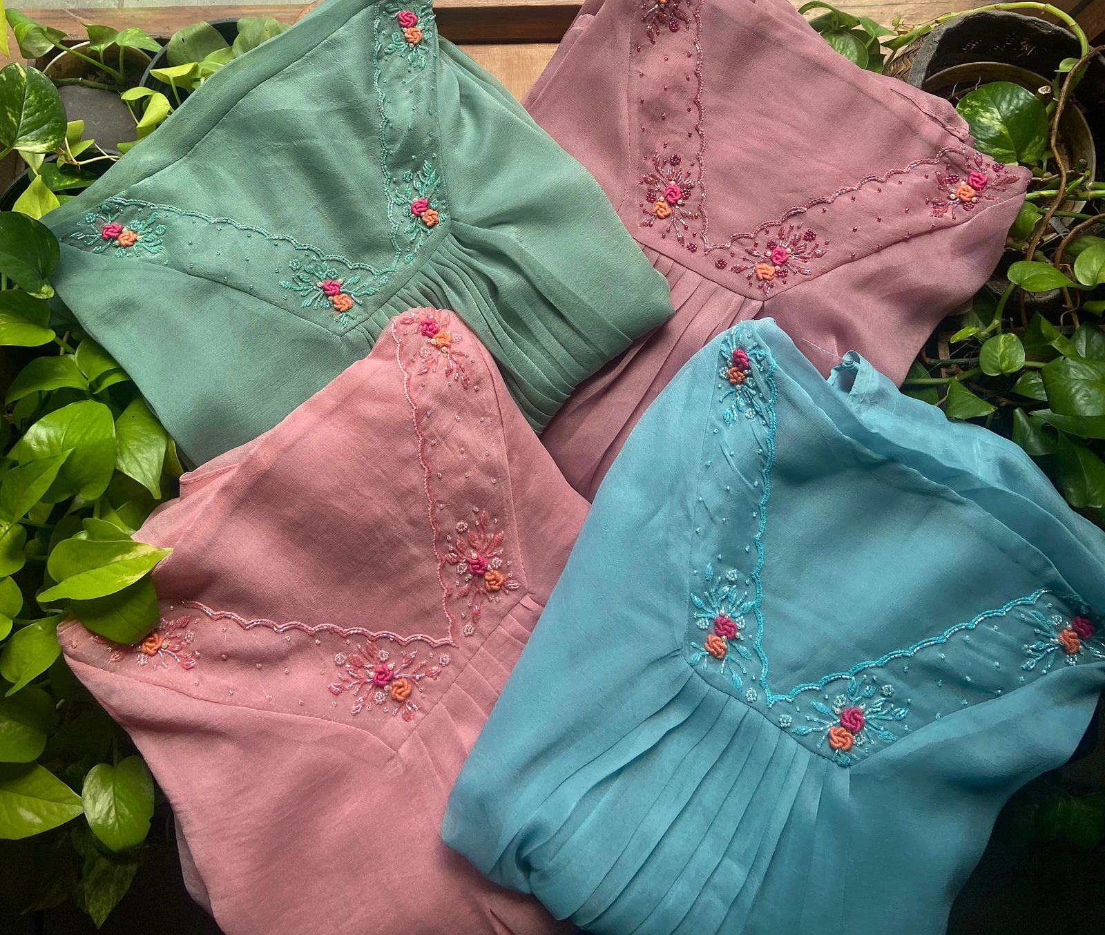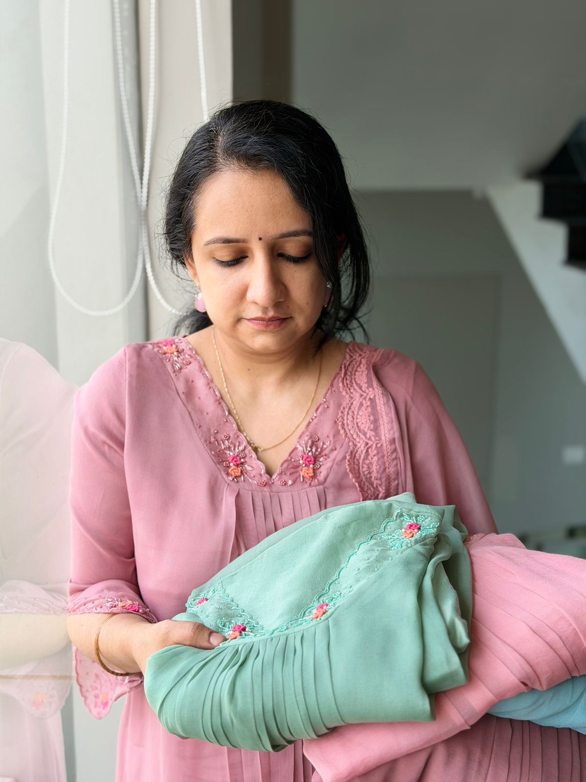 Presenting out Brand New Collection for Onam at a Special Price of ₹1499/- curated on Chiffon woth Cutwork and beautiful floral embroidery! Ethereal hues of Pink, Pearl Green, Ivory gold, Dusty pink & Jet black on Chiffon top and Duppatta with floral embroidery & Cutwork. The floral embroidery design is created to resemble pearl embroidery. Bottom is cotton silk