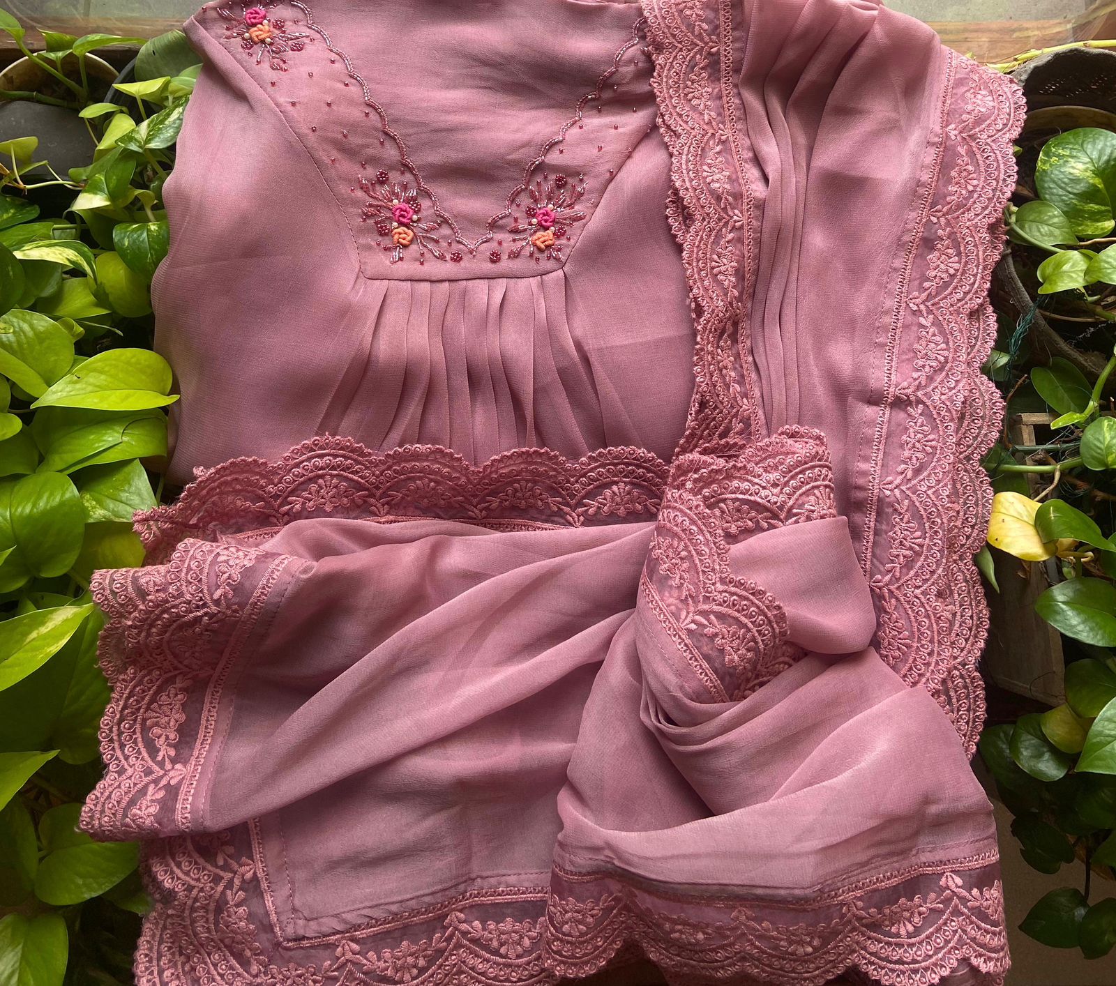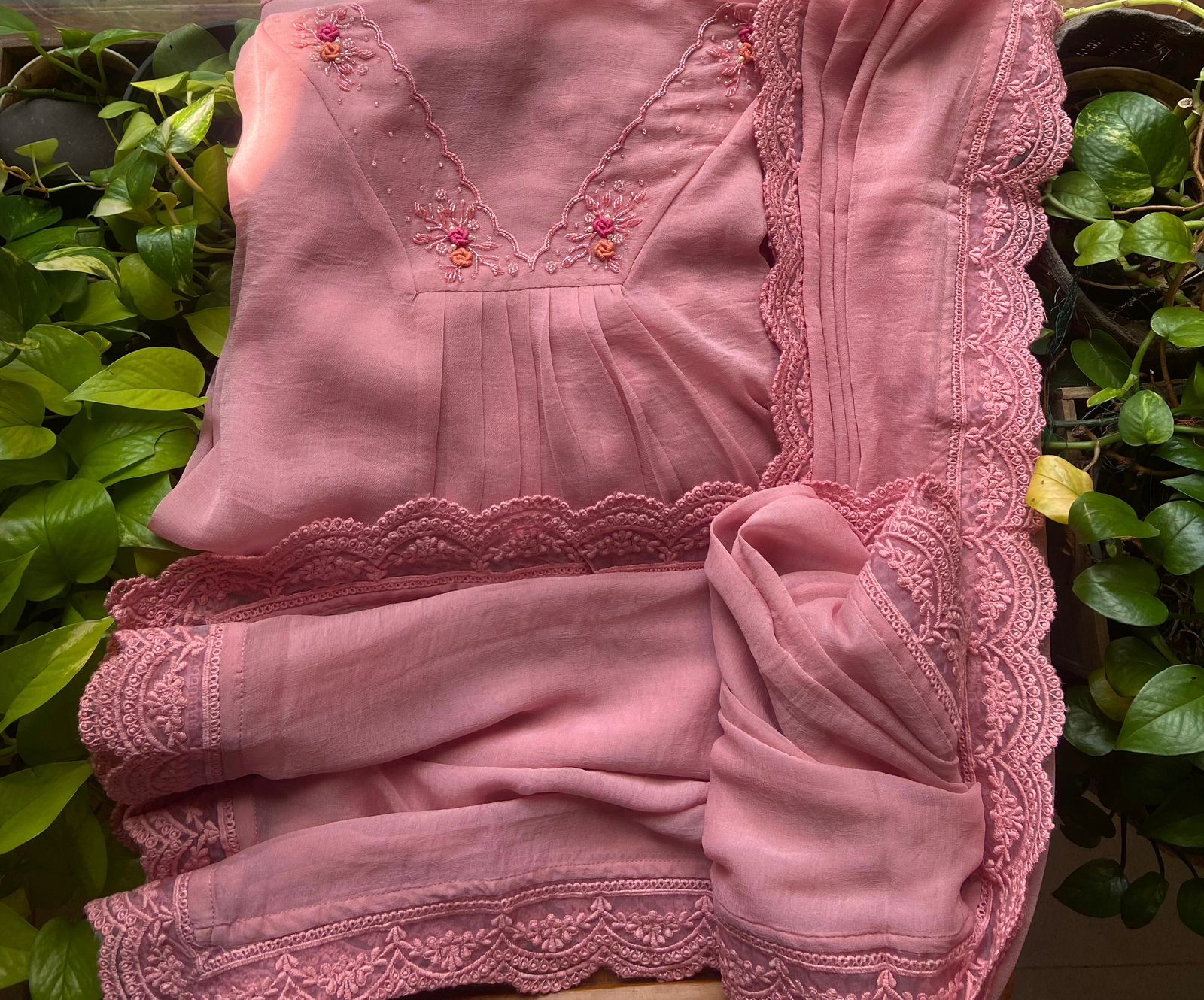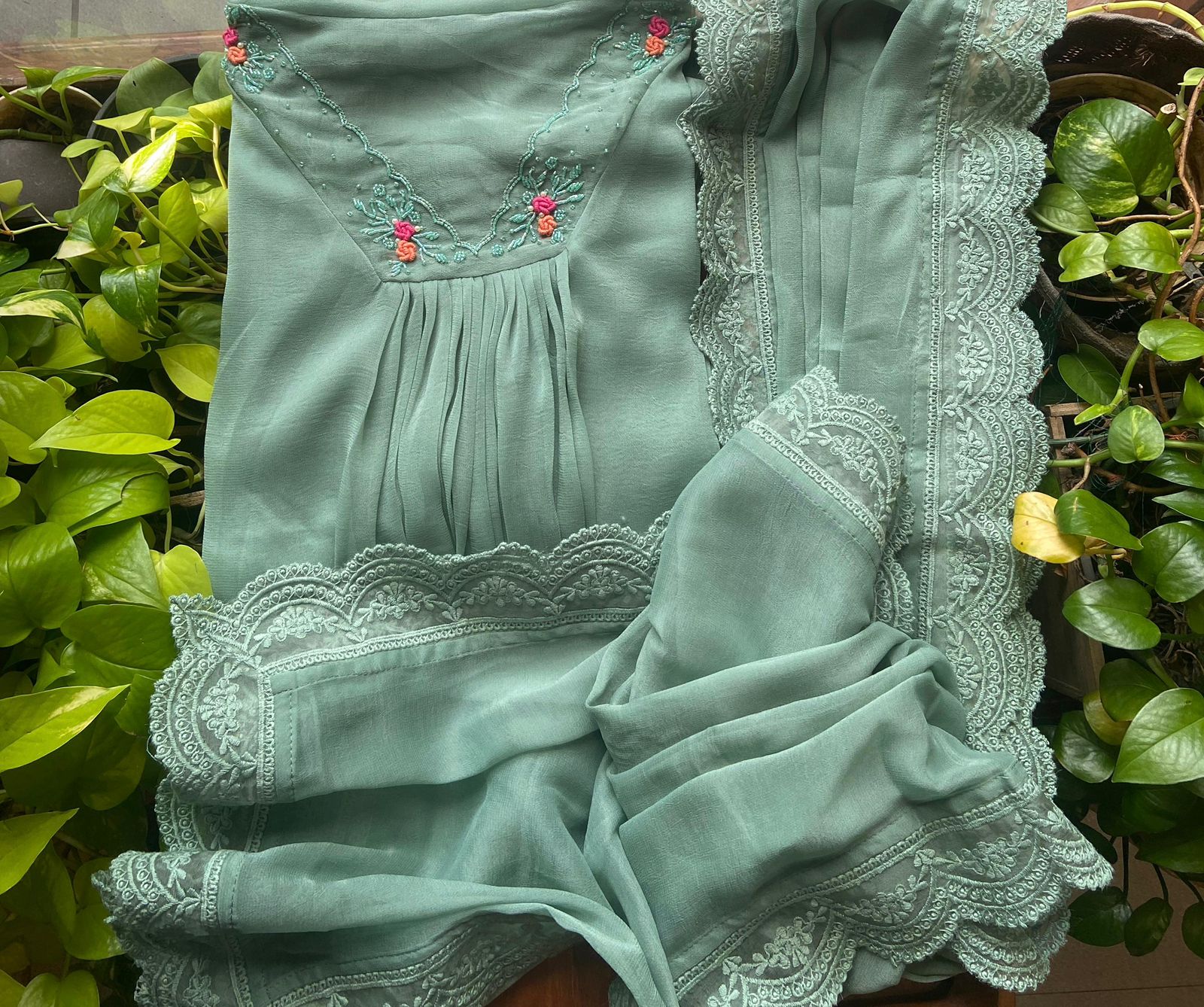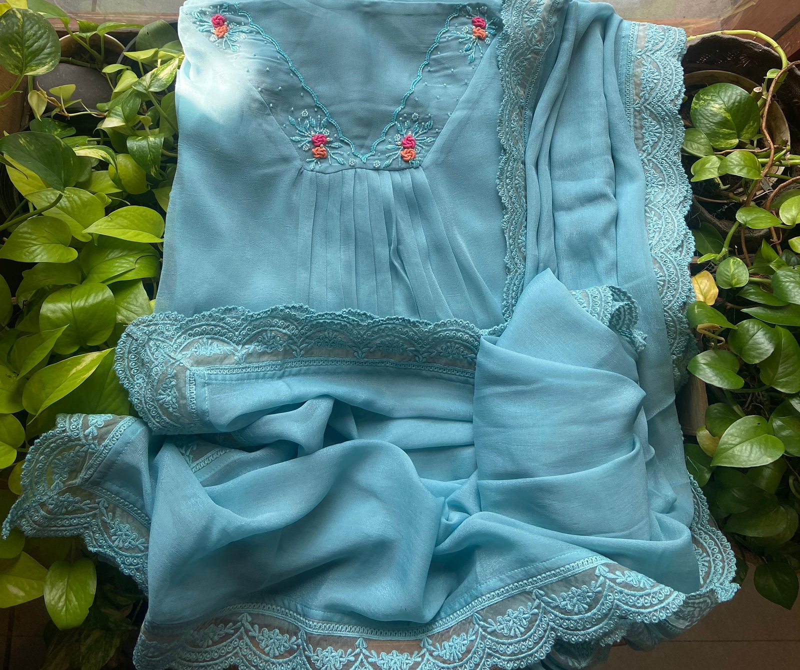 A beautiful designer collection of georgette top with intricate hand embroidery at neckline & sleeve borders , cotton silk bottom & georgette Duppatta with French lace borders