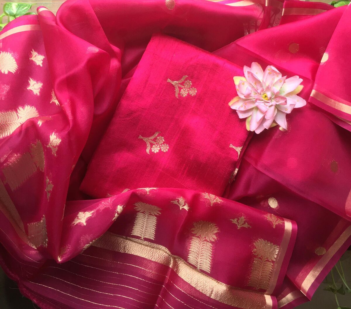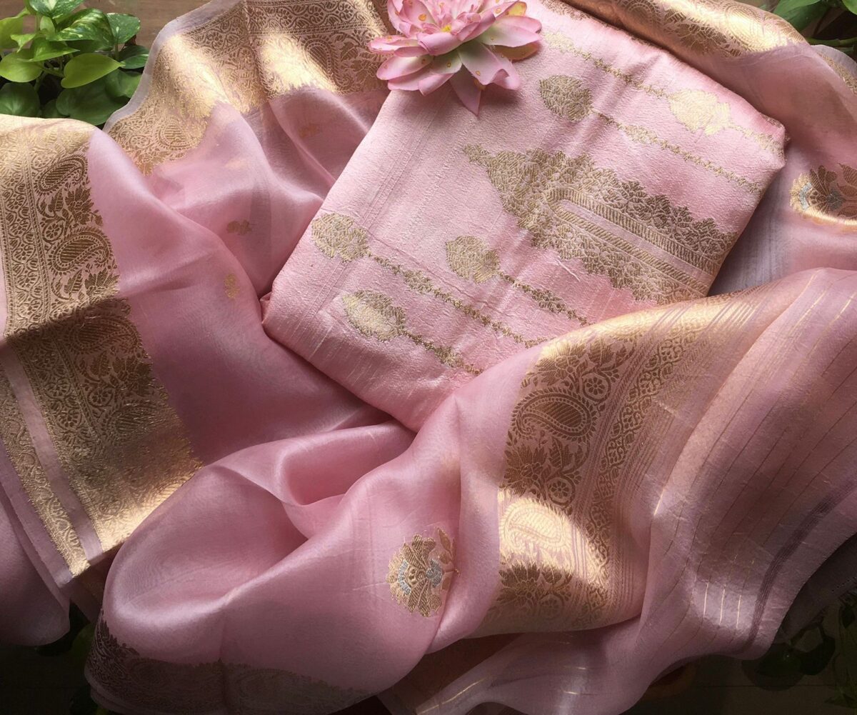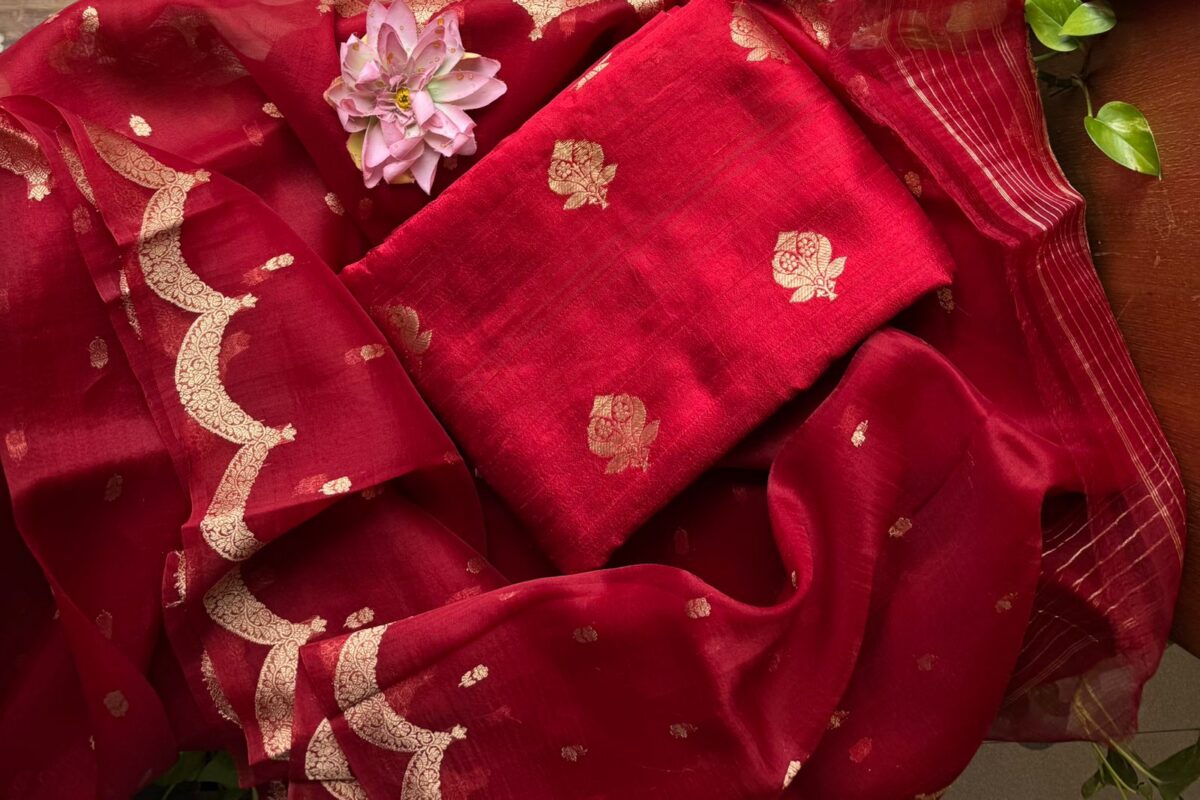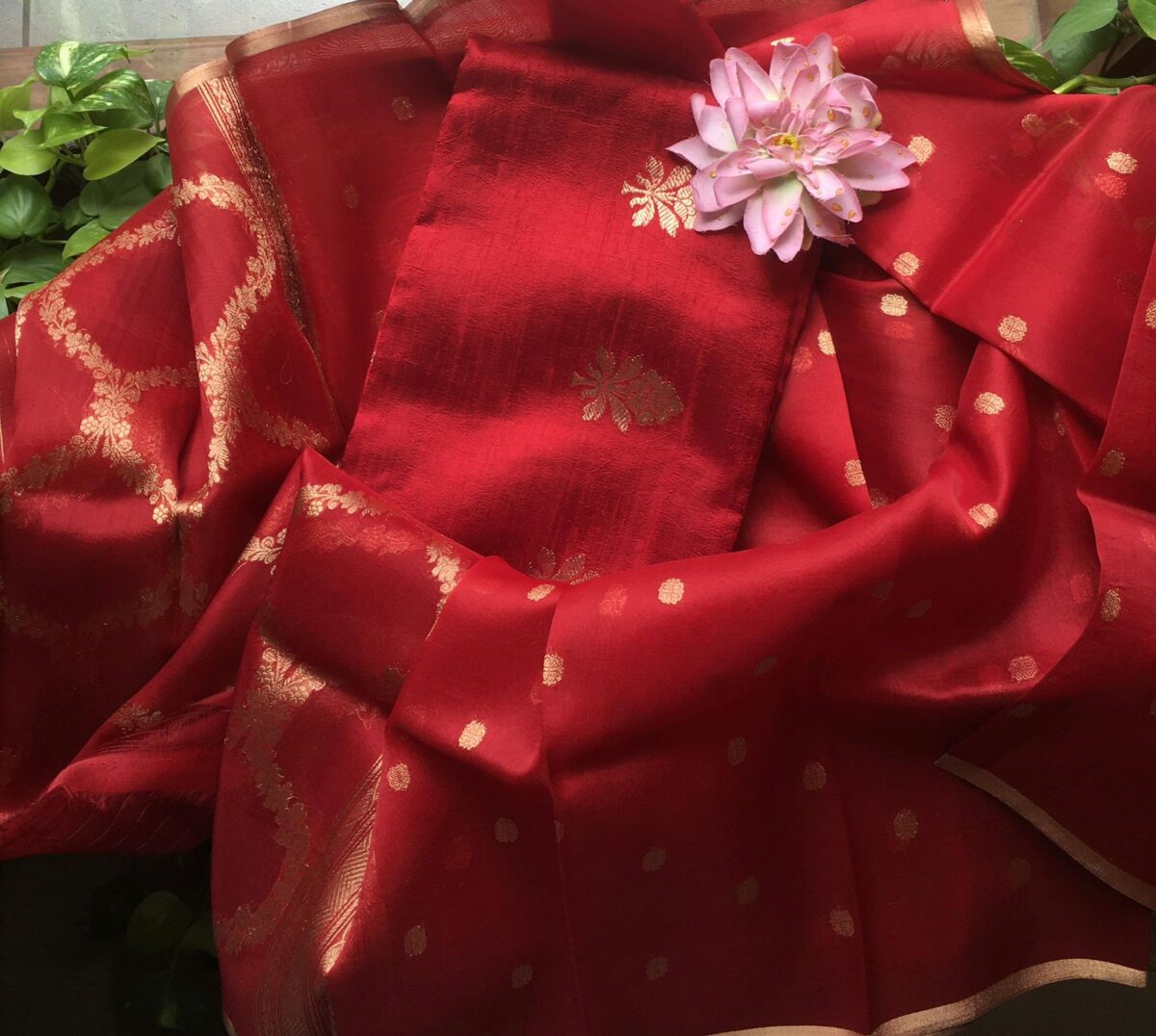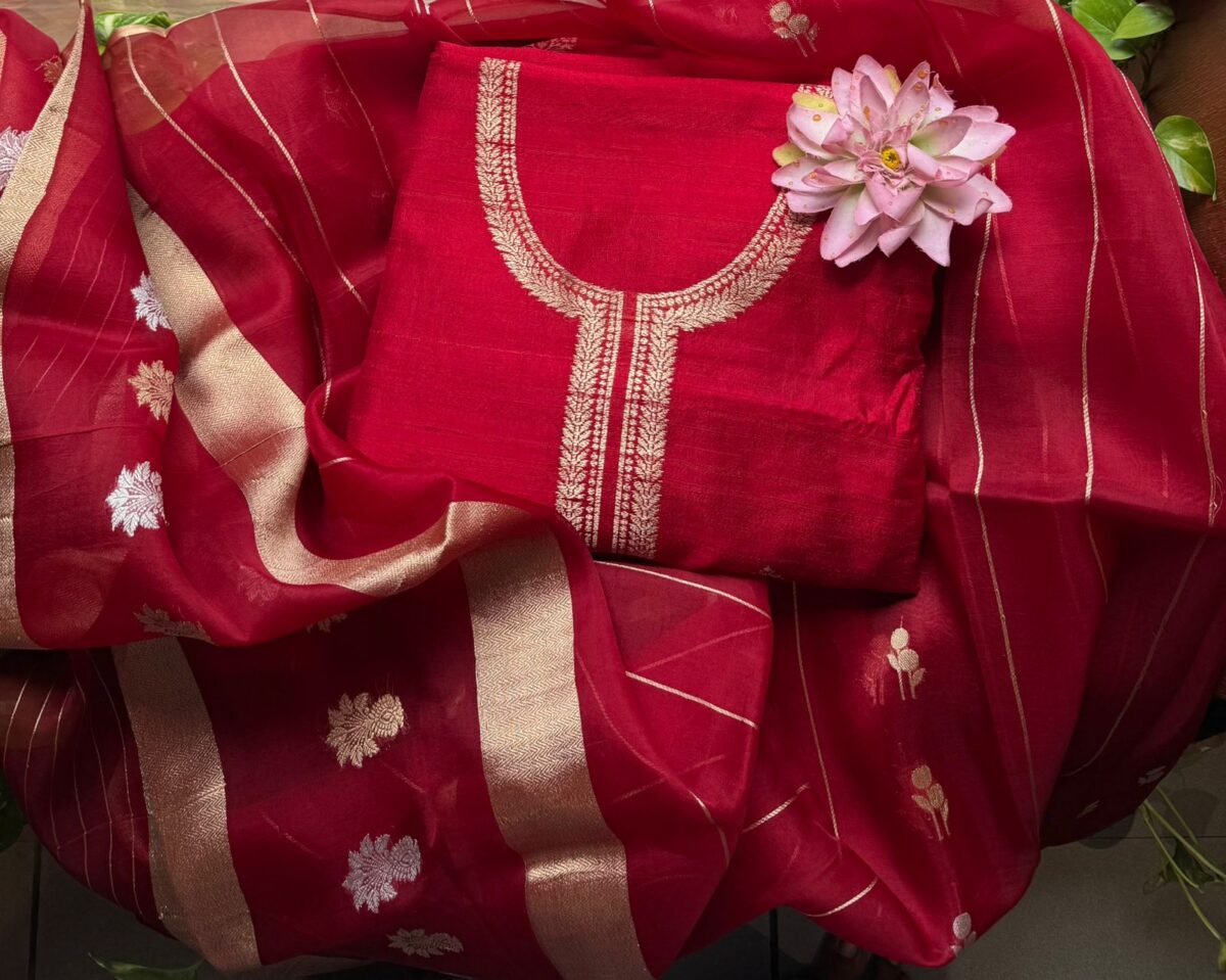 A beautiful & Exclusive collection of Premium Pure Raw Silk top & bottom (can be stitched as another top ) & pure silk organza Duppatta with khadwa hand weaving. The highlight of these suits are the stunning colors & the beautiful hand weaving reminiscent of Kanchivaram weave !
