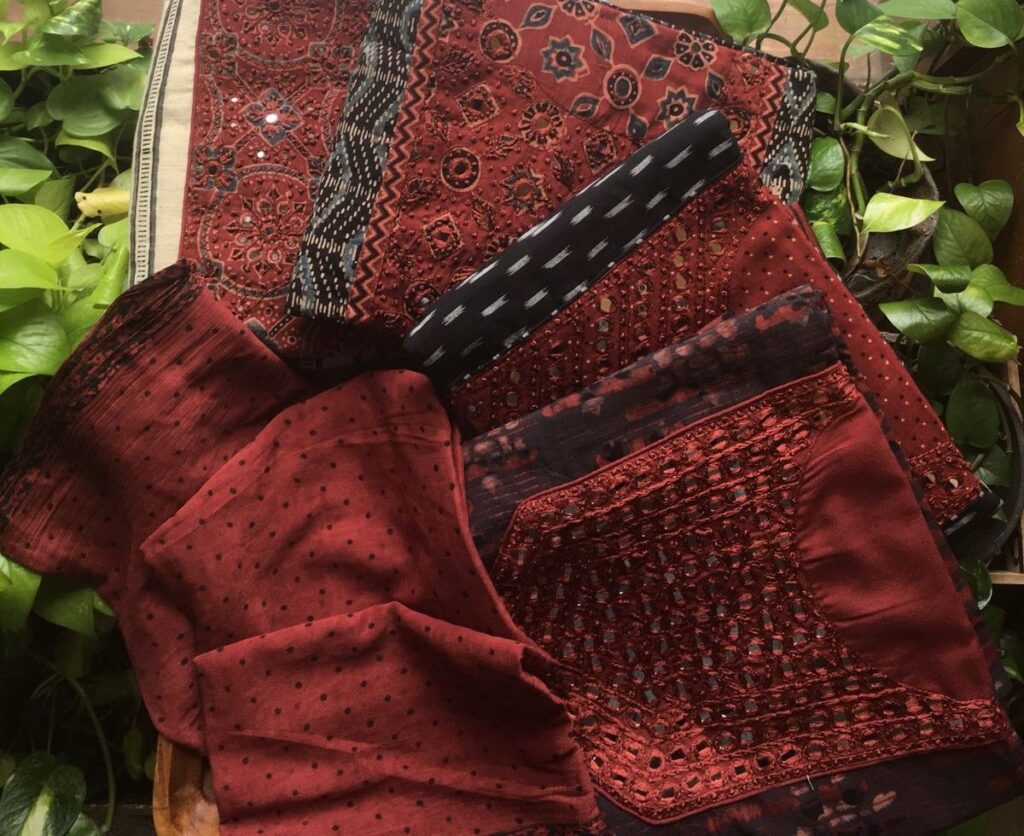 A beautiful premium collection of Pure Cotton top with Ajrak patch & hand embroidery, cotton bottom & Kota Doria / chiffon Duppatta