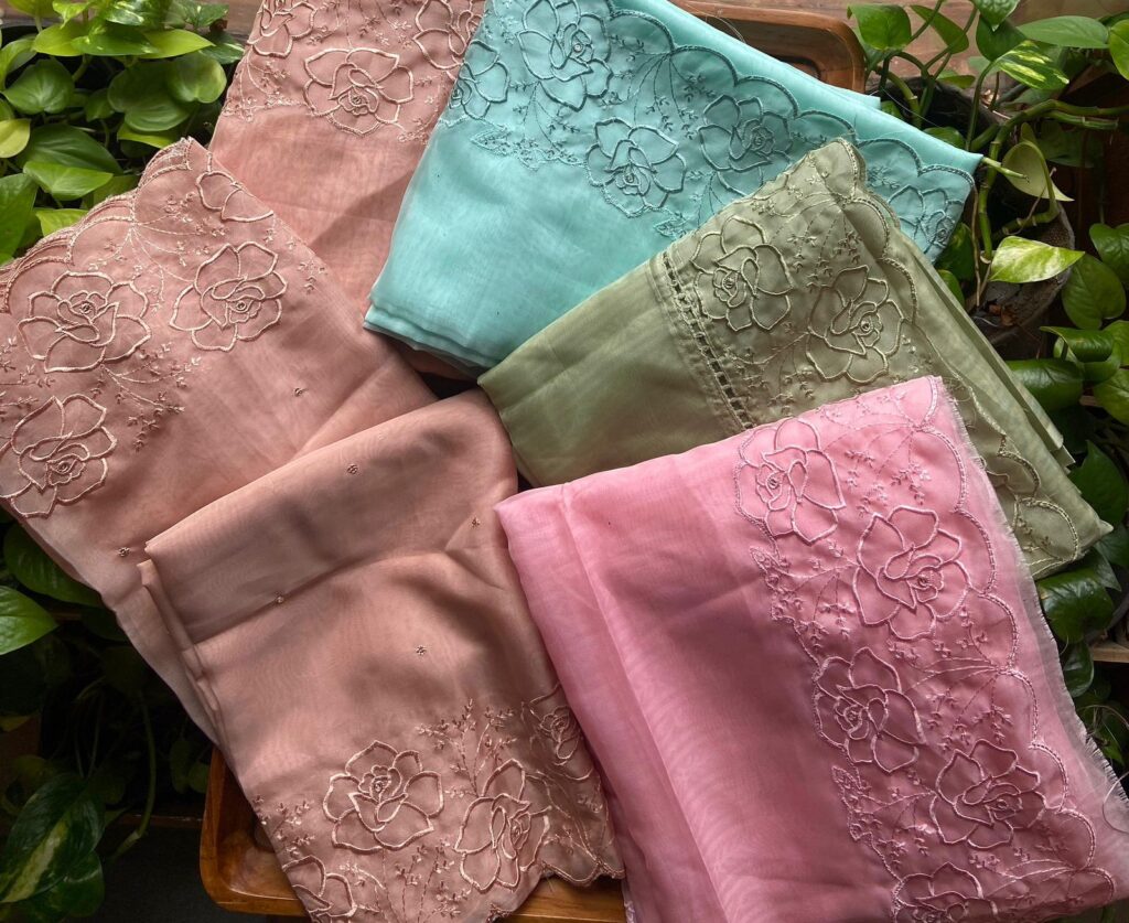 Presenting out Brand New Collection for Onam at a Special Price of ₹1499/- curated on Chiffon woth Cutwork and beautiful floral embroidery! Ethereal hues of Pink, Pearl Green, Ivory gold, Dusty pink & Jet black on Chiffon top and Duppatta with floral embroidery & Cutwork. The floral embroidery design is created to resemble pearl embroidery. Bottom is cotton silk