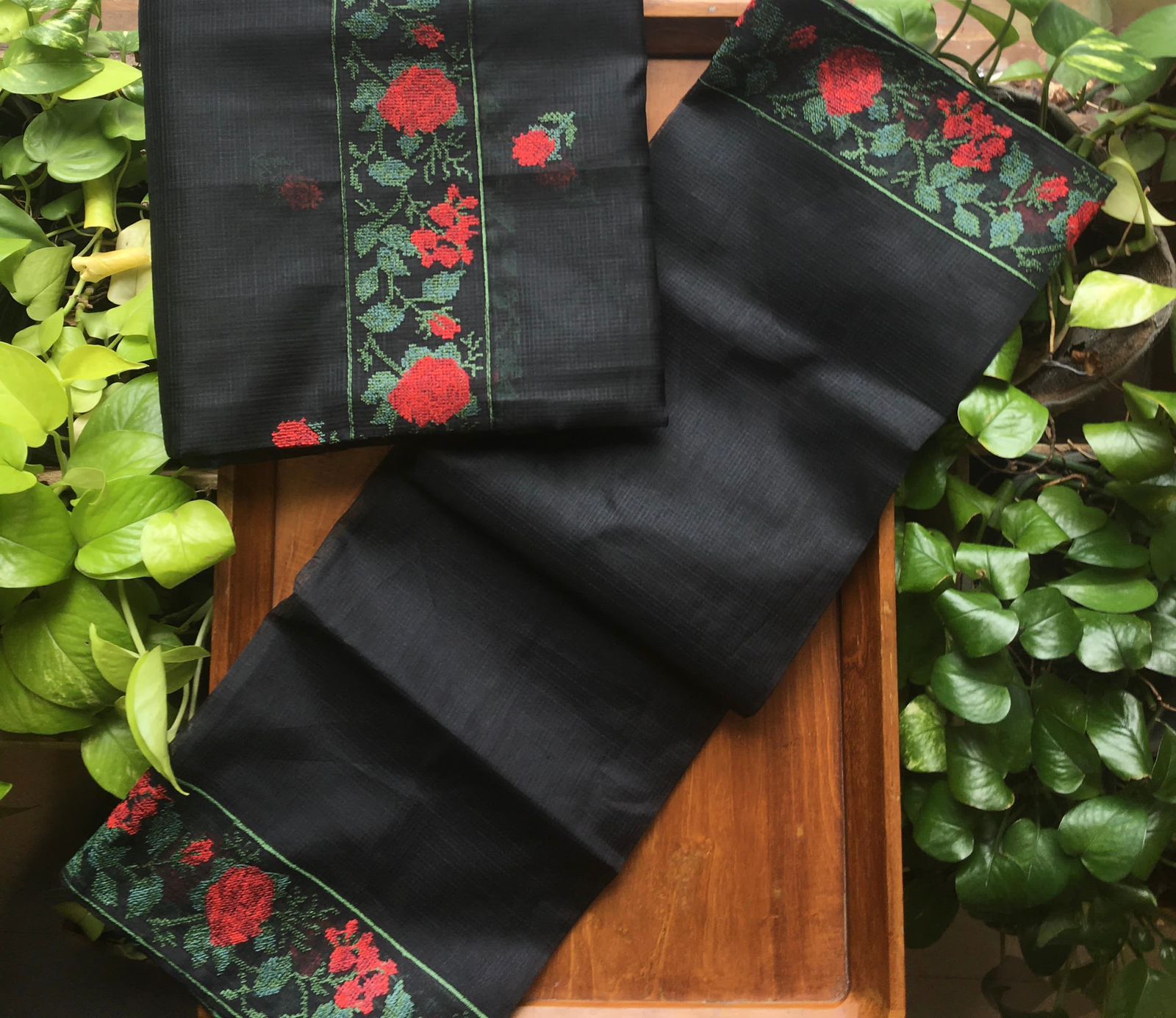 Presenting out Brand New Collection for Onam at a Special Price of ₹1499/- curated on Chiffon woth Cutwork and beautiful floral embroidery! Ethereal hues of Pink, Pearl Green, Ivory gold, Dusty pink & Jet black on Chiffon top and Duppatta with floral embroidery & Cutwork. The floral embroidery design is created to resemble pearl embroidery. Bottom is cotton silk