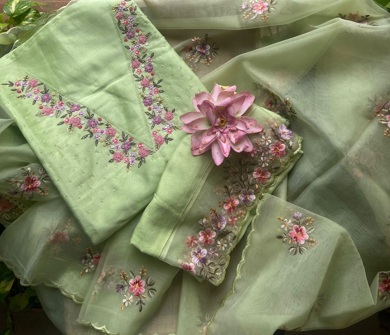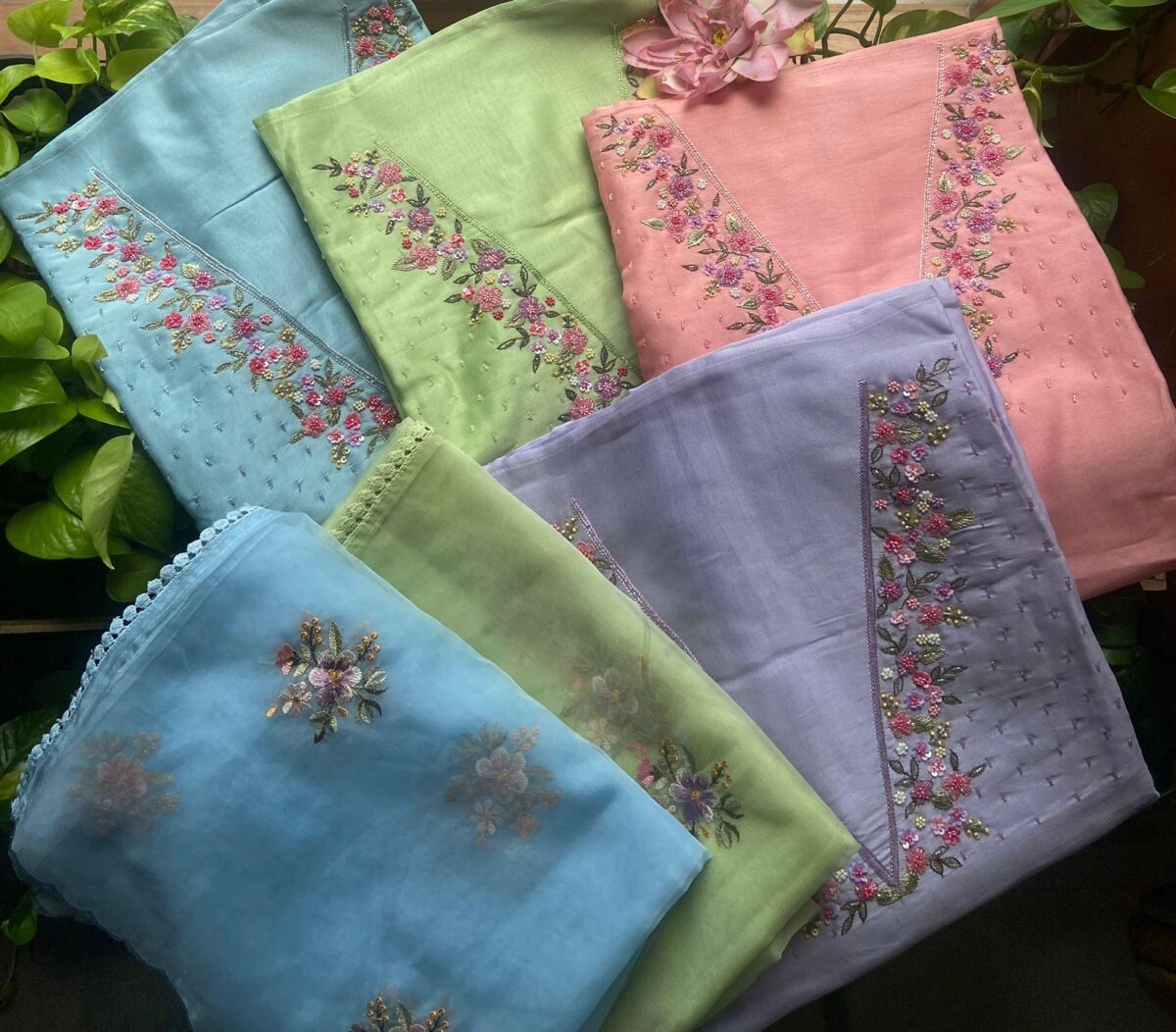 A beautiful premium collection of pure Benarasi Chandheri silk top with exquisite hand embroidery at neckline , sleeve borders & also embroidery on santoon bottom & organza Duppatta with exquisite embroidery