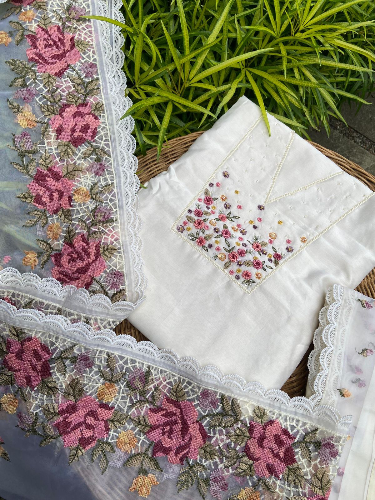 A beautiful Designer Wear Collection in Georgette with gorgeous Chikankari embroidery featuring a contemporary Paisley motif on top & Duppatta & tiny scalloped borders for detailing. Cotton silk bottom.