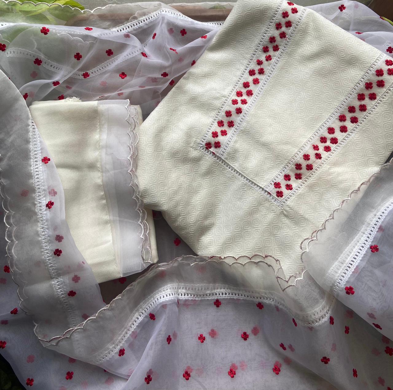 Presenting a stunning collection of Cutwork Hakoba top with lace detailing , cotton bottom & chiffon Duppatta Limited pieces available!!!Hurry & order these before we run out of them! Perfect choice for gifting your dear ones this festive season