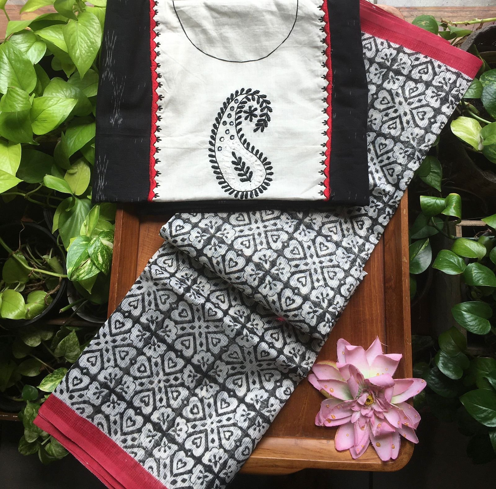 A beautiful Designer Wear Collection in Georgette with gorgeous Chikankari embroidery featuring a contemporary Paisley motif on top & Duppatta & tiny scalloped borders for detailing. Cotton silk bottom.