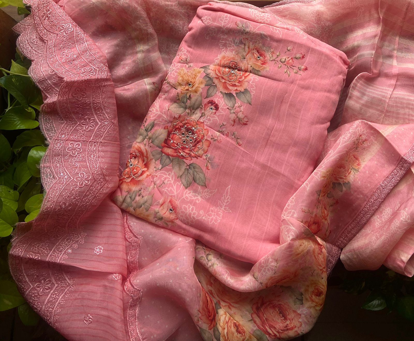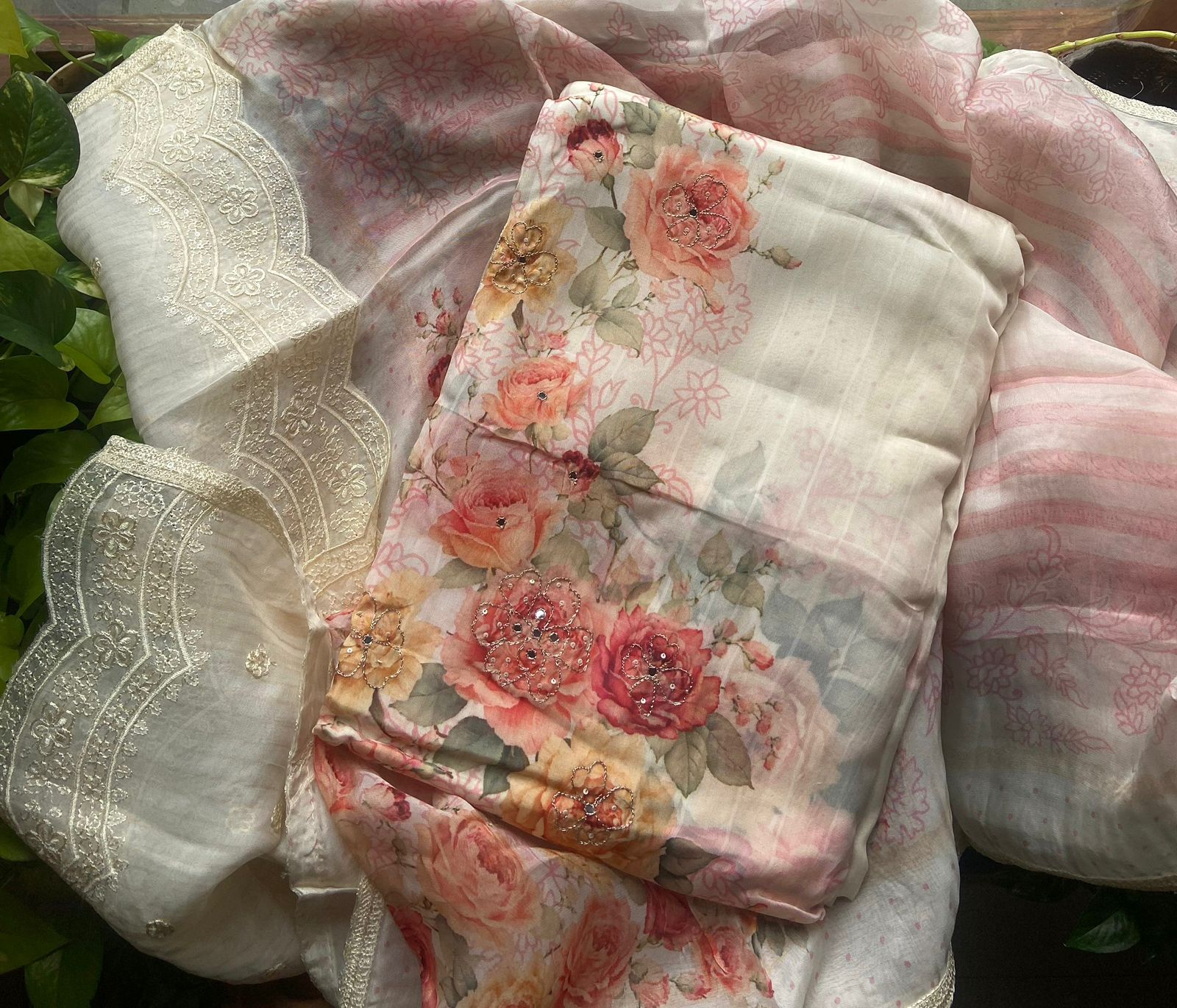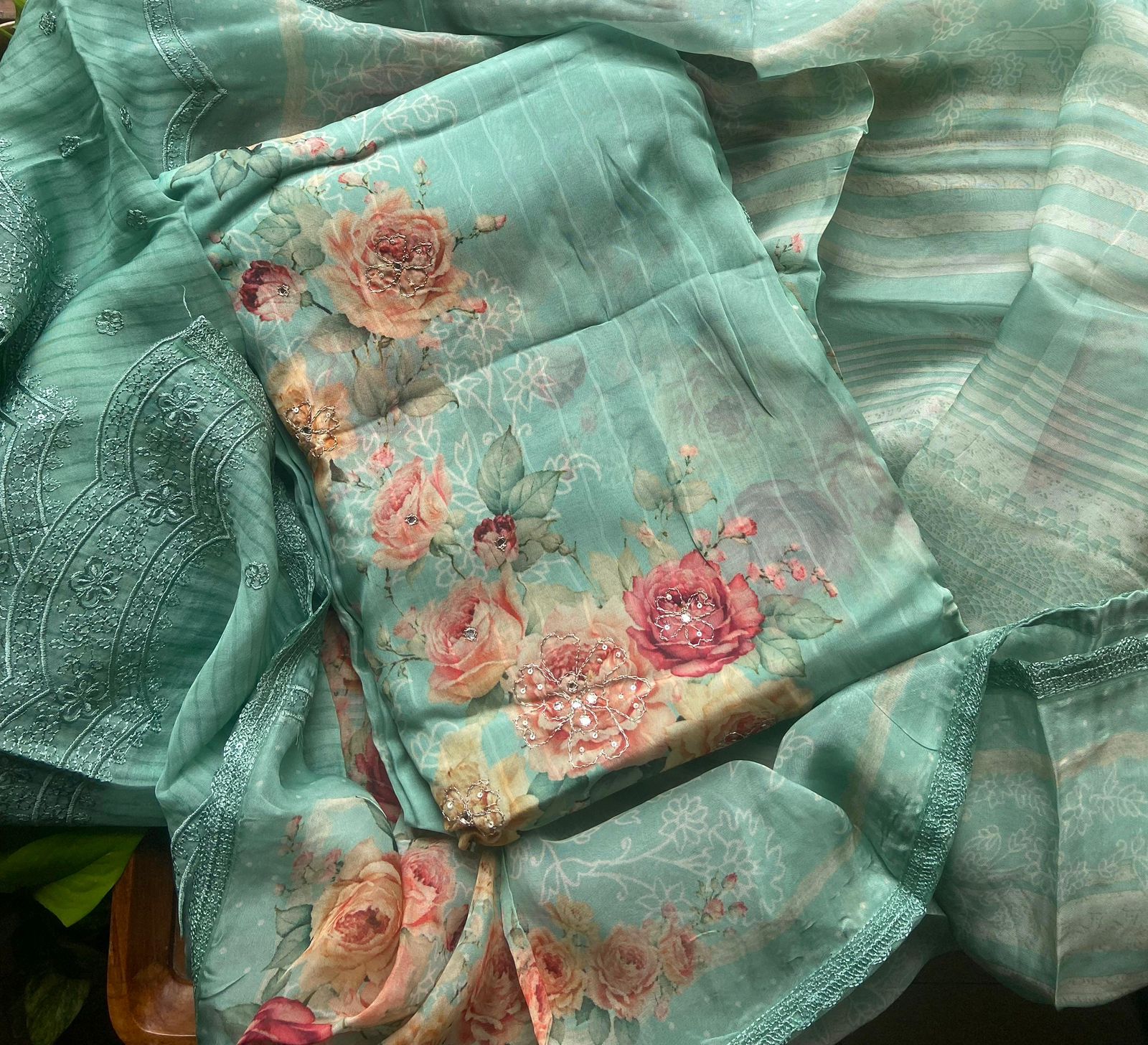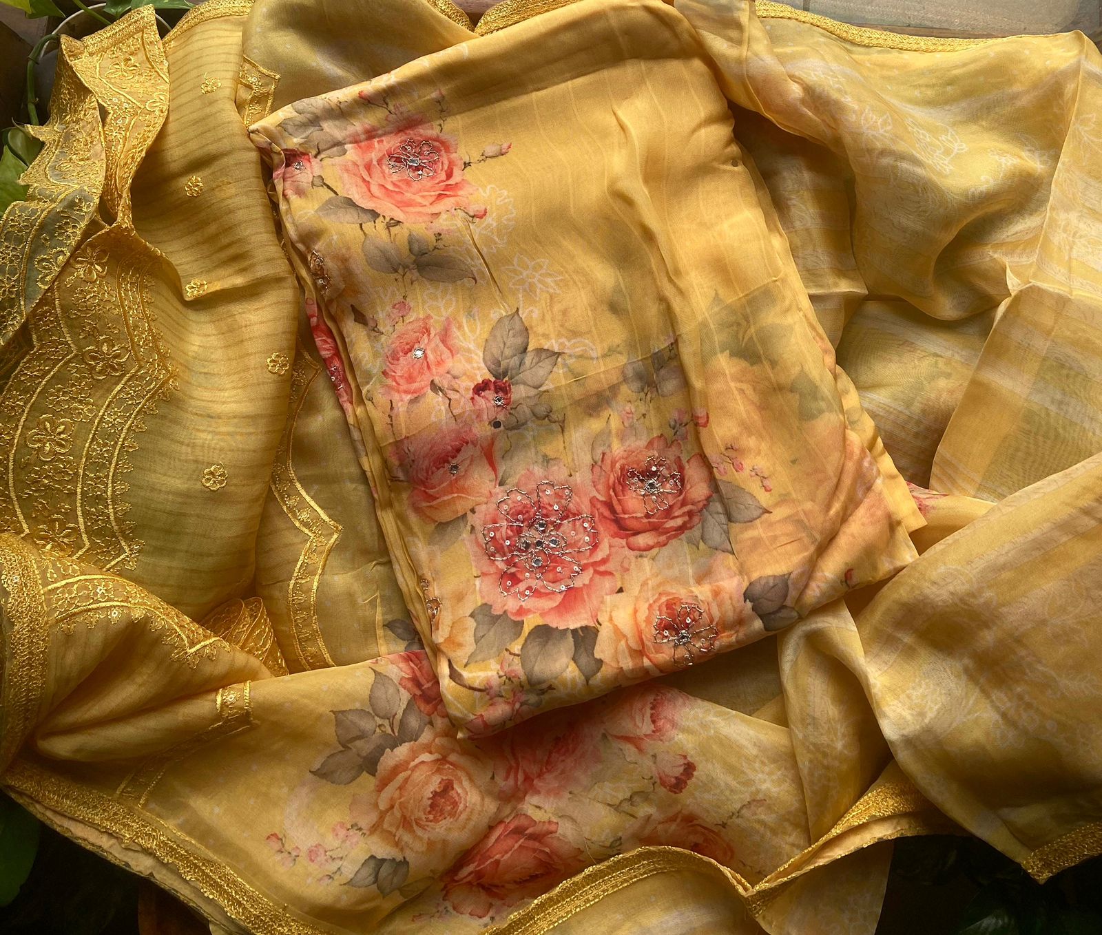 A beautiful premium collection of pure organzas with intricate floral prints !!! Beautiful florals you will not find elsewhere with deluxate embroidery ensures a super stylish attire!!! pure organza top & Duppatta with ethereal floral prints & embroidery & santoon botton