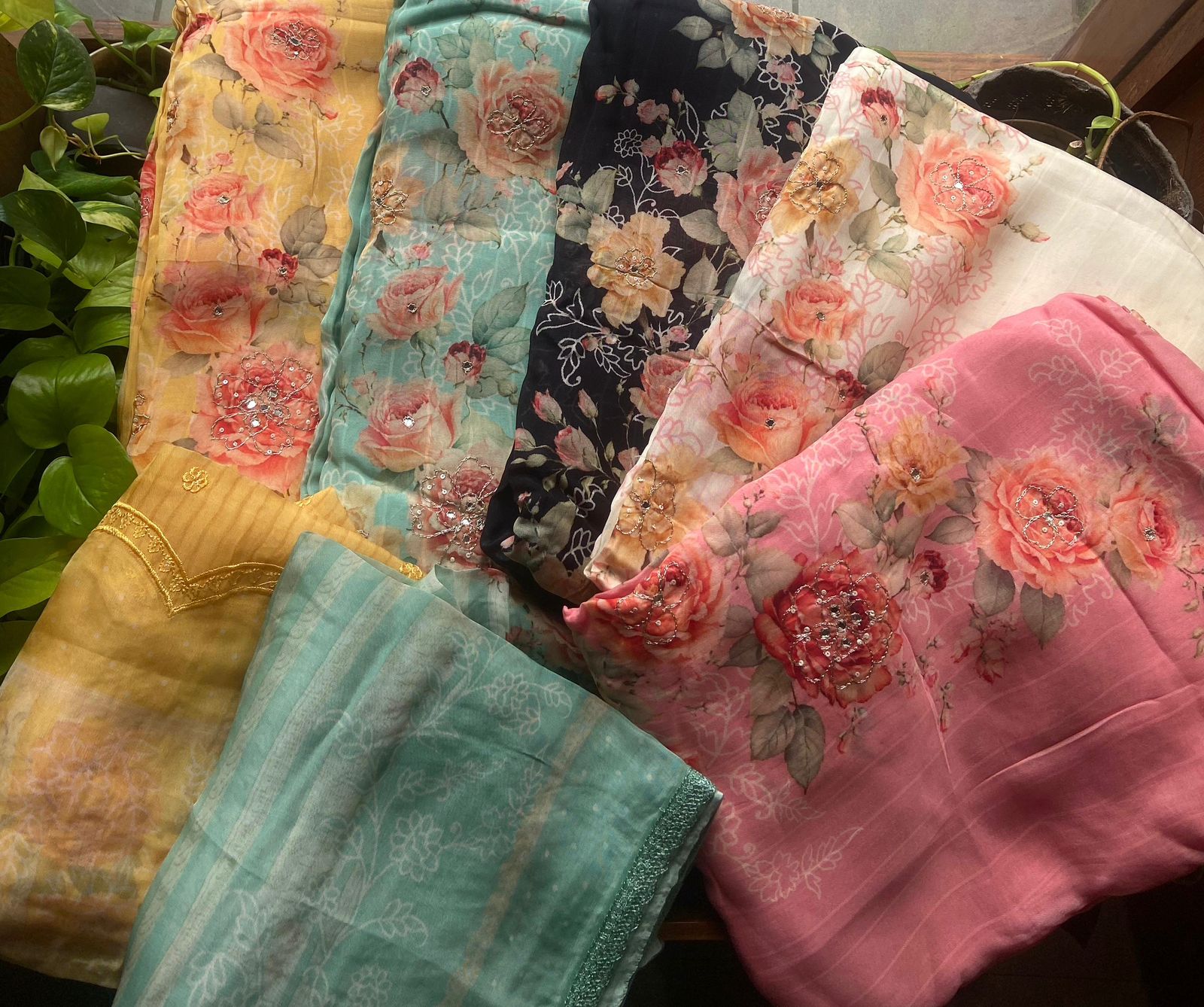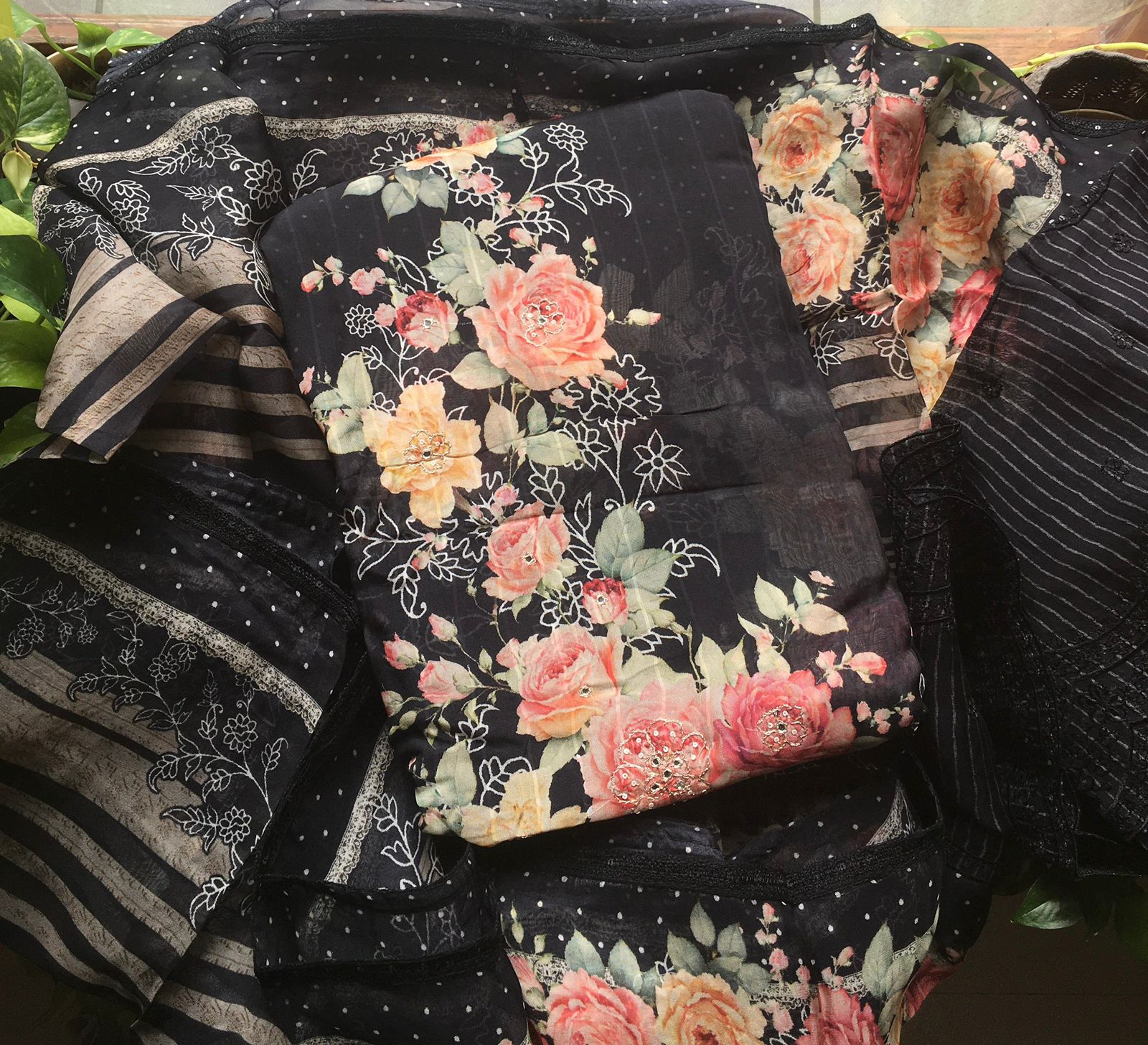 Are you looking out for Beautiful Floral Suits to add to your wardrobe ? These beautiful Tissue Silk Suits are the perfect choice ! Pure tissue silk top & Duppatta with gorgeous floral prints & Zari embroidery detailing & santoon bottom