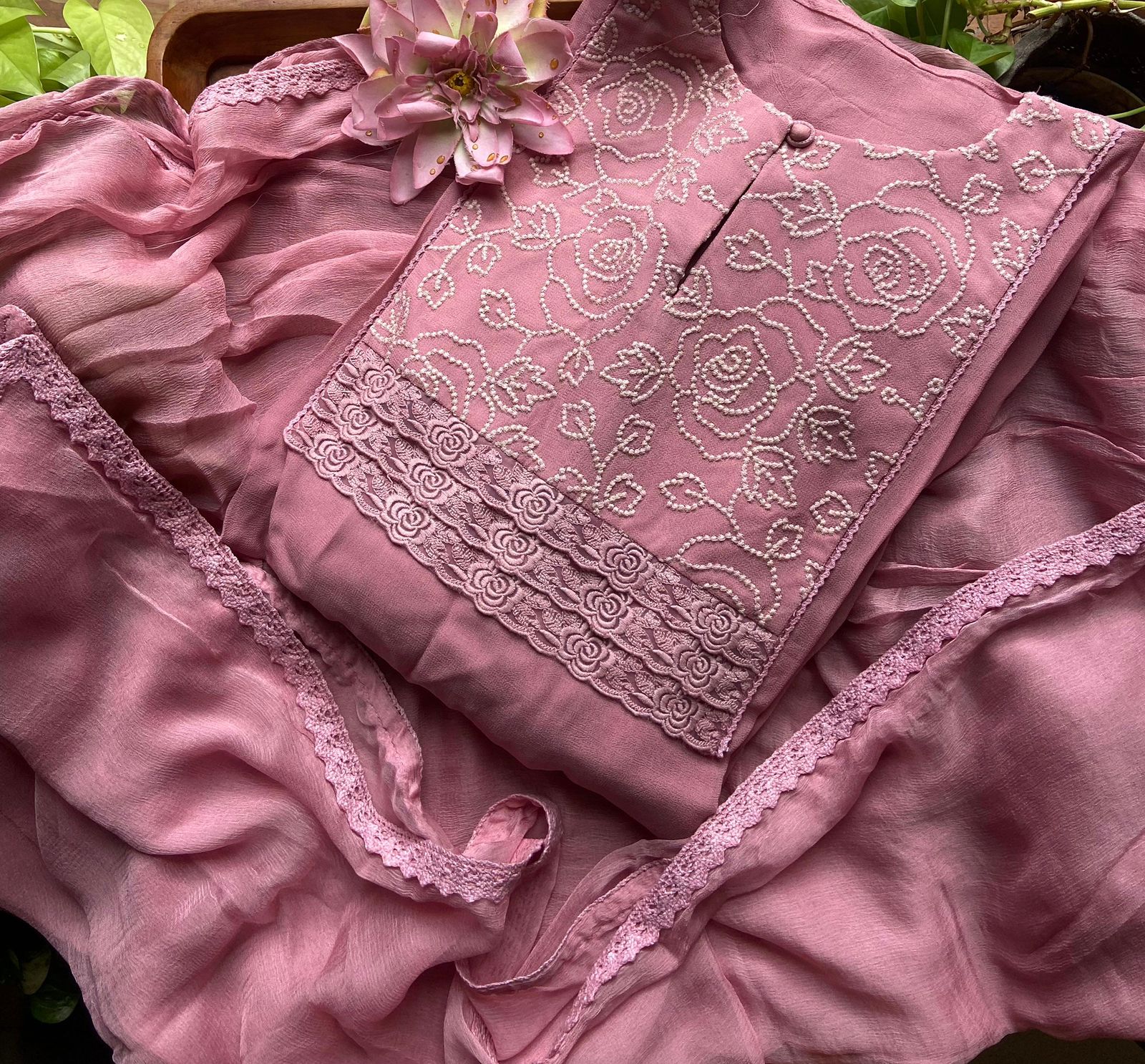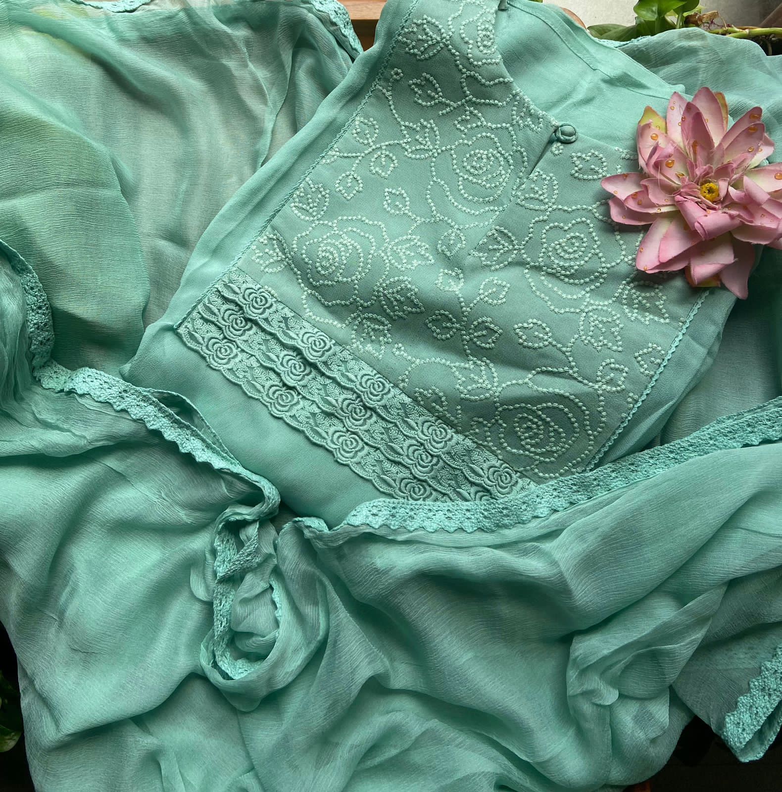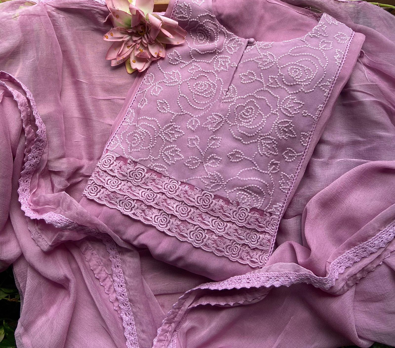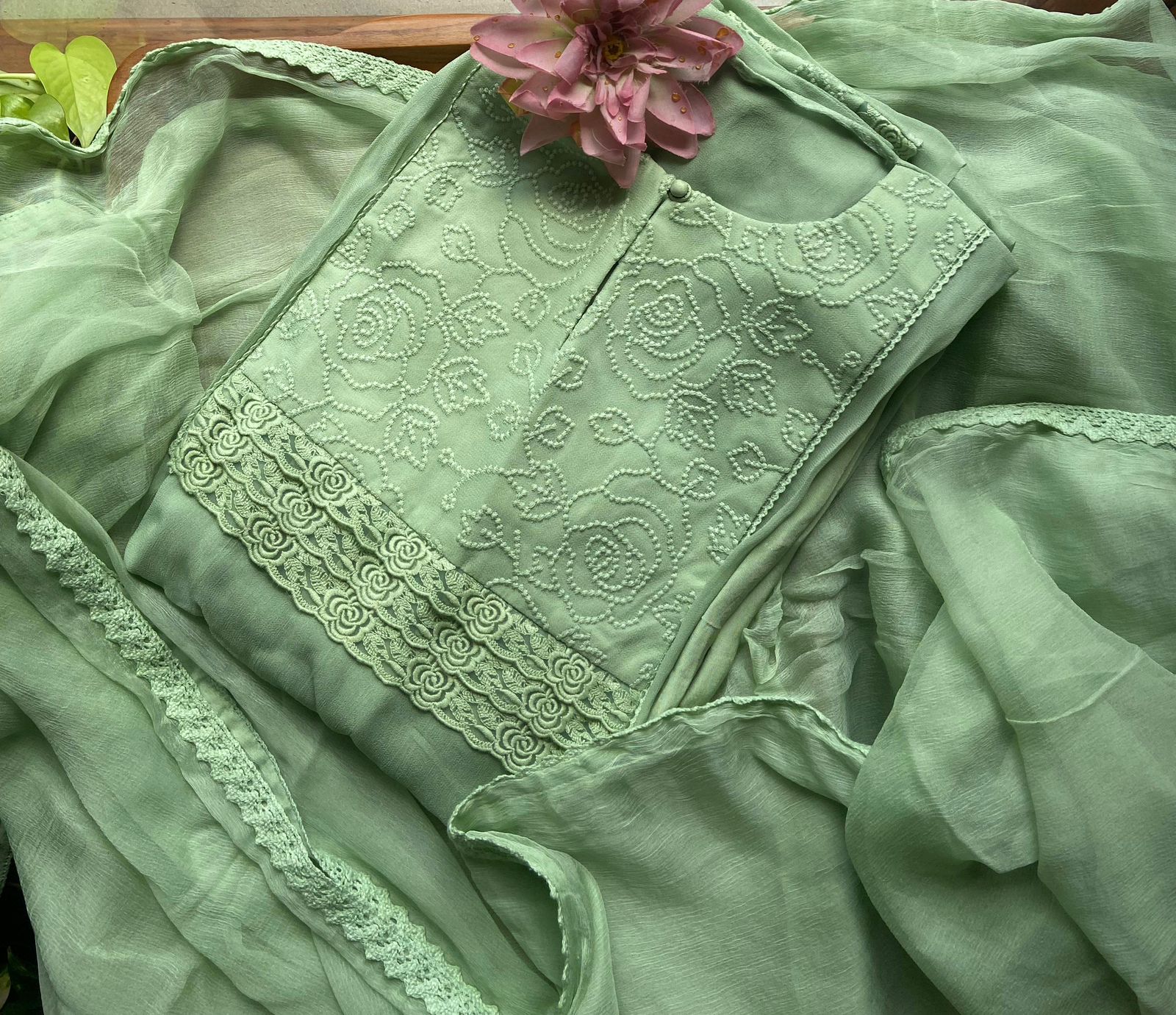 Presenting out Brand New Collection for Onam at a Special Price of ₹1499/- curated on Chiffon woth Cutwork and beautiful floral embroidery! Ethereal hues of Pink, Pearl Green, Ivory gold, Dusty pink & Jet black on Chiffon top and Duppatta with floral embroidery & Cutwork. The floral embroidery design is created to resemble pearl embroidery. Bottom is cotton silk