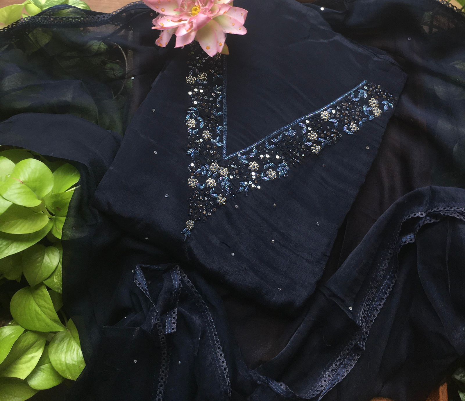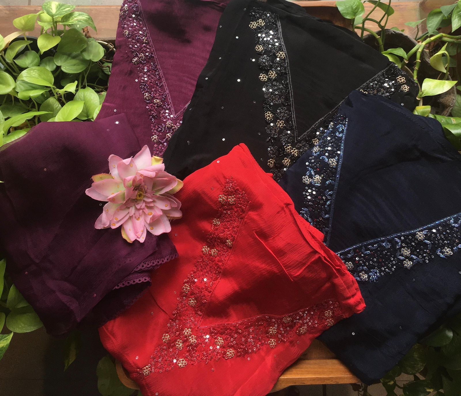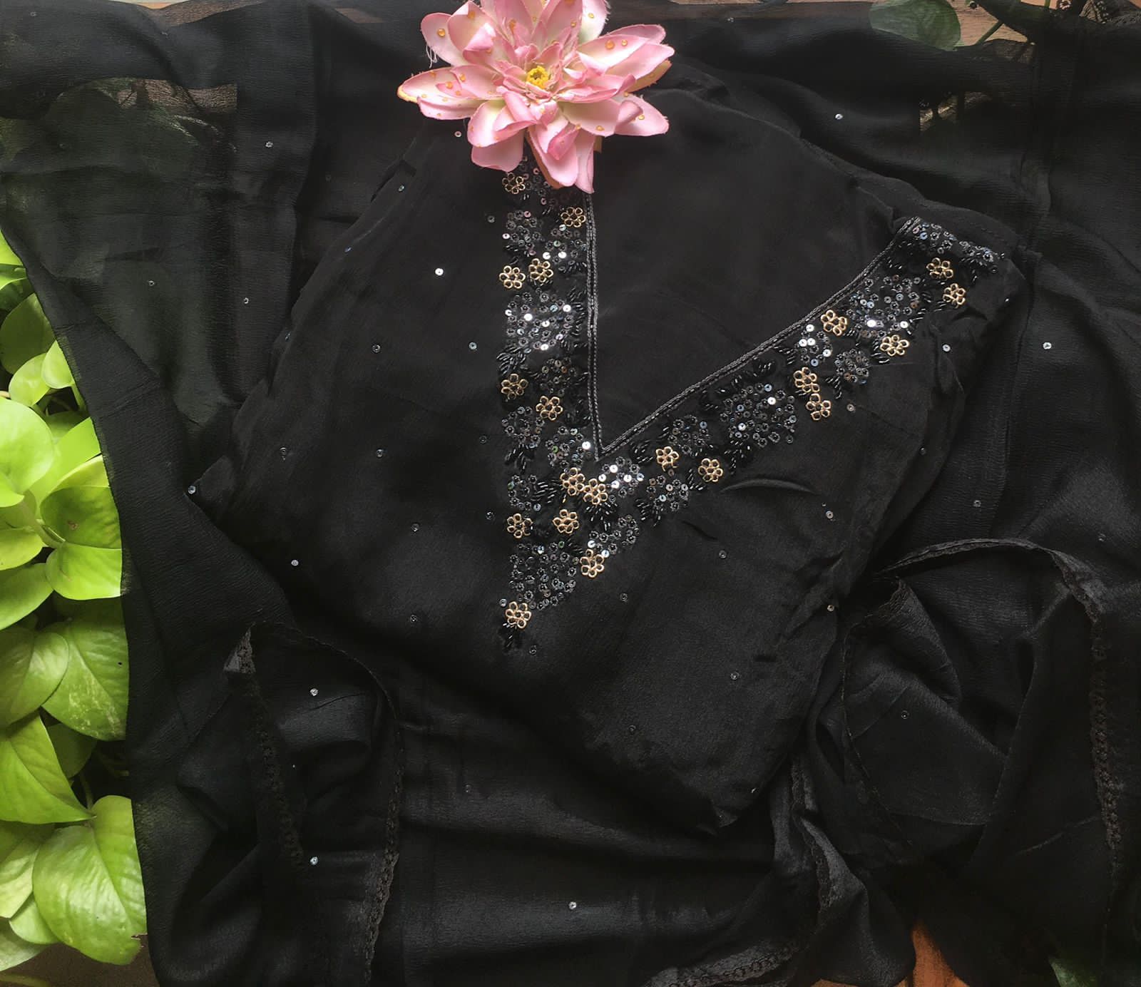 Presenting out Brand New Collection for Onam at a Special Price of ₹1499/- curated on Chiffon woth Cutwork and beautiful floral embroidery! Ethereal hues of Pink, Pearl Green, Ivory gold, Dusty pink & Jet black on Chiffon top and Duppatta with floral embroidery & Cutwork. The floral embroidery design is created to resemble pearl embroidery. Bottom is cotton silk