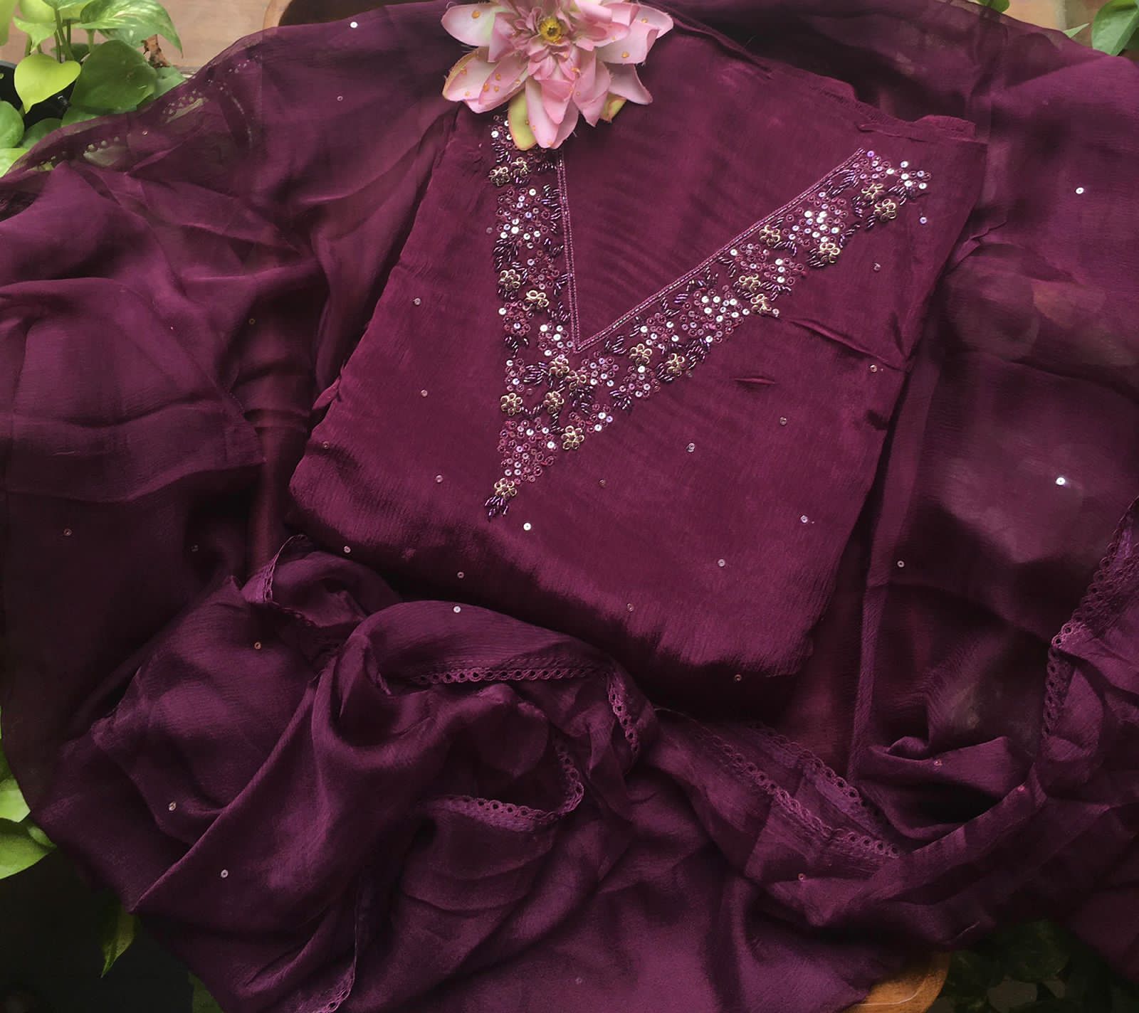 A beautiful Designer Wear Collection in Georgette with gorgeous Chikankari embroidery featuring a contemporary Paisley motif on top & Duppatta & tiny scalloped borders for detailing. Cotton silk bottom.