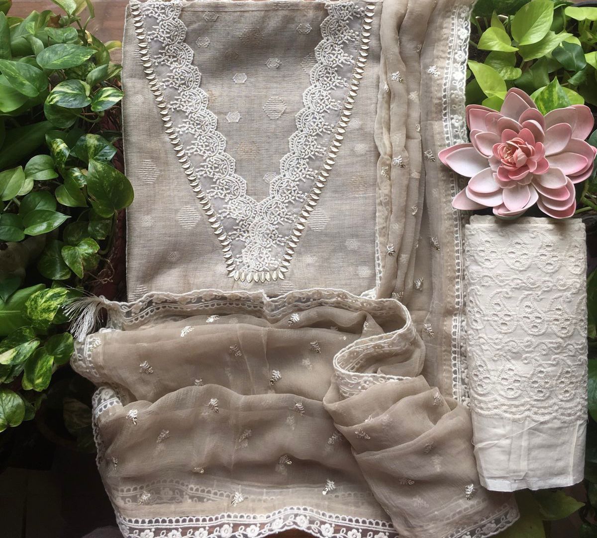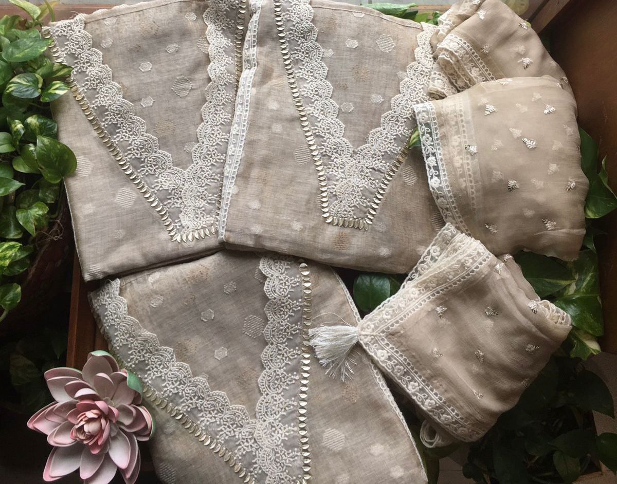 HomeSalwar Set A beautiful & unique collection in ethereal Ivory Sandal tint in premium Benarasi Chandheri silk top with Jamdhani hand weaving , trending V neck with French lace detailing & hand embroidery, pure chiffon embroidered duppatta with French lace borders. Hakoba cotton bottom