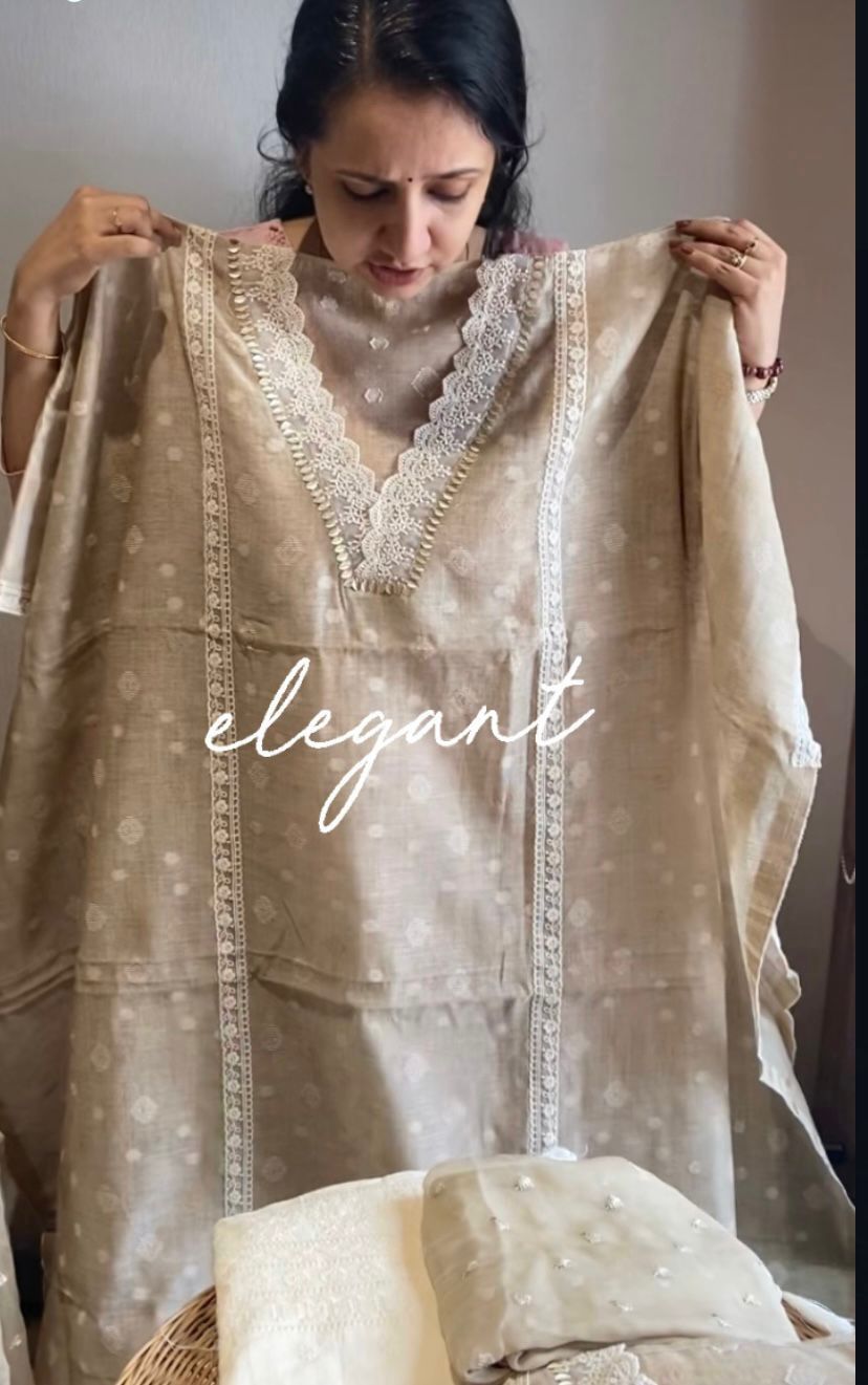 A beautiful collection in pure linen top and Duppatta with silver Zari borders & exquisite hand embroidery & cotton bottom