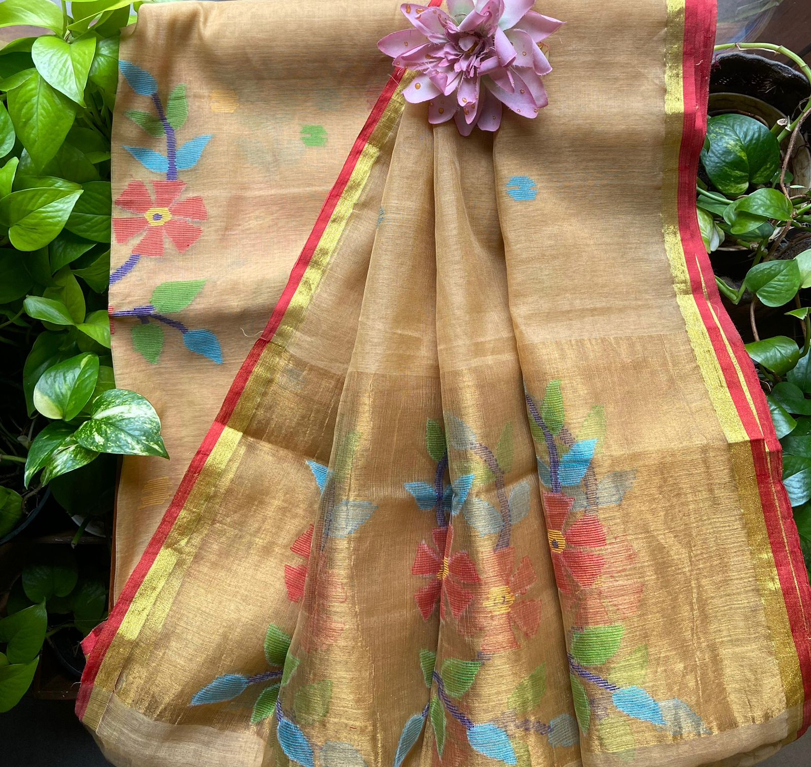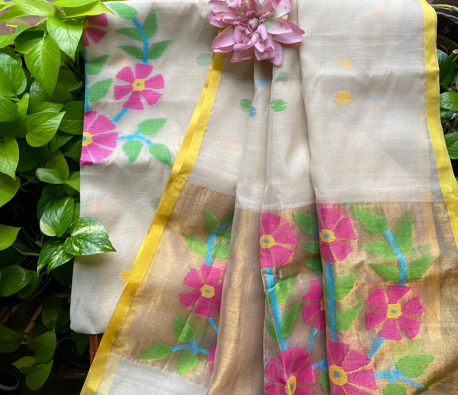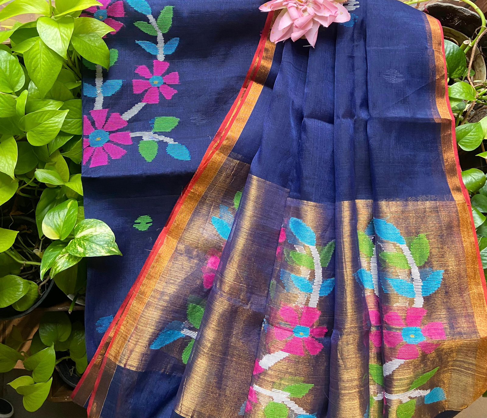 A beautiful collection of Tussar silk sarees with very elegant check weaving on entire saree & borders finished with beautiful cross stitch reminiscent floral embroidery. With blouse pure Benarasi silk