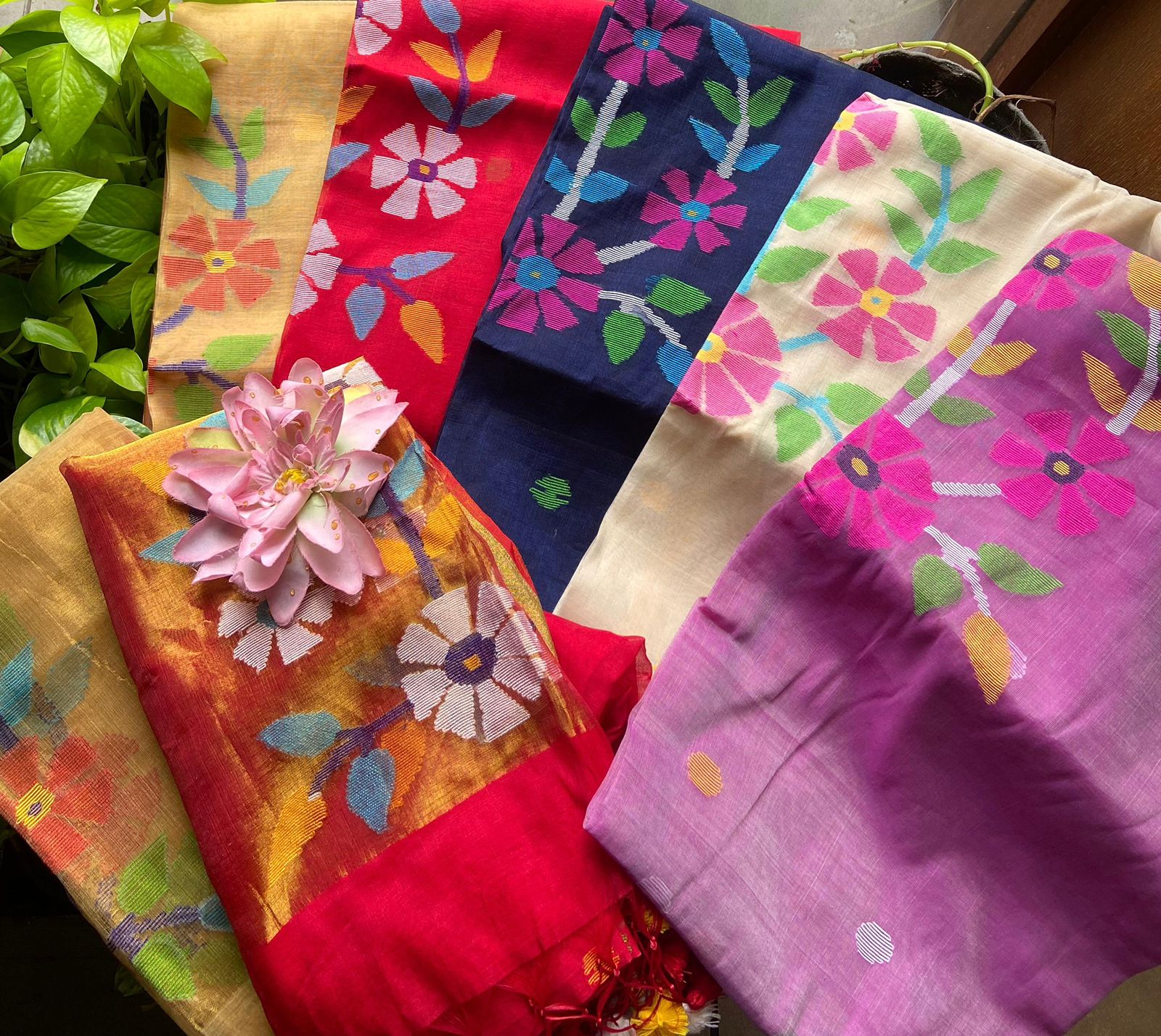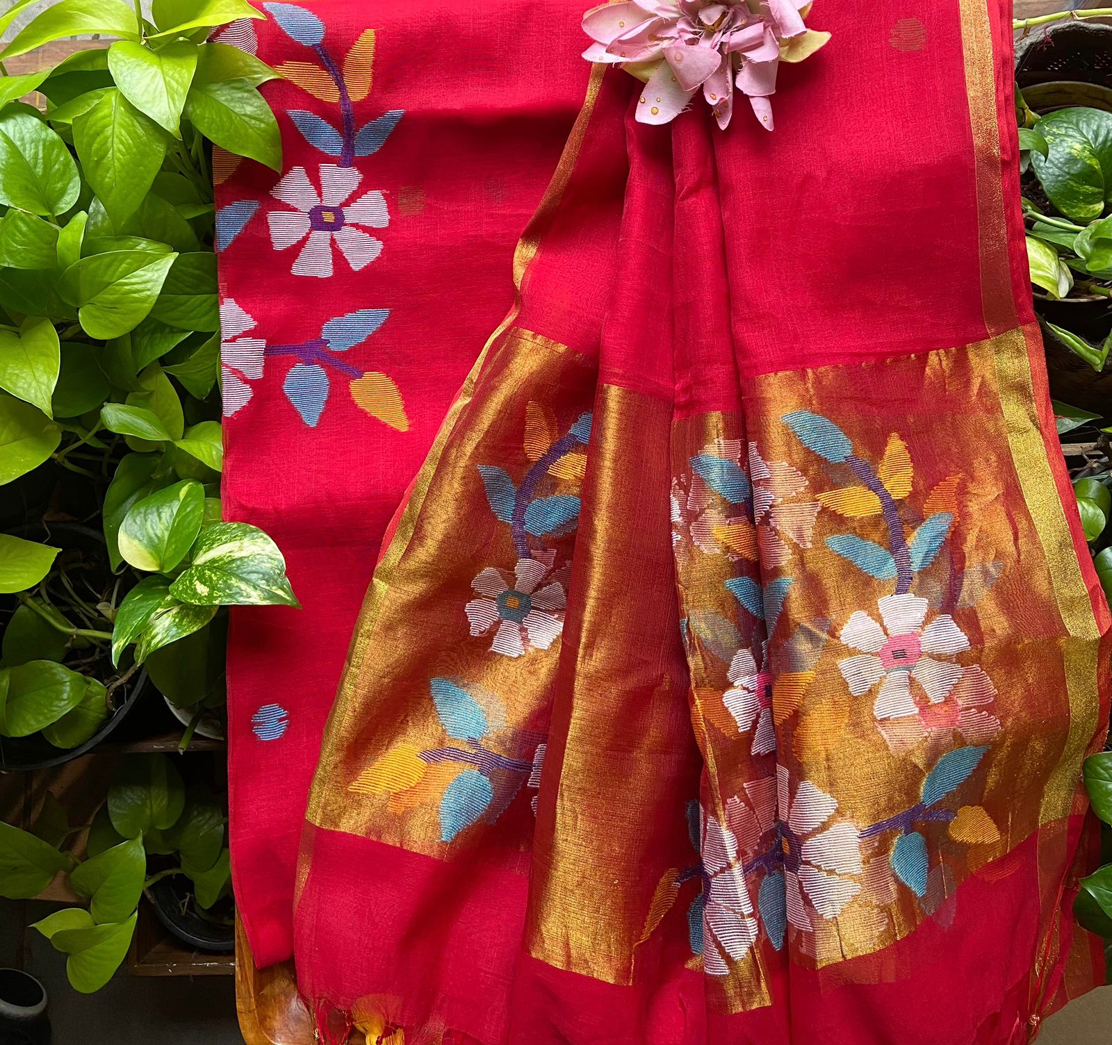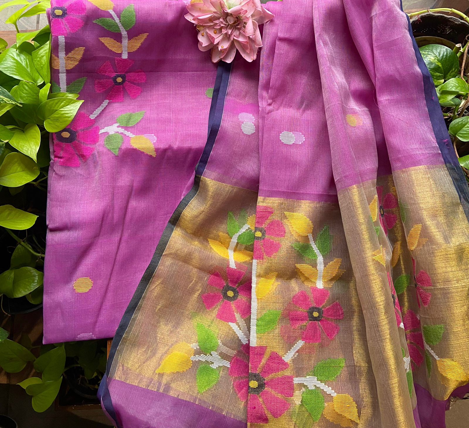 A beautiful collection of Tussar silk sarees with very elegant check weaving on entire saree & borders finished with beautiful cross stitch reminiscent floral embroidery. With blouse pure Benarasi silk