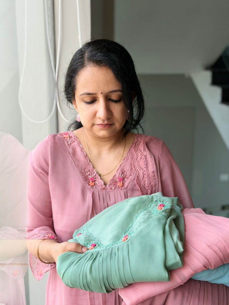 • Presenting out Brand New Collection for Onam at a Special Price of ₹1499/- curated on Chiffon woth Cutwork and beautiful floral embroidery! Ethereal hues of Pink, Pearl Green, Ivory gold, Dusty pink & Jet black on Chiffon top and Duppatta with floral embroidery & Cutwork. The floral embroidery design is created to resemble pearl embroidery. Bottom is cotton silk ₹1,499.00