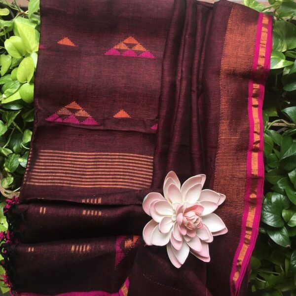 A beautiful collection of Tussar silk sarees with very elegant check weaving on entire saree & borders finished with beautiful cross stitch reminiscent floral embroidery. With blouse pure Benarasi silk