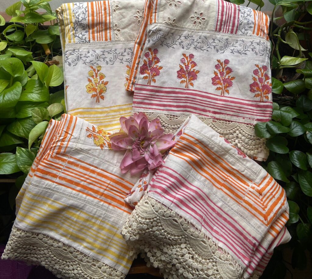 A beautiful collection of Pure cotton top with block prints, Cutwork and French lace detailing , cotton printed bottom and mal Duppatta with French lace borders