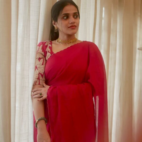 Our Premium Edit in Pure Malai Chandheri Saree with intricate tiny scalloping …The saree is paired with a stunning heavy worked blouse (Unstitched) with complete work on back , front & sleeves with pure tissue appliqué. So excited to bring in this gorgeous saree which speaks of Ornate grandeur & sustainable fashion as this beautiful saree is entirely dyeable to the color of your choice. (Please stitch with santoon lining