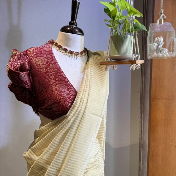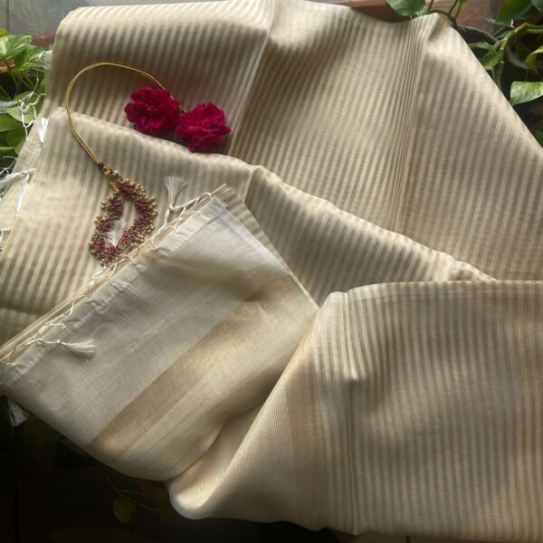 Our Beautiful Onam Edit in Chandheri Silk with stunning Stripe Benarasi Weaving Saree !!! With blouse thin stripes. The vertical stripes assures a taller & leaner appearance on draping. The displayed blouse is done additionally & only for display )