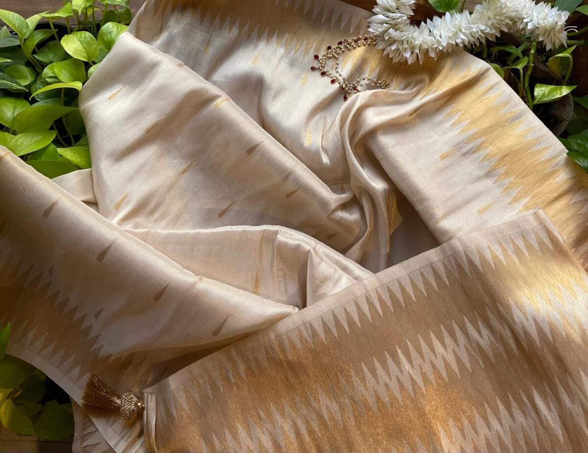 Presenting our beautiful new Onam collection in a stunning Benarasi tissue saree with a gorgeous hand woven temple border in double weaving of antique gold & Silver ! With blouse with borders.