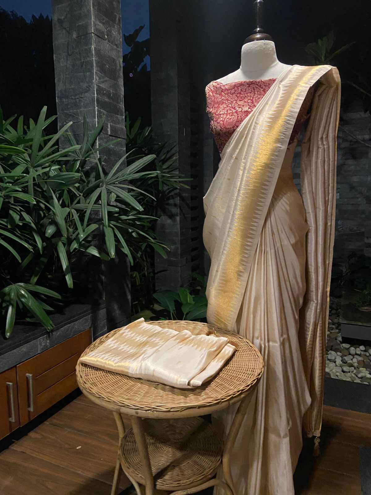 A stunningly beautiful Benarasi tissue saree with contemporary lightning weave & a gorgeous blouse with same borders & pallav .The ethereal antique Ivory Gold hue of the saree creates a beautiful drape once worn ensuring you steal the show this Onam !