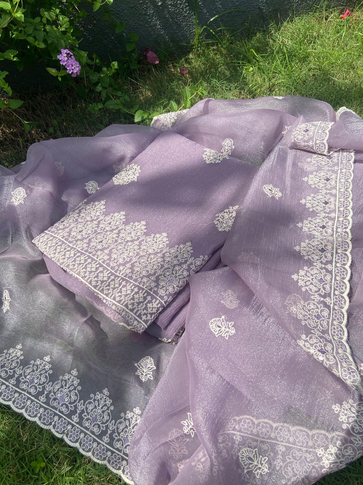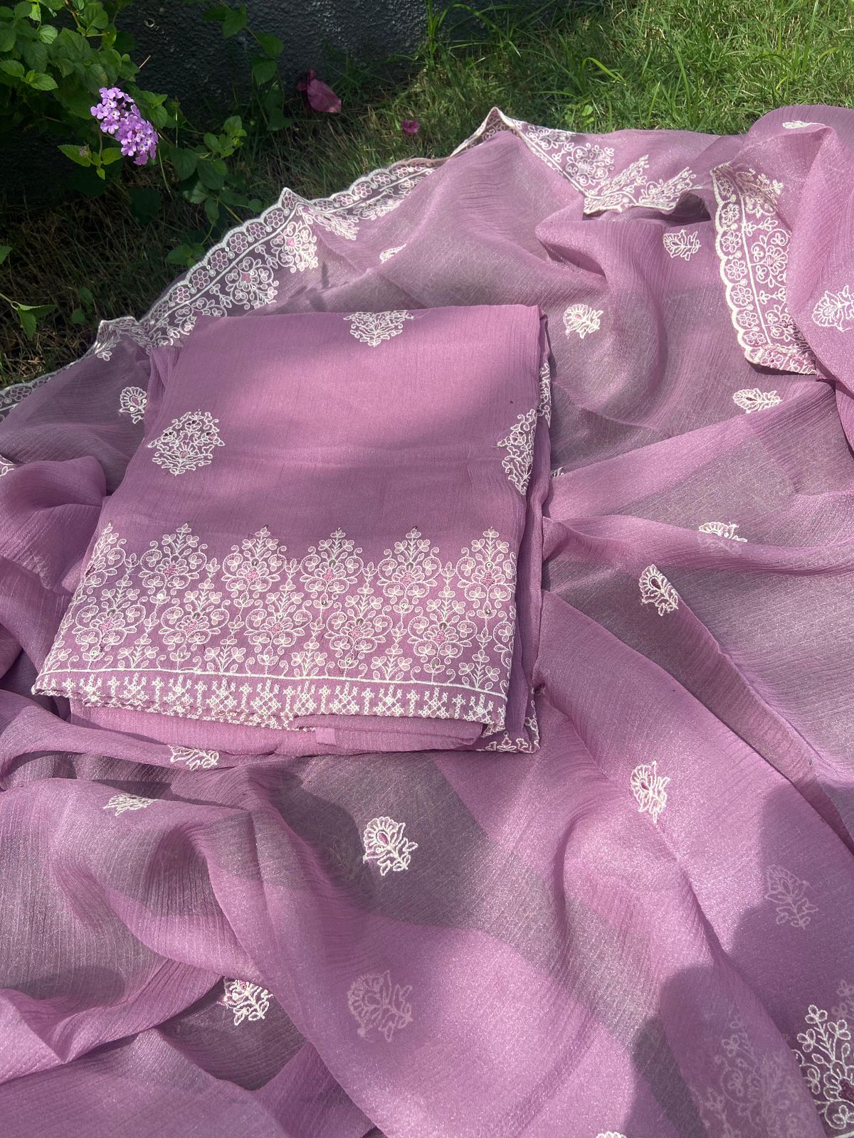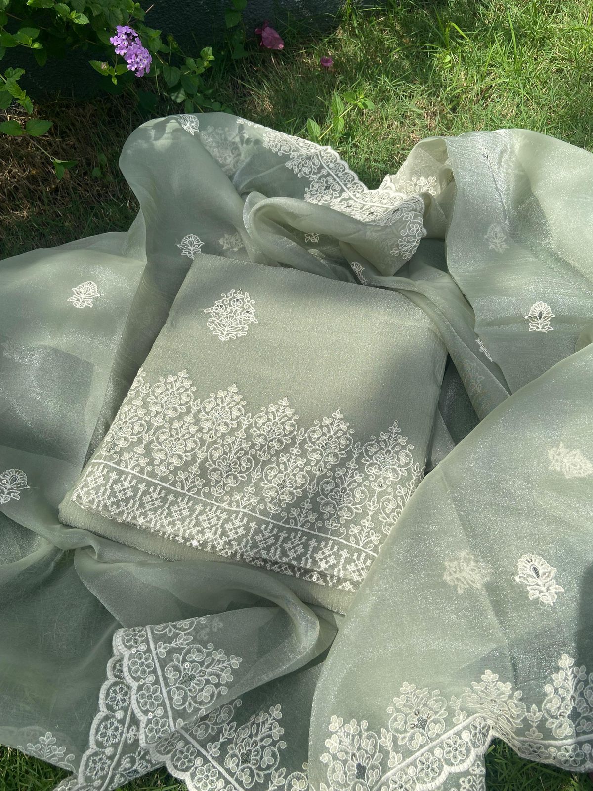 A beautiful Designer Wear Collection in Georgette with gorgeous Chikankari embroidery featuring a contemporary Paisley motif on top & Duppatta & tiny scalloped borders for detailing. Cotton silk bottom.
